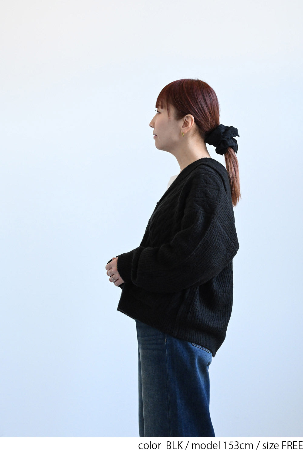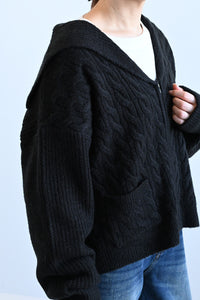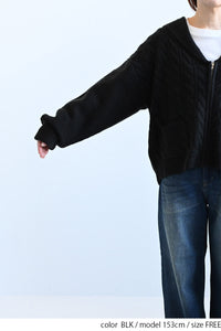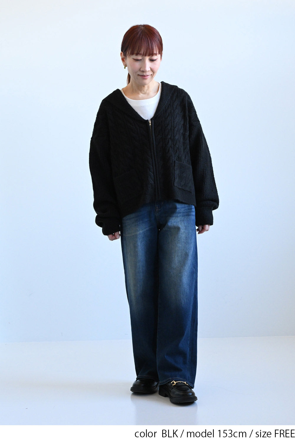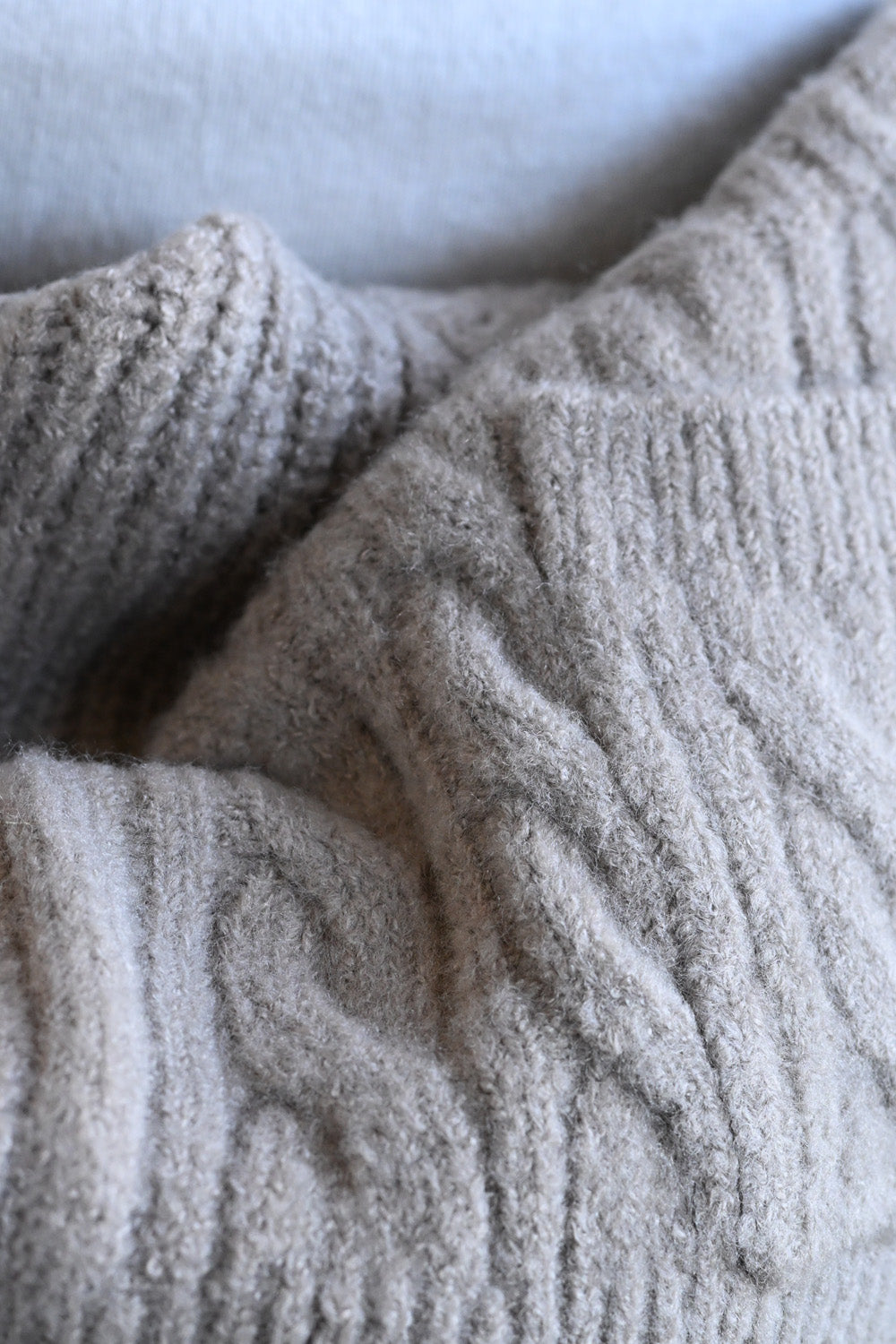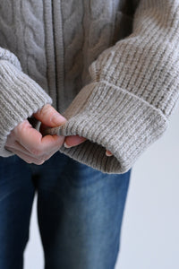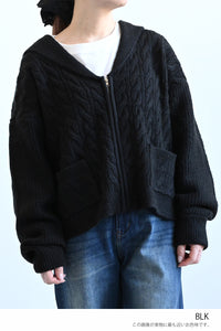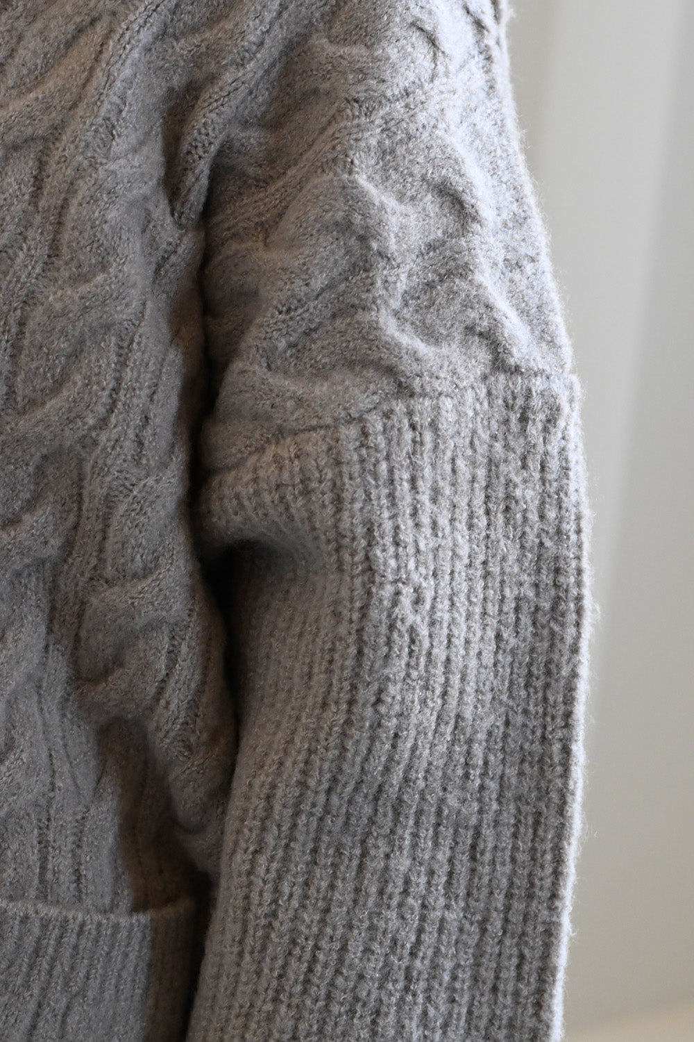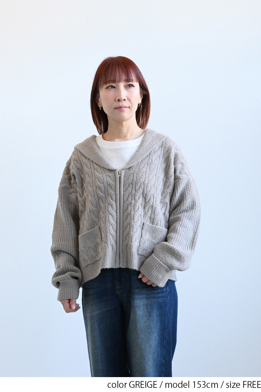 フロント部分にはケーブル編みを施し、シンプルな中にも立体感と表情をプラス。
