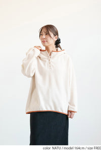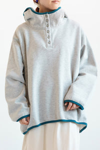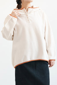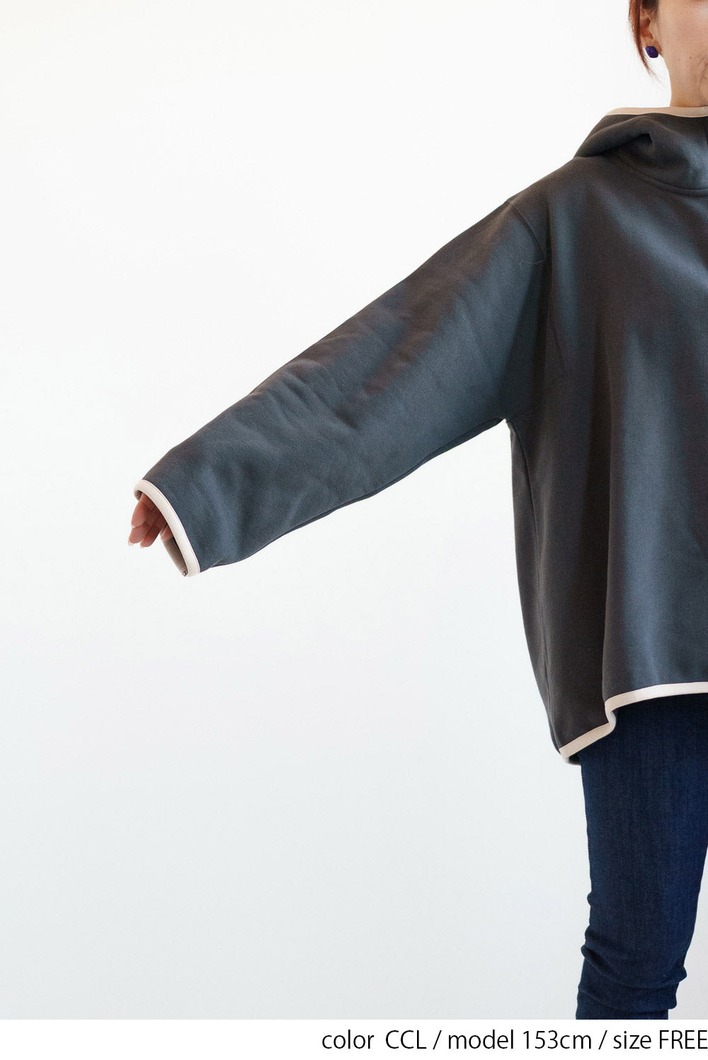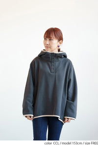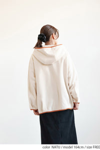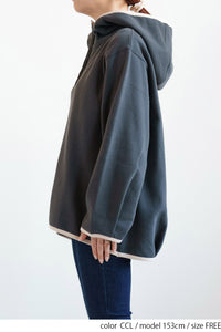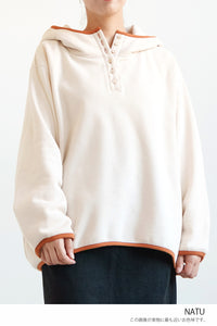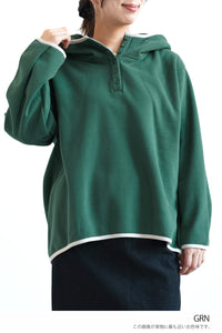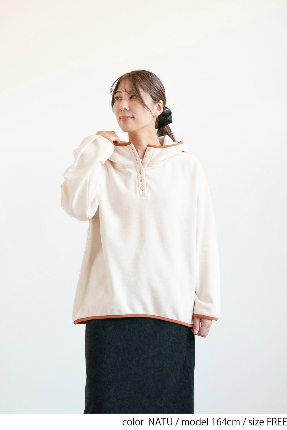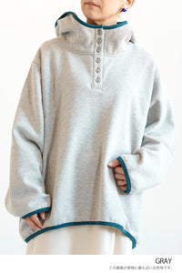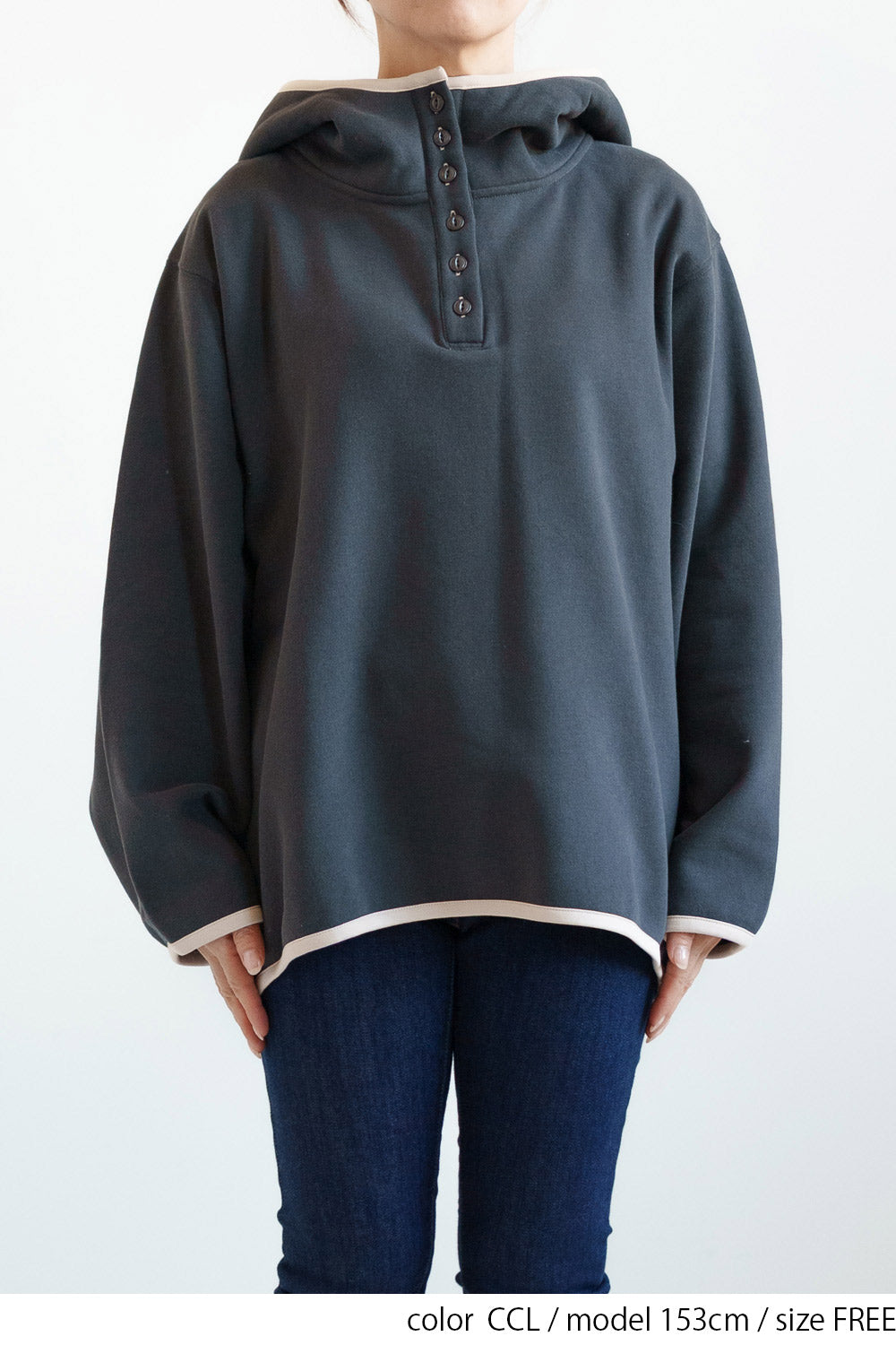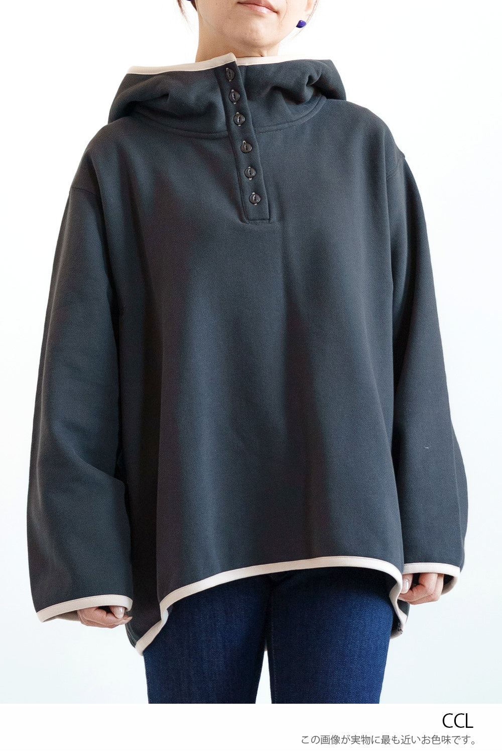 配色パイピングが効いたハーフボタン仕様の裏起毛パーカー。