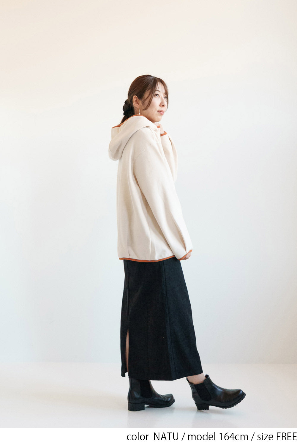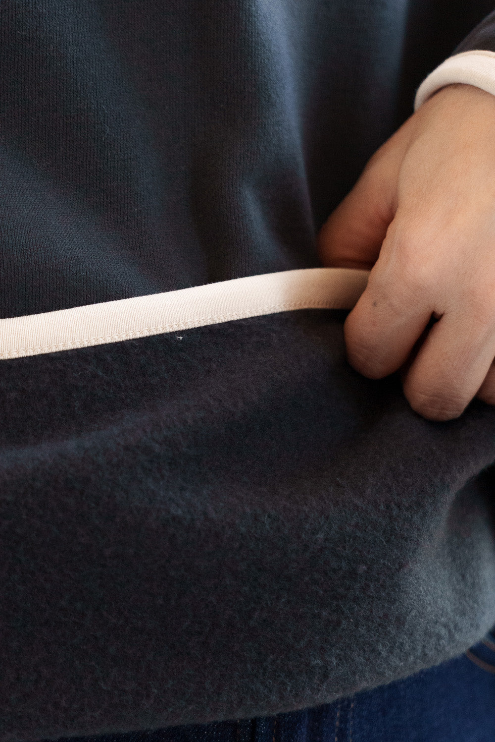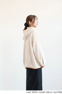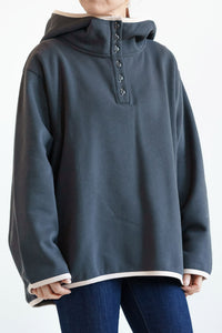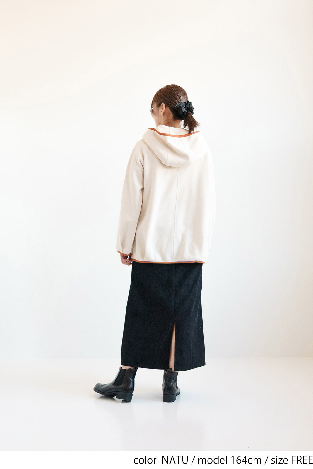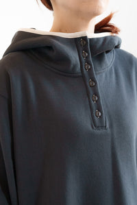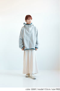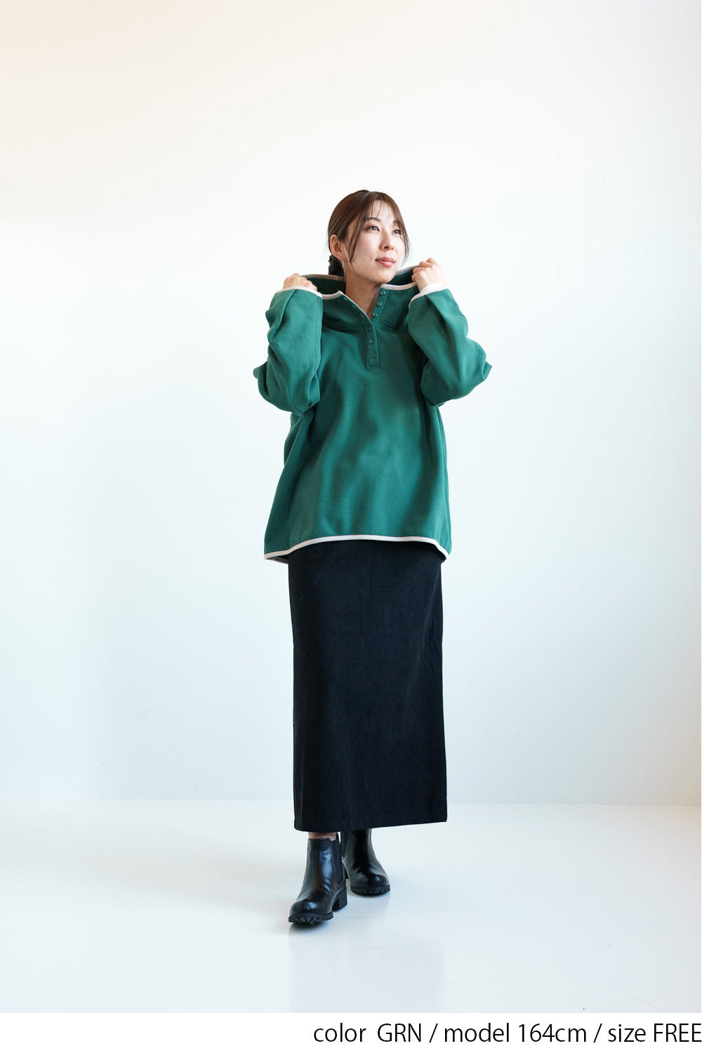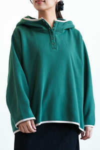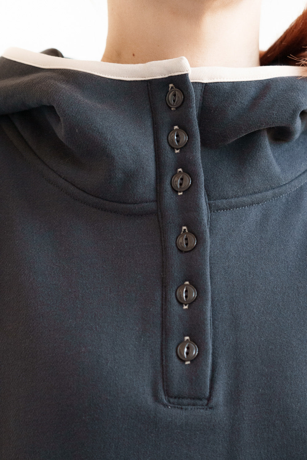 配色パイピングが効いたハーフボタン仕様の裏起毛パーカー。