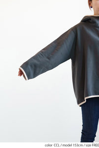 首元はハーフボタンデザインで、ボタンの開け閉めによって印象を変えられるのがポイント。