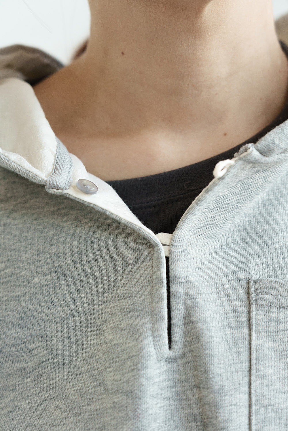 襟ぐりのボタンは開閉が可能で、レイヤードの印象を変えられるのが魅力です。