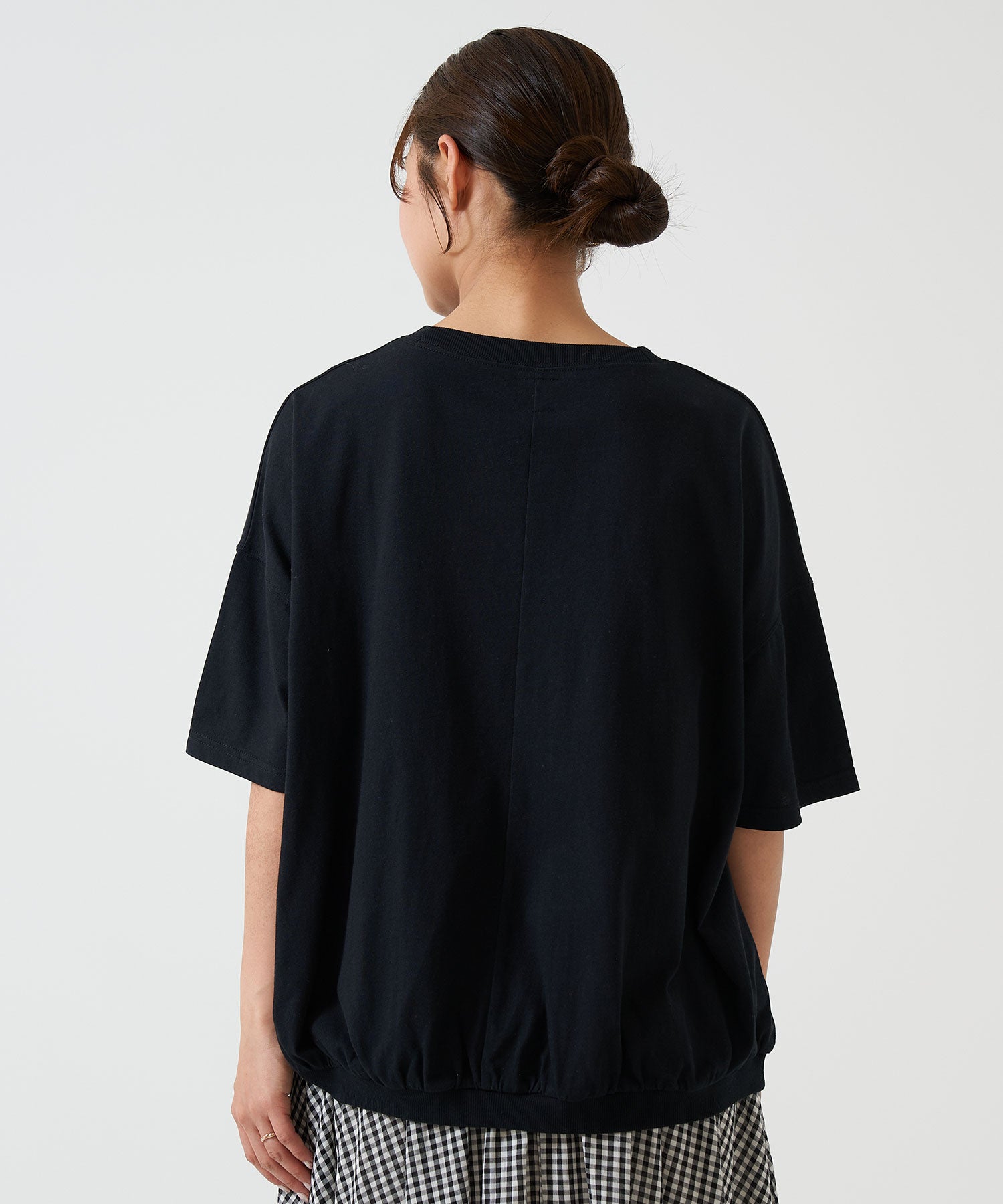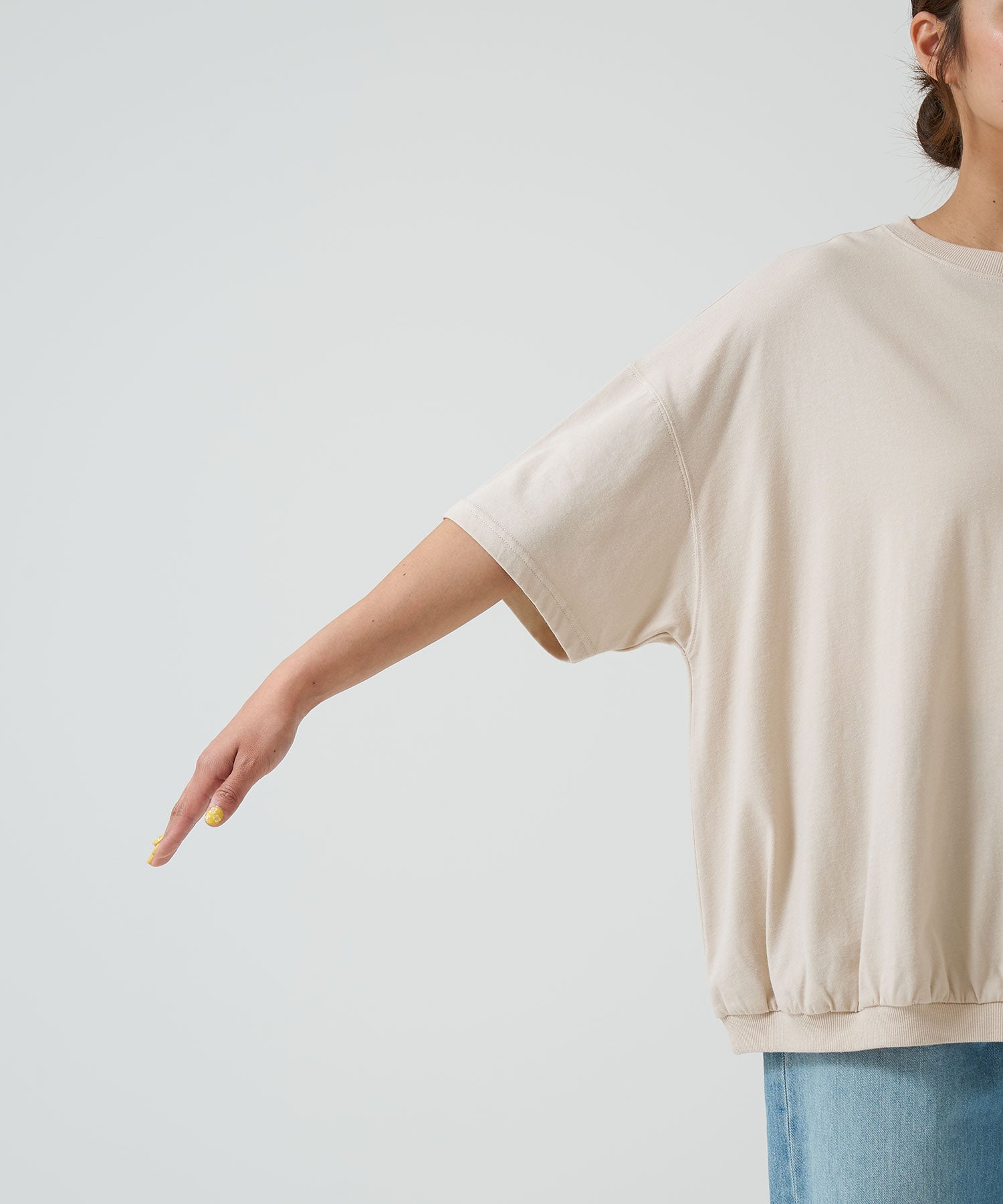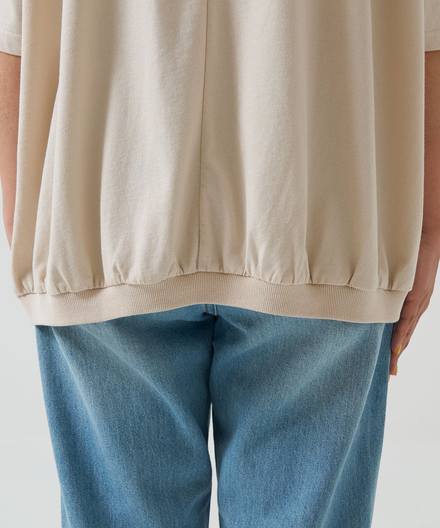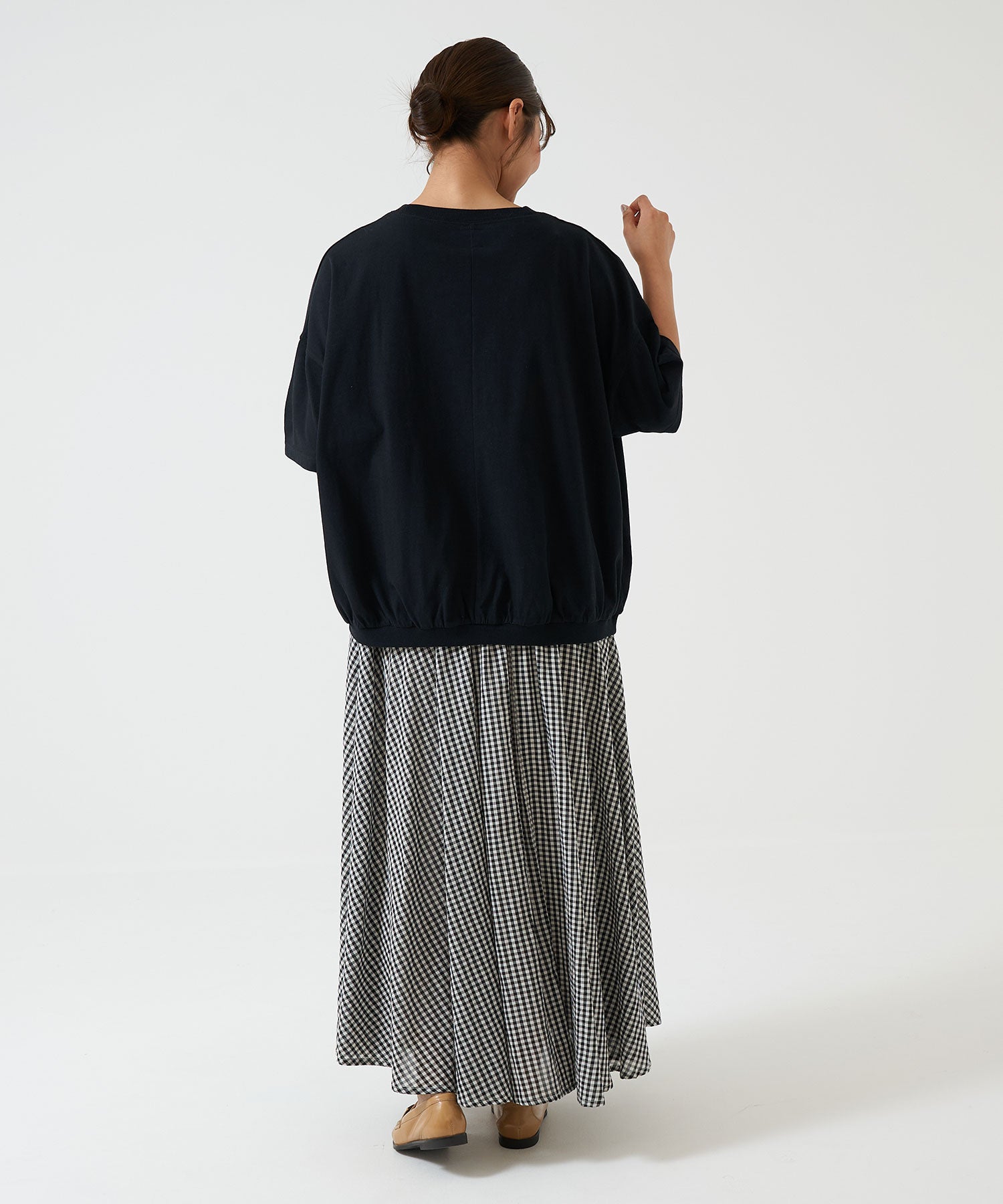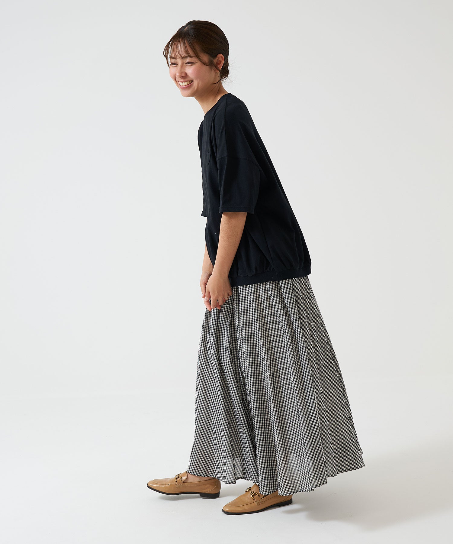 裾のギャザーがあることで、ボリュームのあるスカートに合わせても上半身がまとまりやすくなっています。