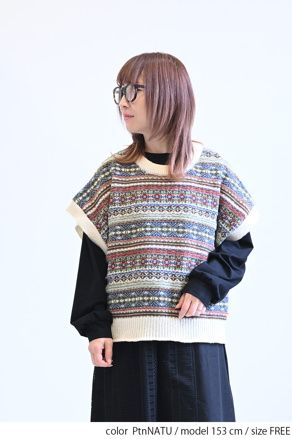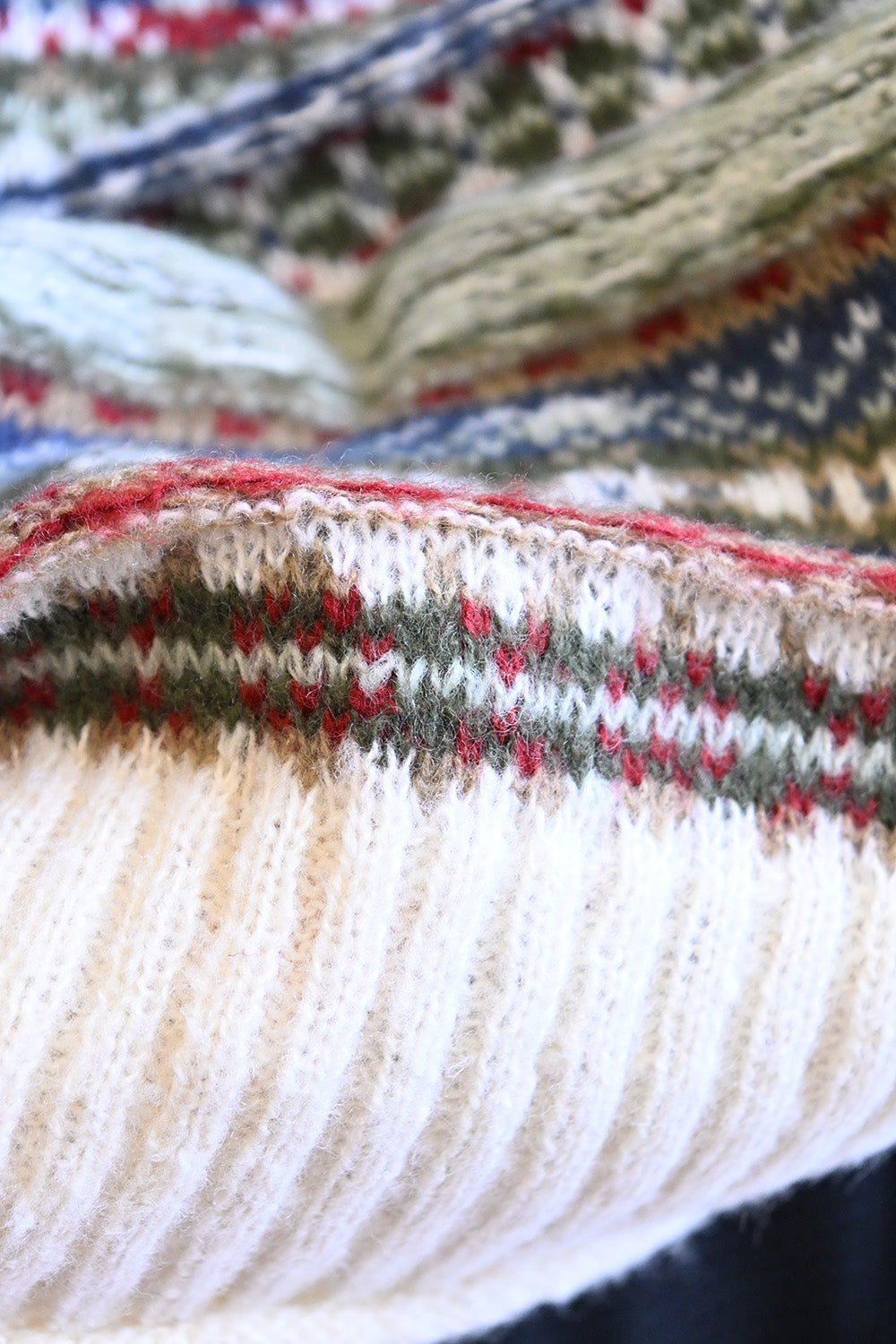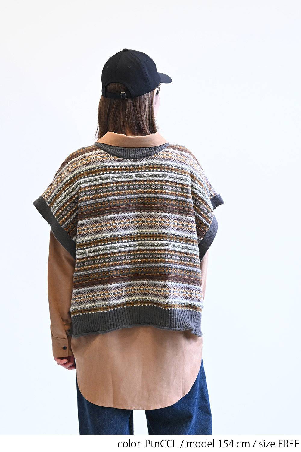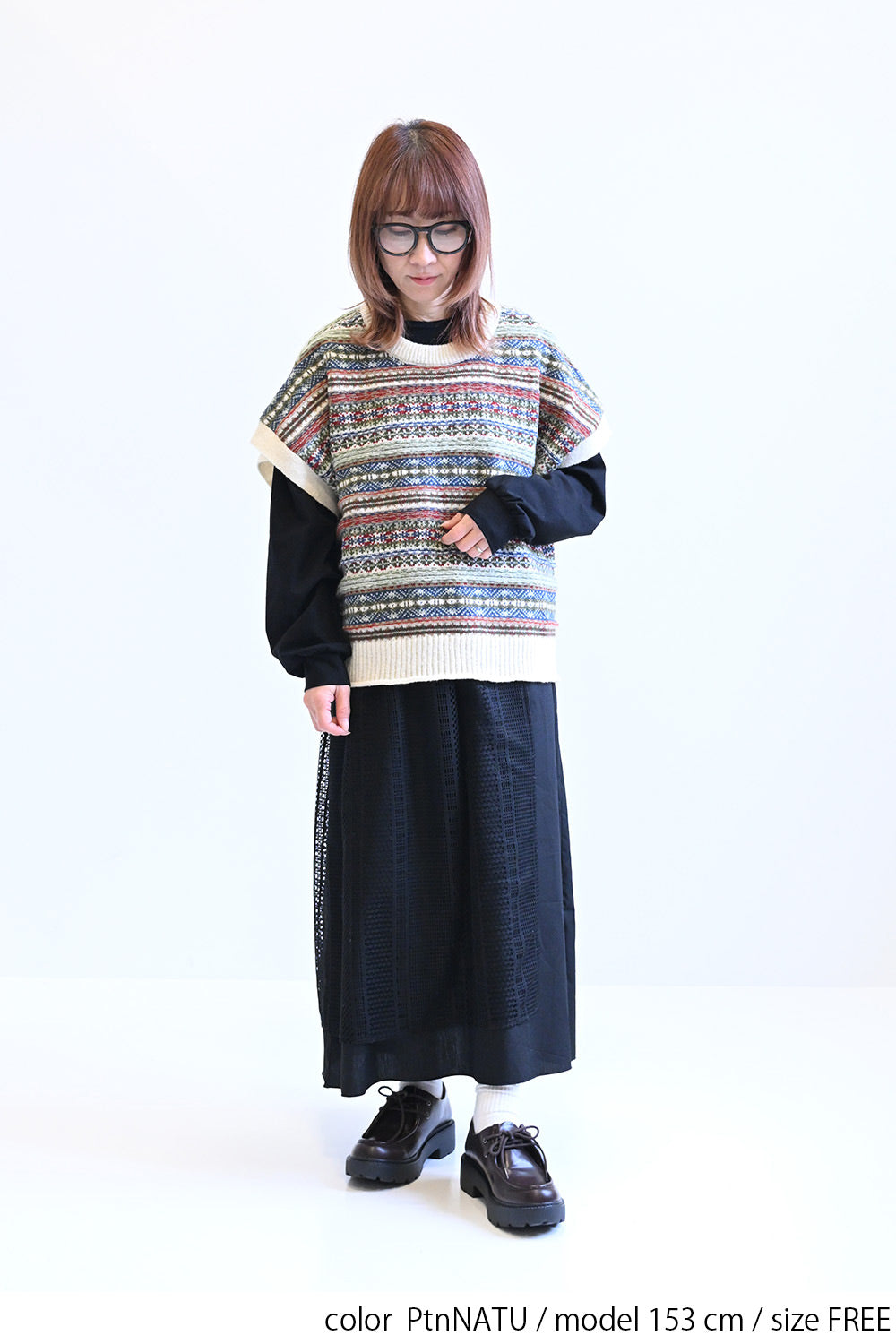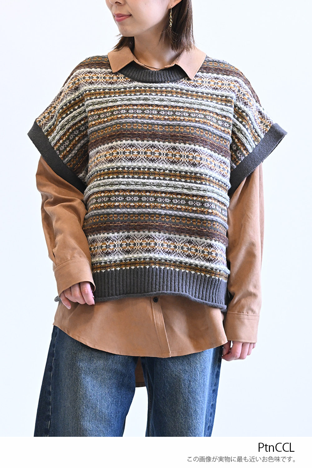 幾何学模様を組み合わせたノルディック柄がアクセントになり、シンプルなコーデに重ねるだけで季節感のあるスタイルに。