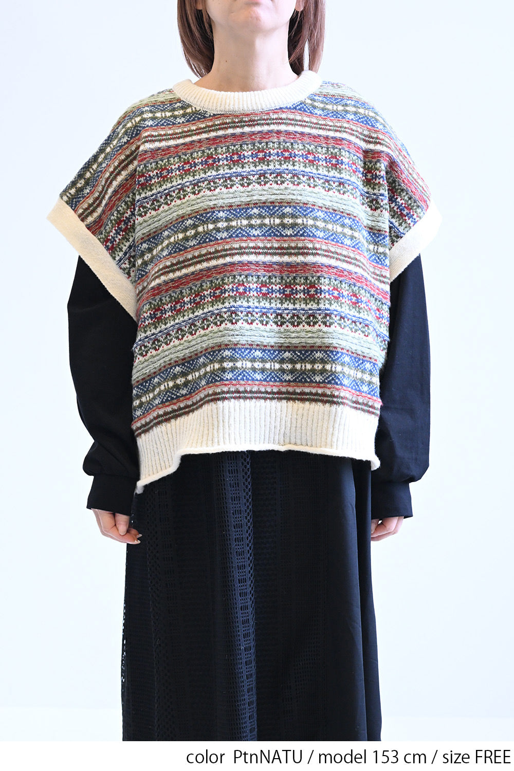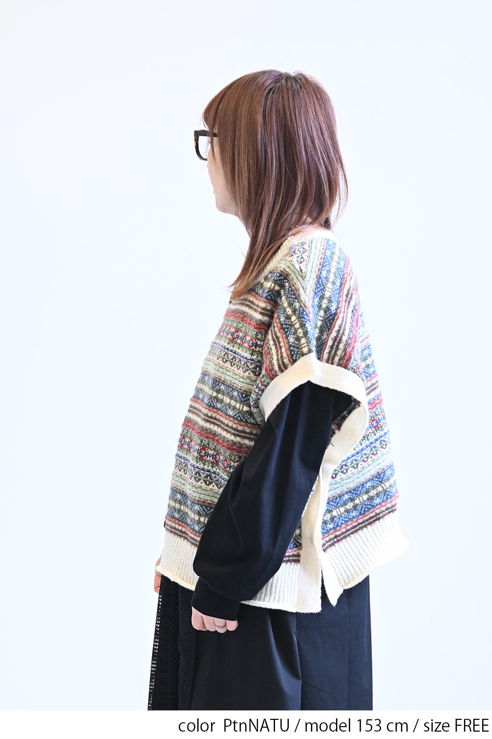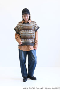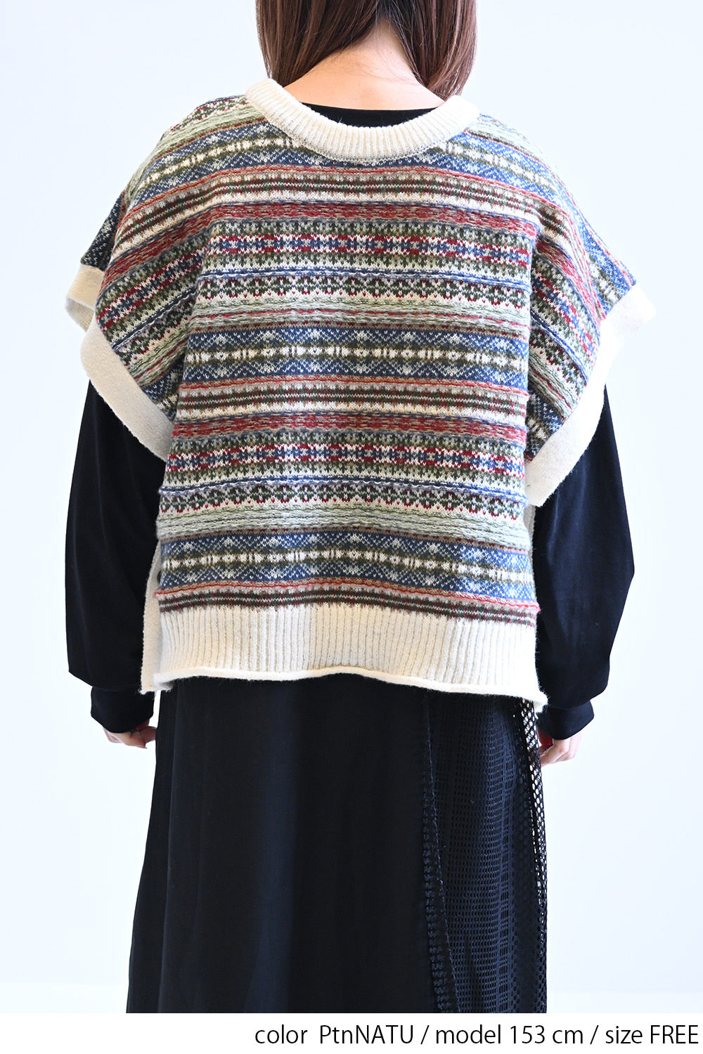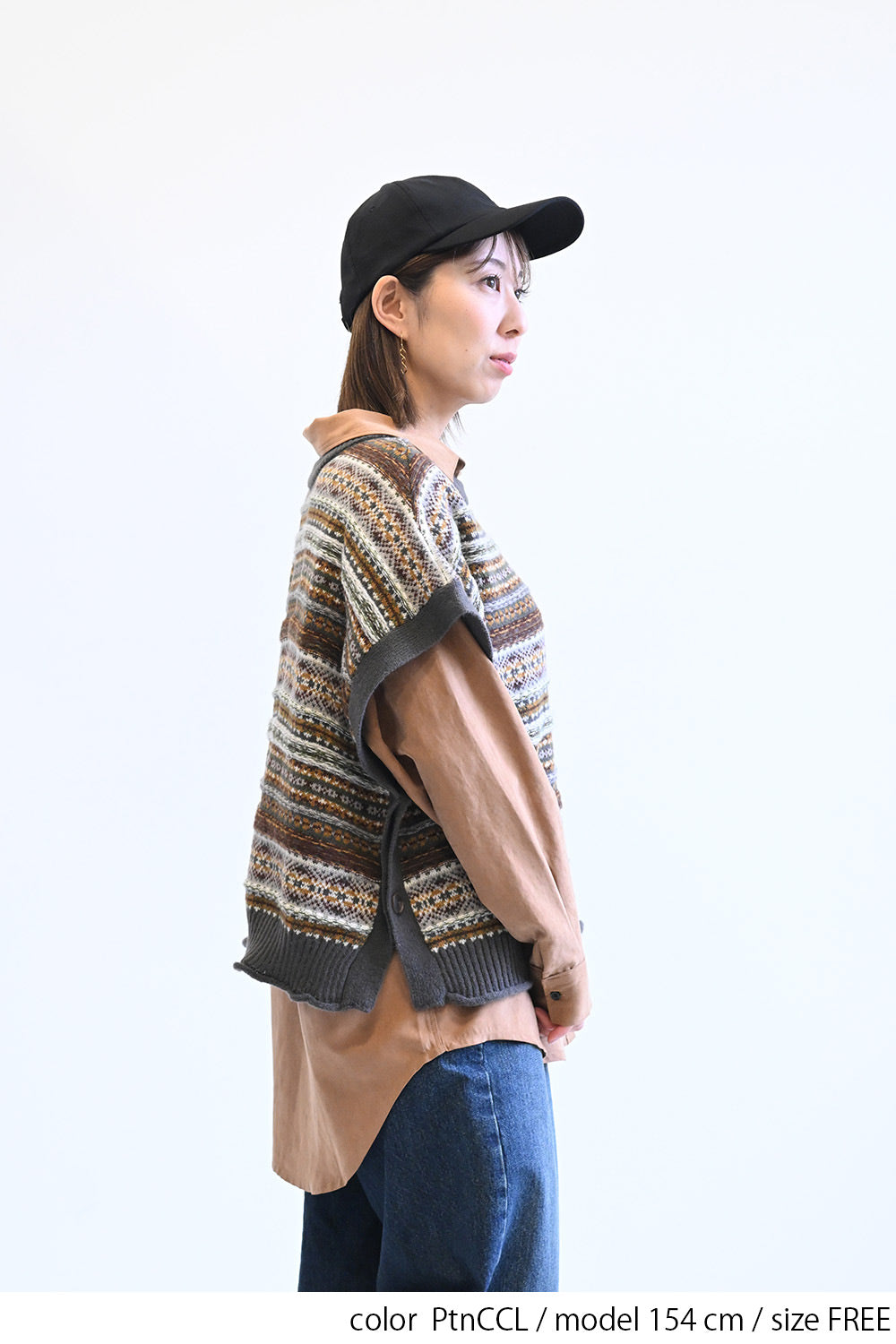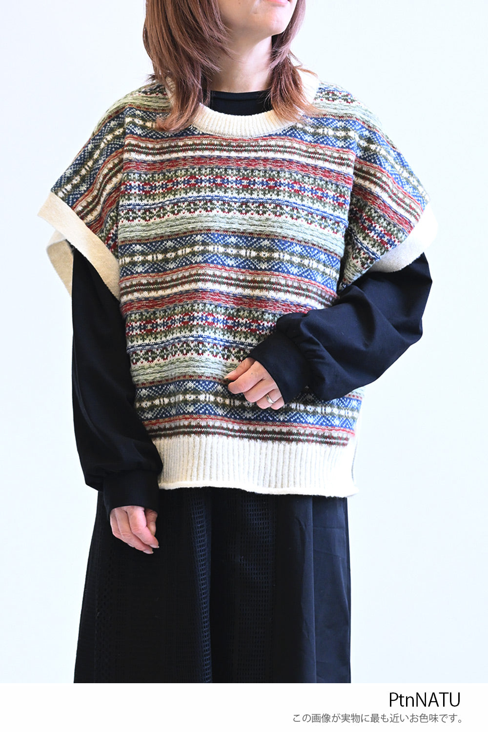 幾何学模様を組み合わせたノルディック柄がアクセントになり、シンプルなコーデに重ねるだけで季節感のあるスタイルに。
