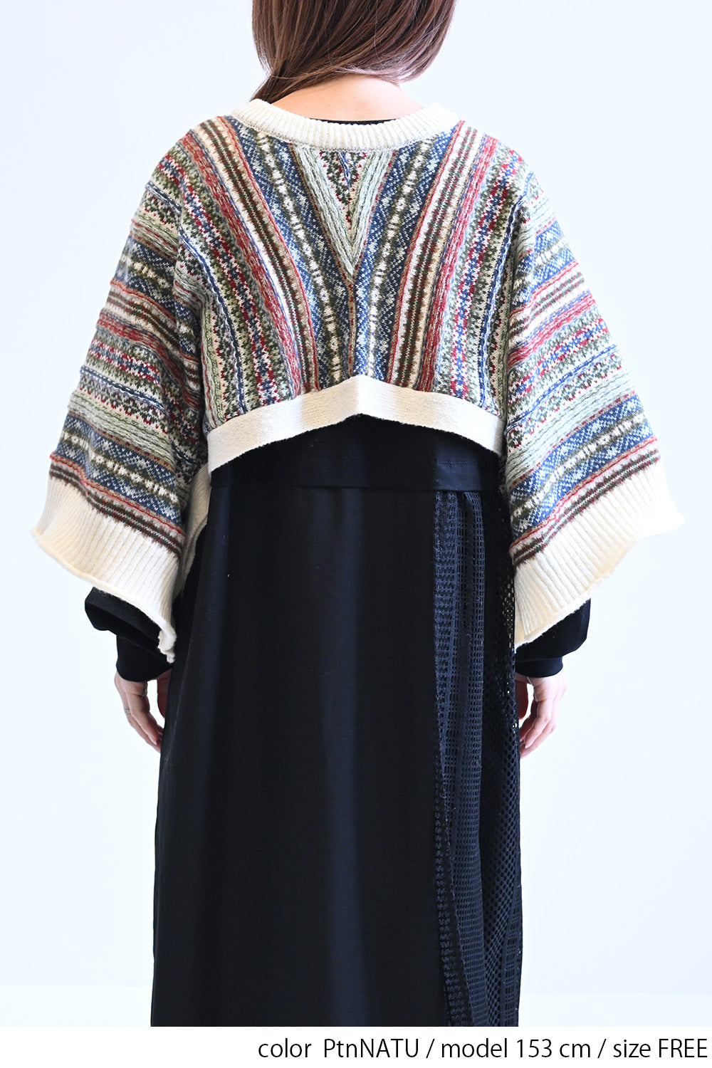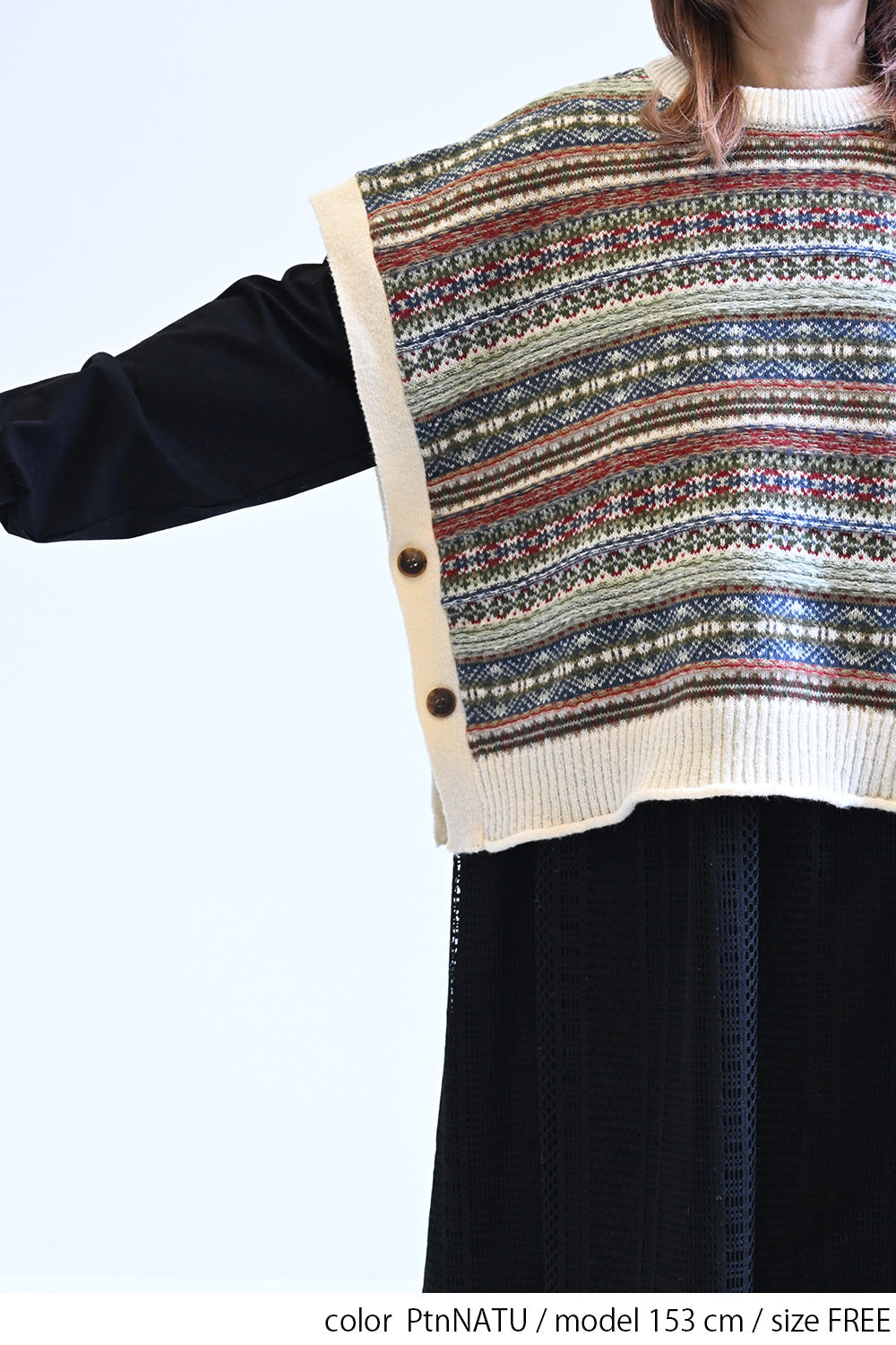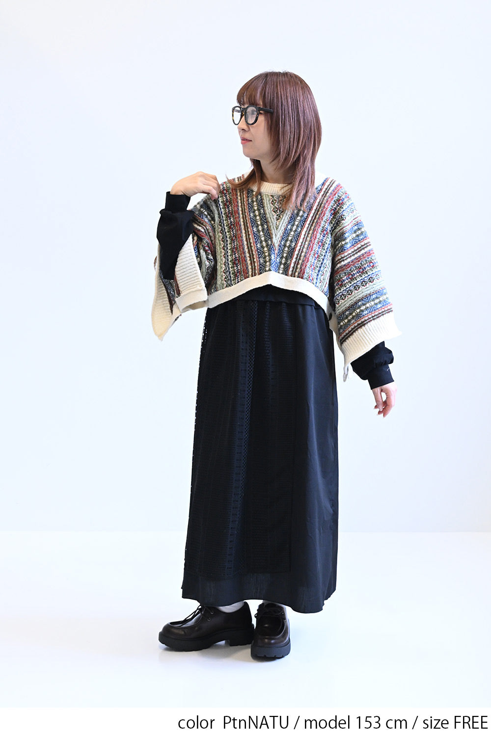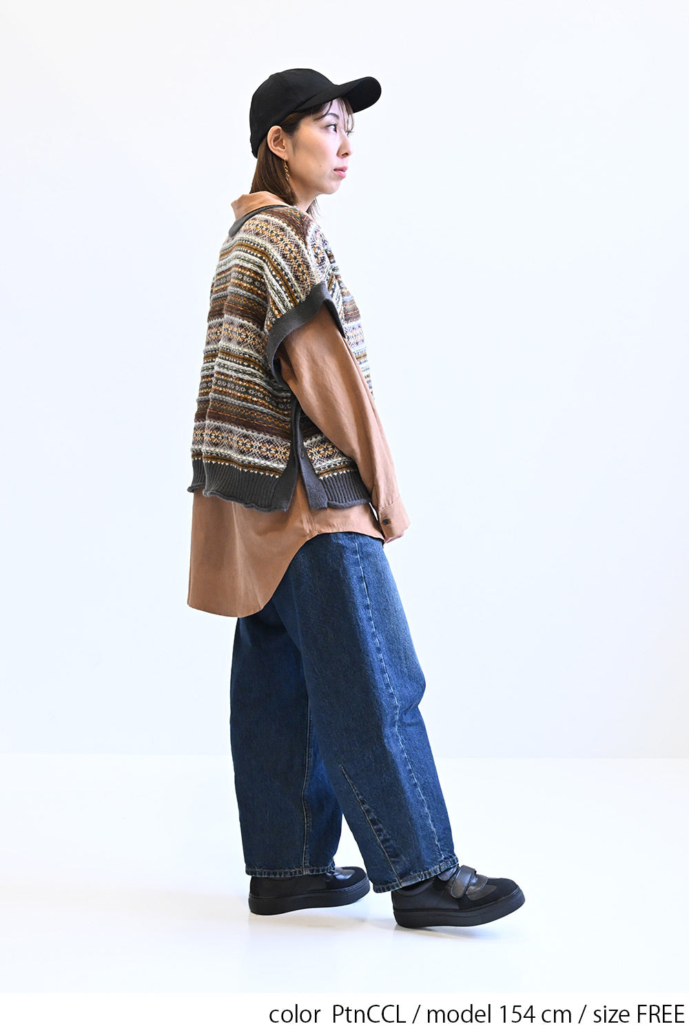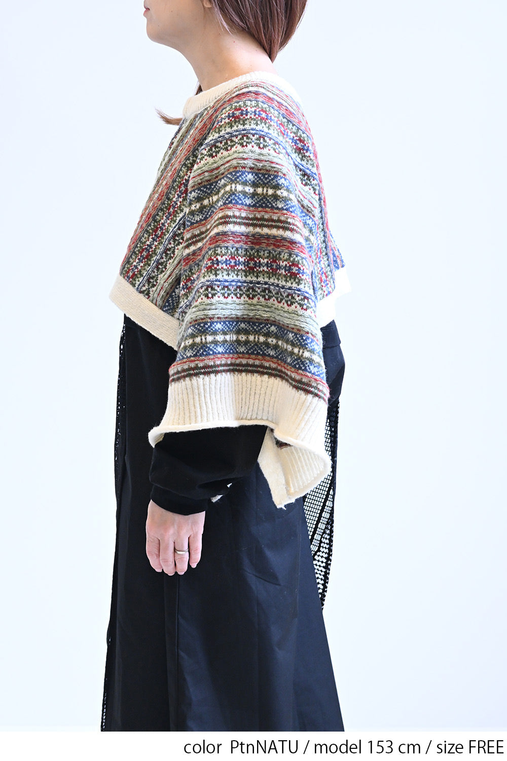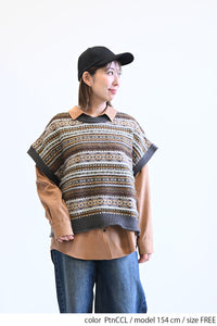 幾何学模様を組み合わせたノルディック柄がアクセントになり、シンプルなコーデに重ねるだけで季節感のあるスタイルに。