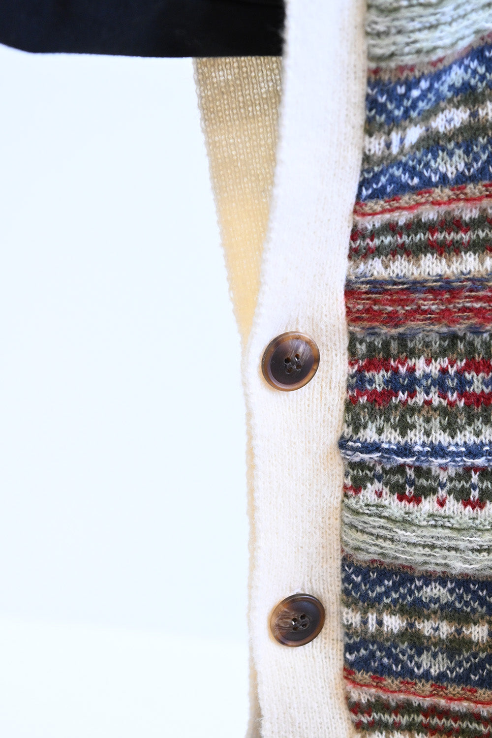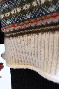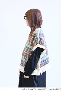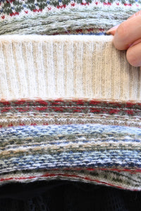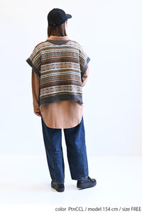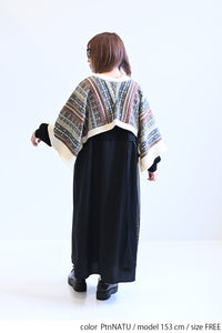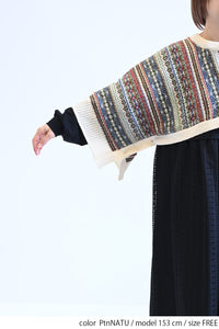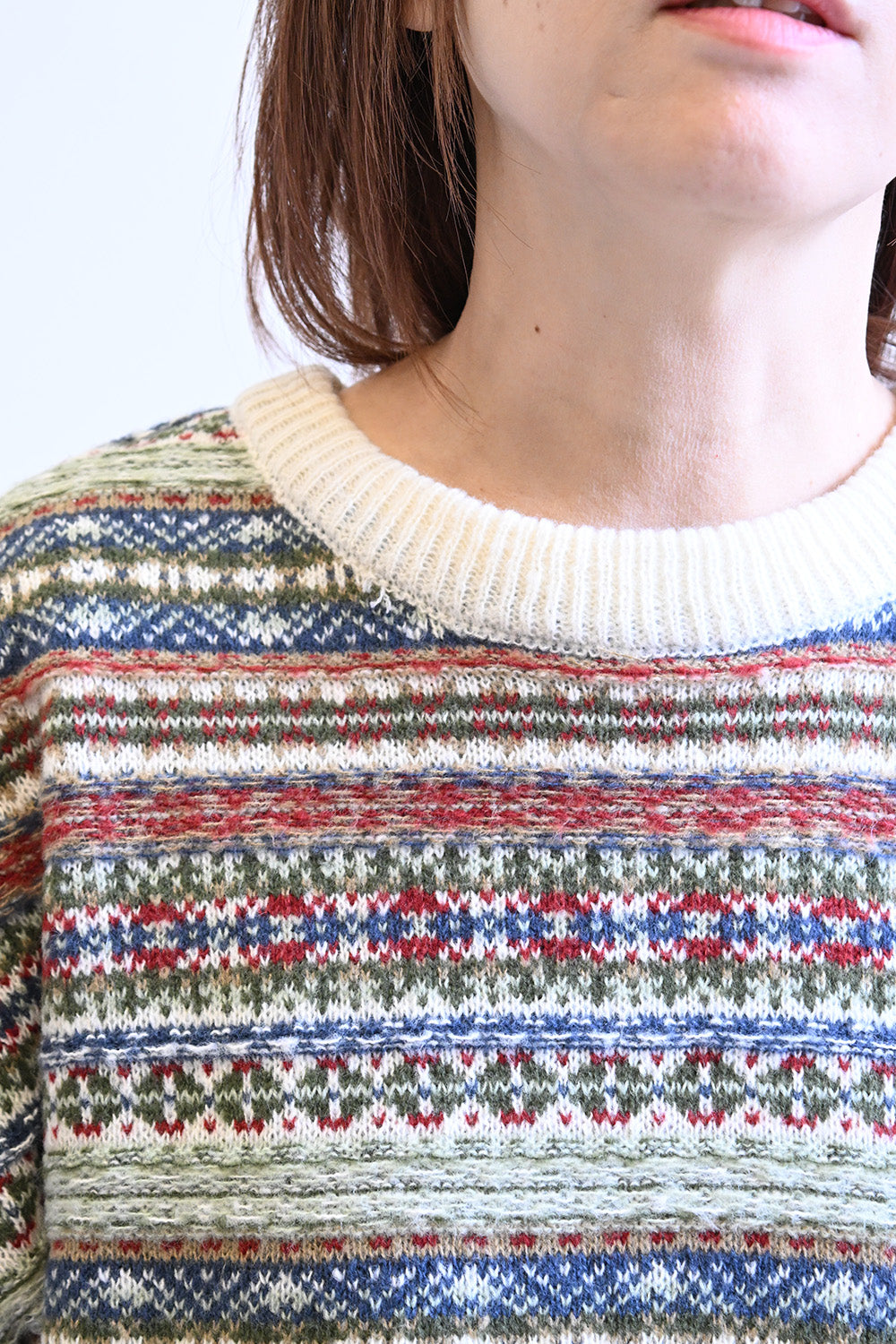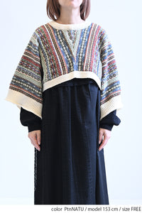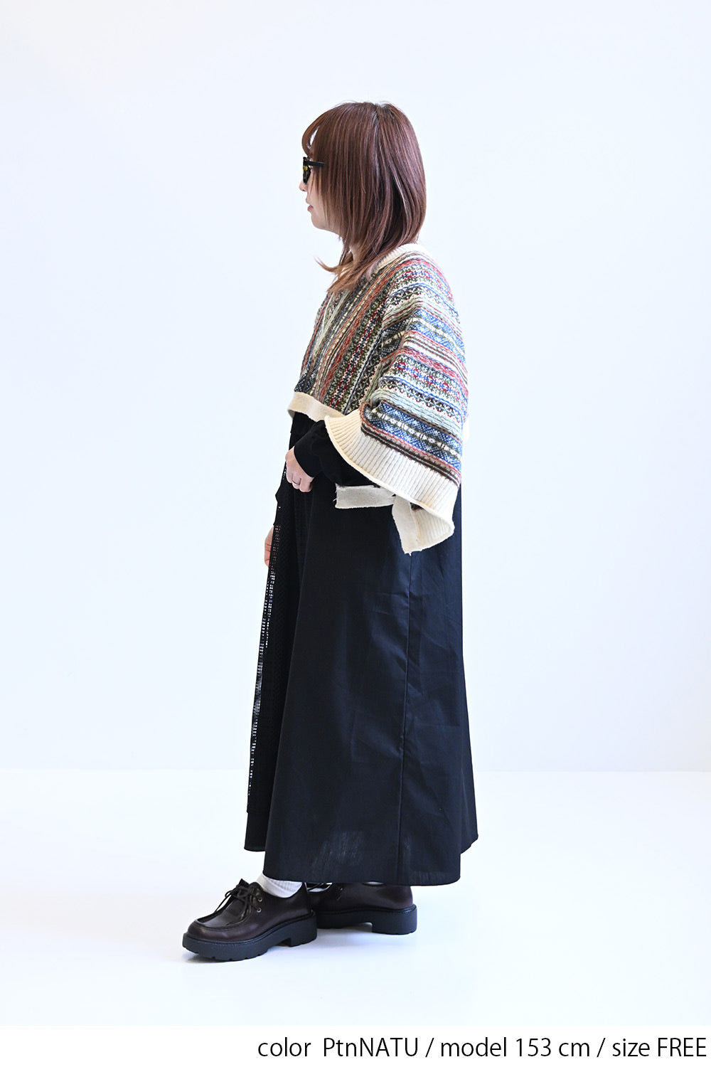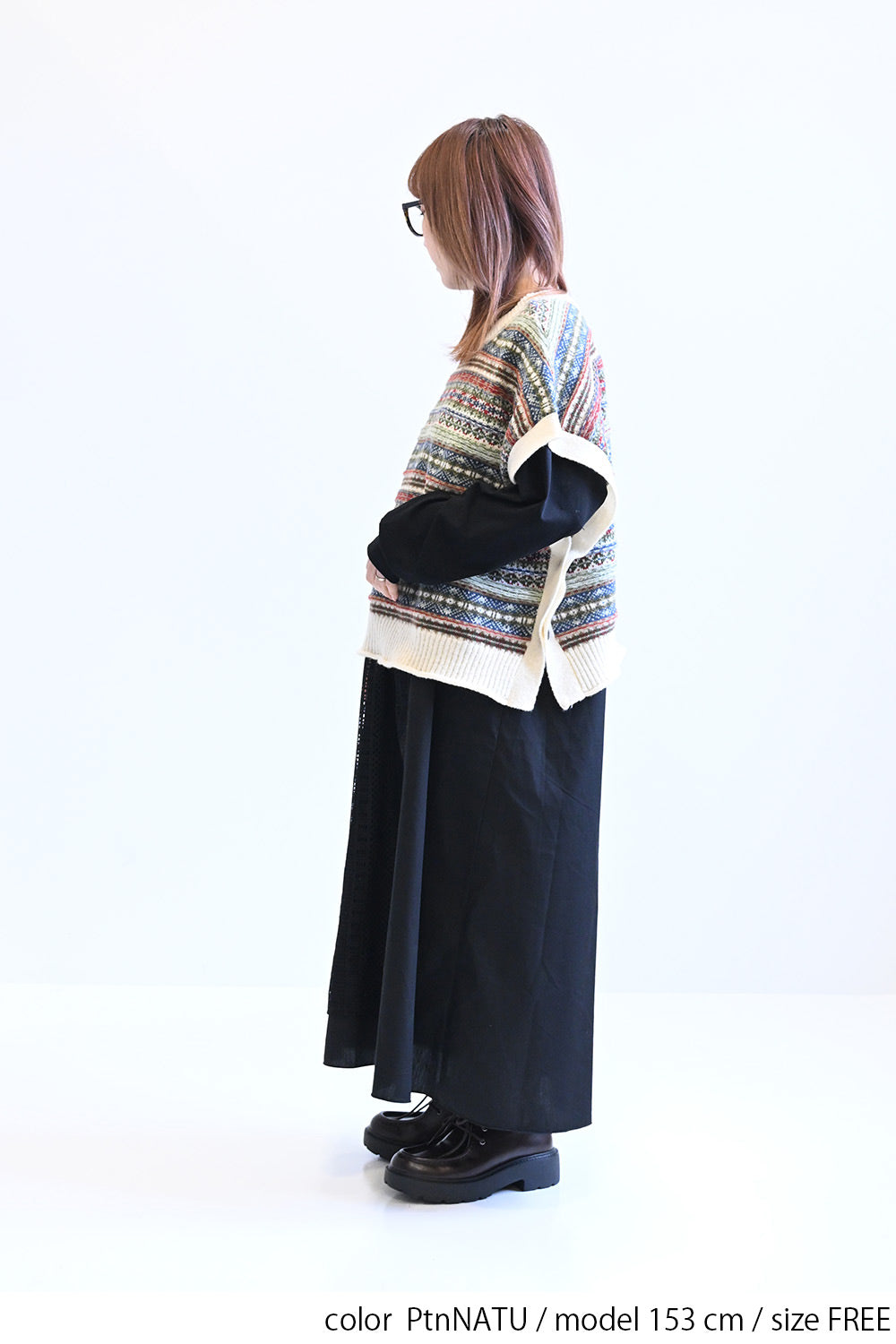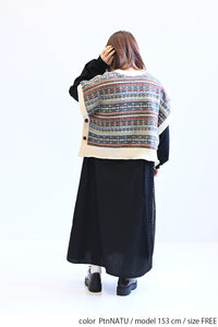 幾何学模様を組み合わせたノルディック柄がアクセントになり、シンプルなコーデに重ねるだけで季節感のあるスタイルに。