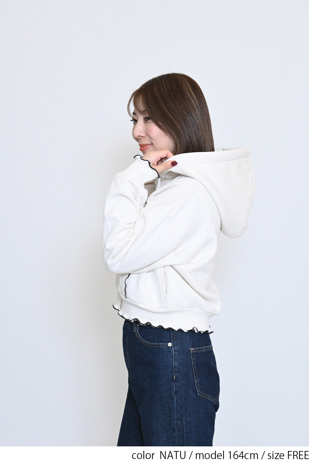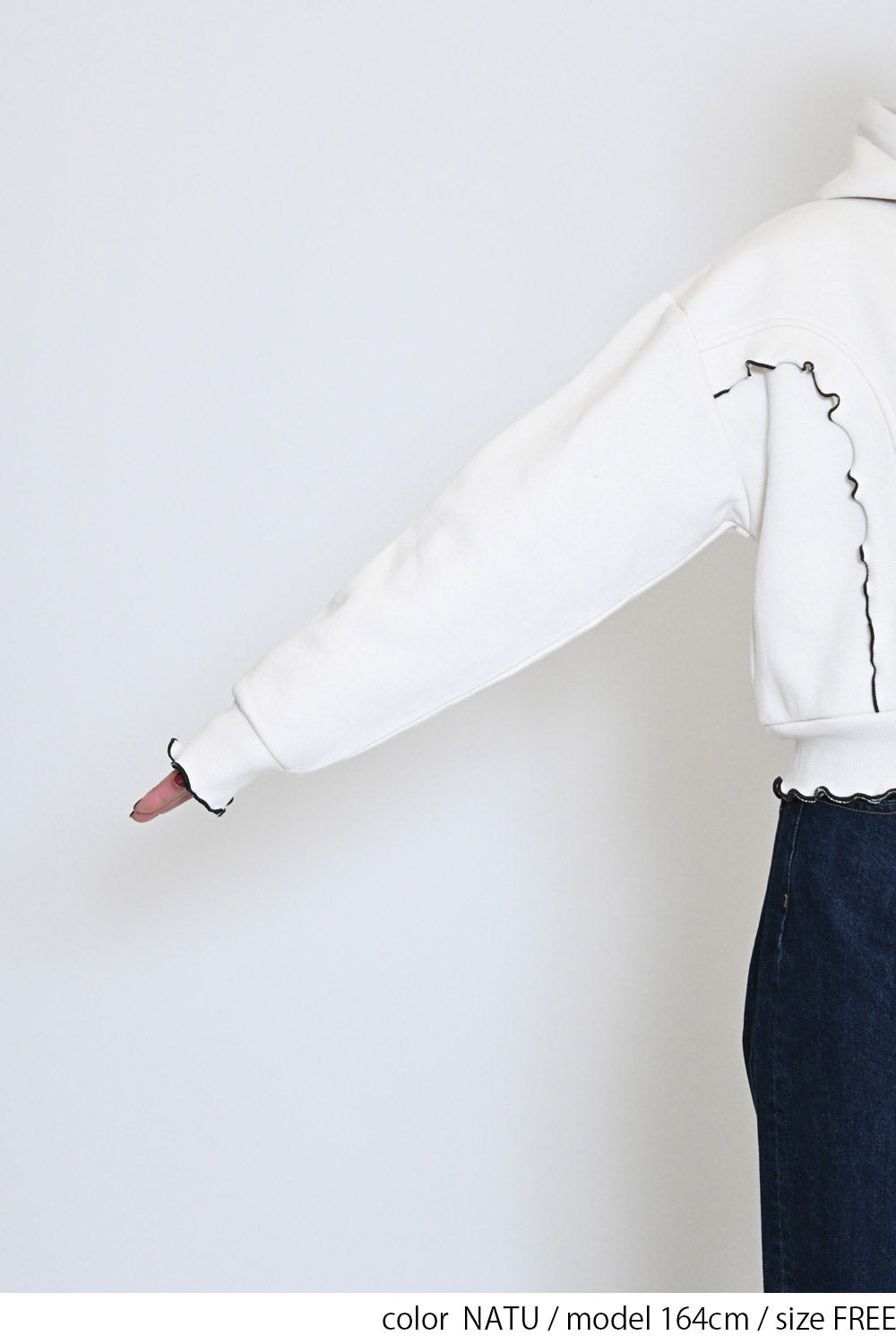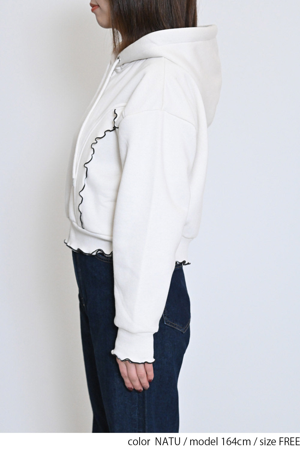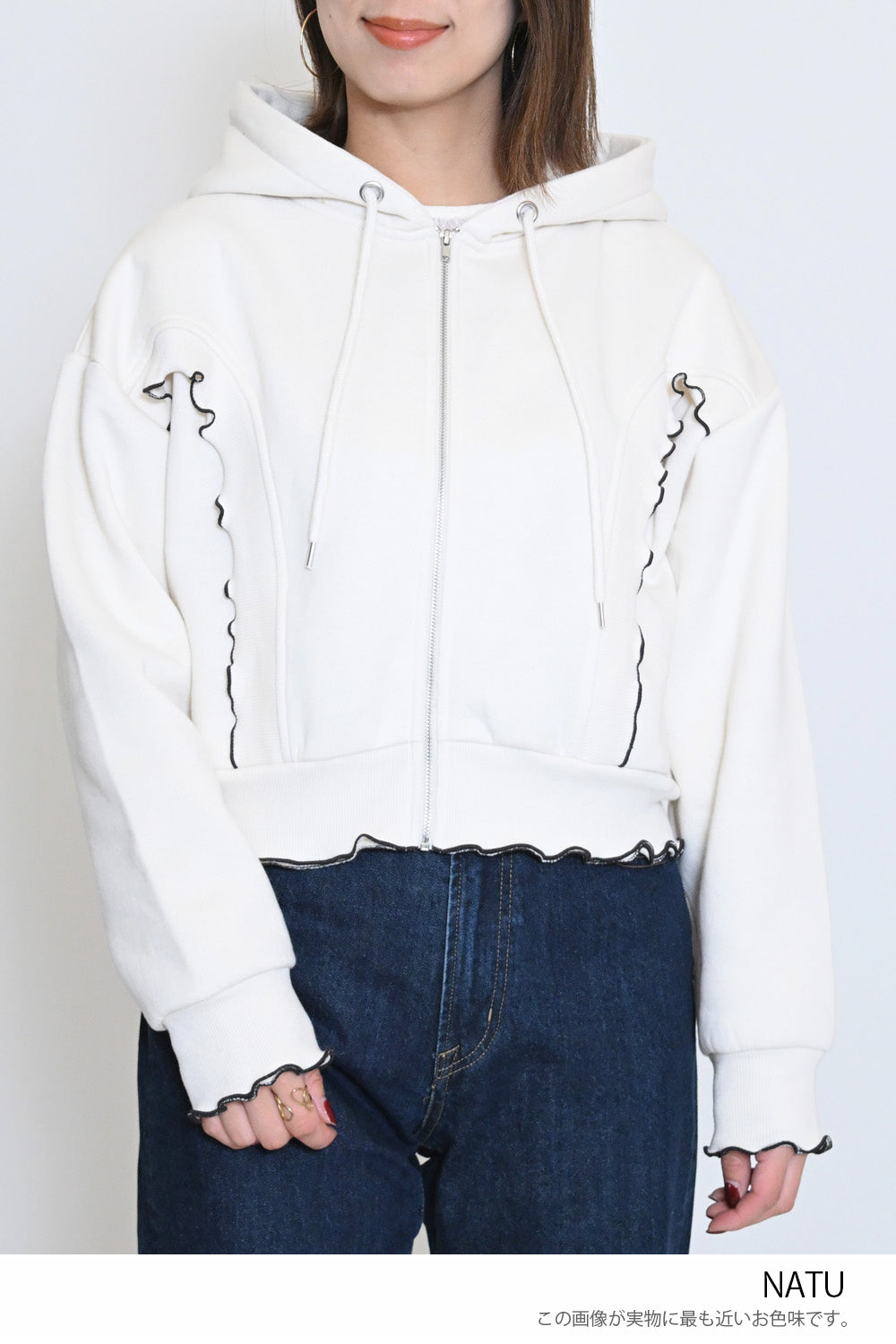 袖、脇、裾に施された配色のフリルがアクセントになっていて、シンプルながらガーリーで存在感があるパーカー。