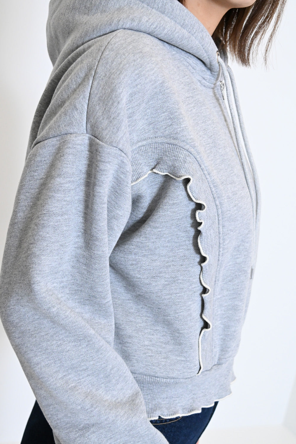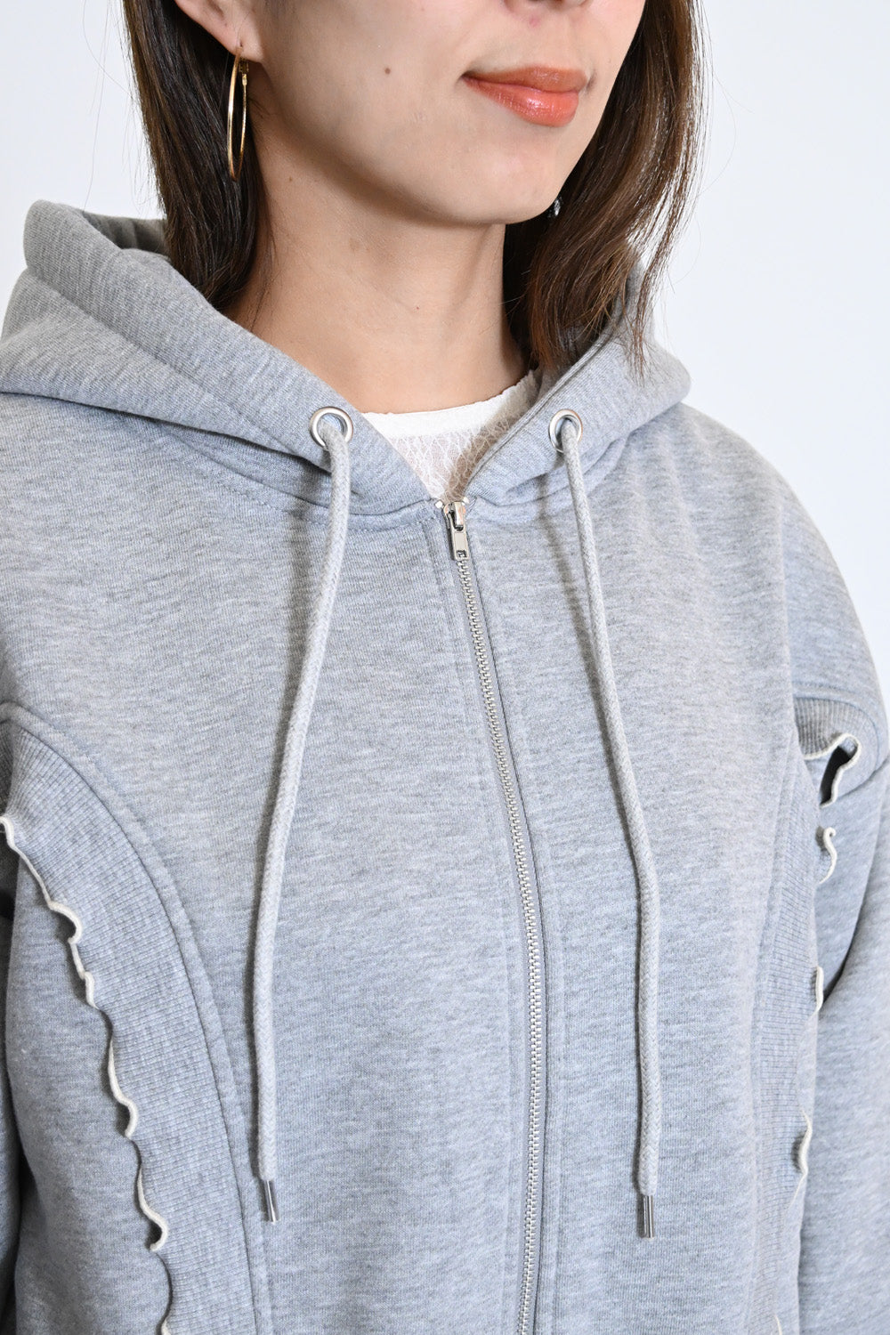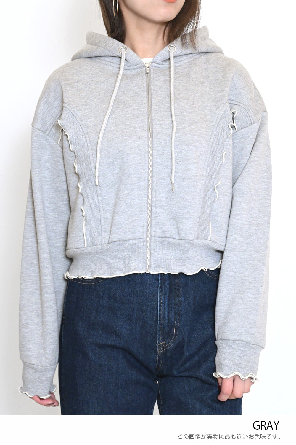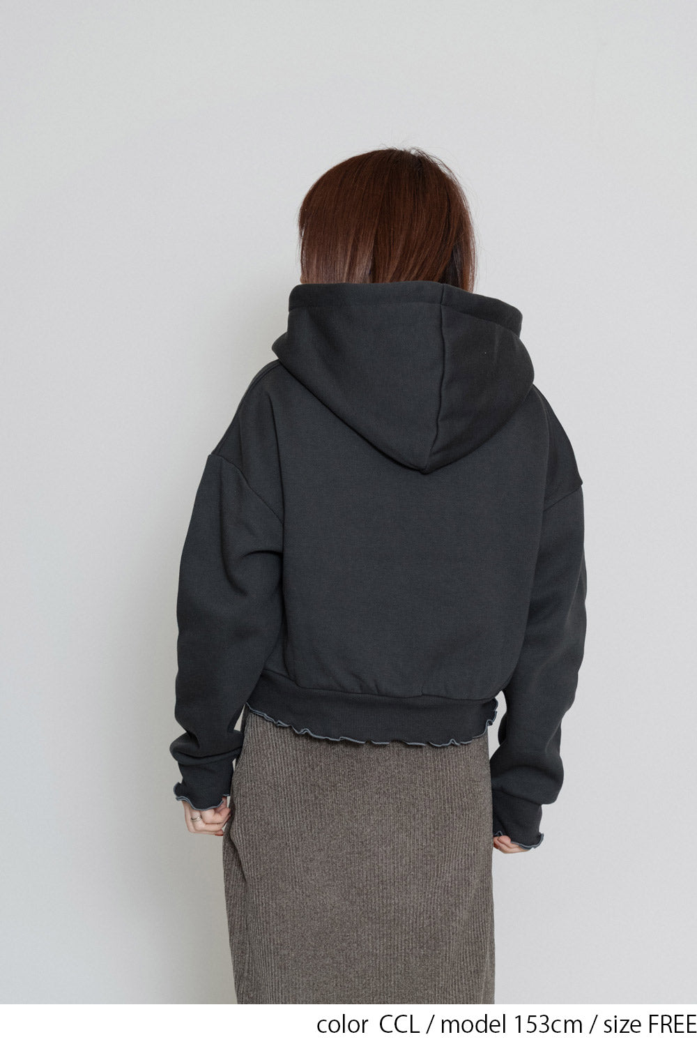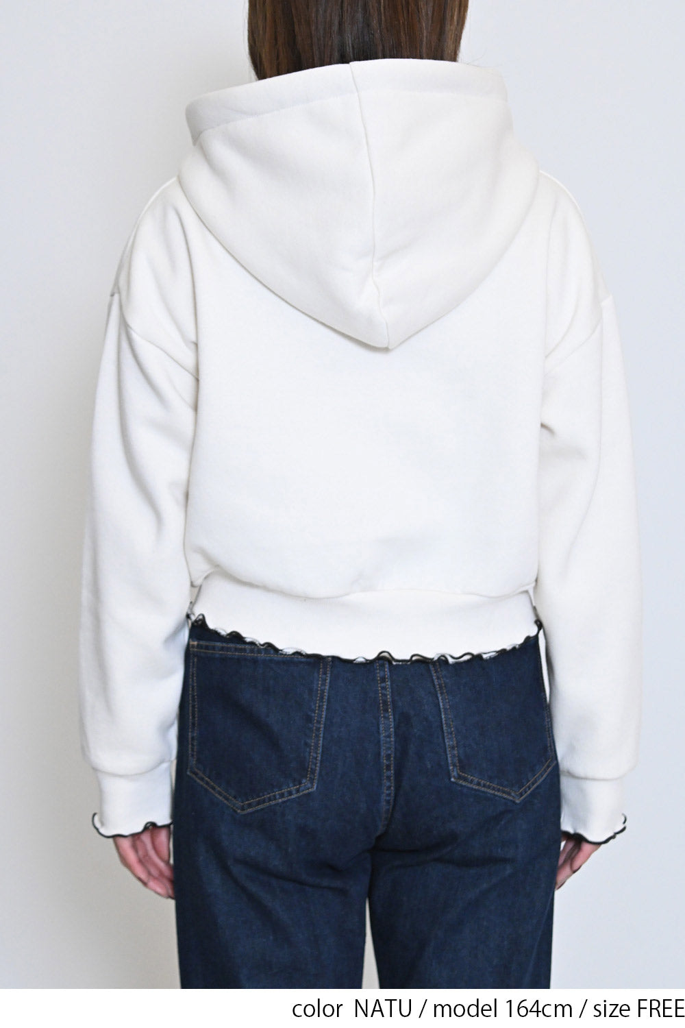 袖、脇、裾に施された配色のフリルがアクセントになっていて、シンプルながらガーリーで存在感があるパーカー。
