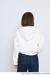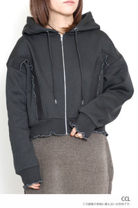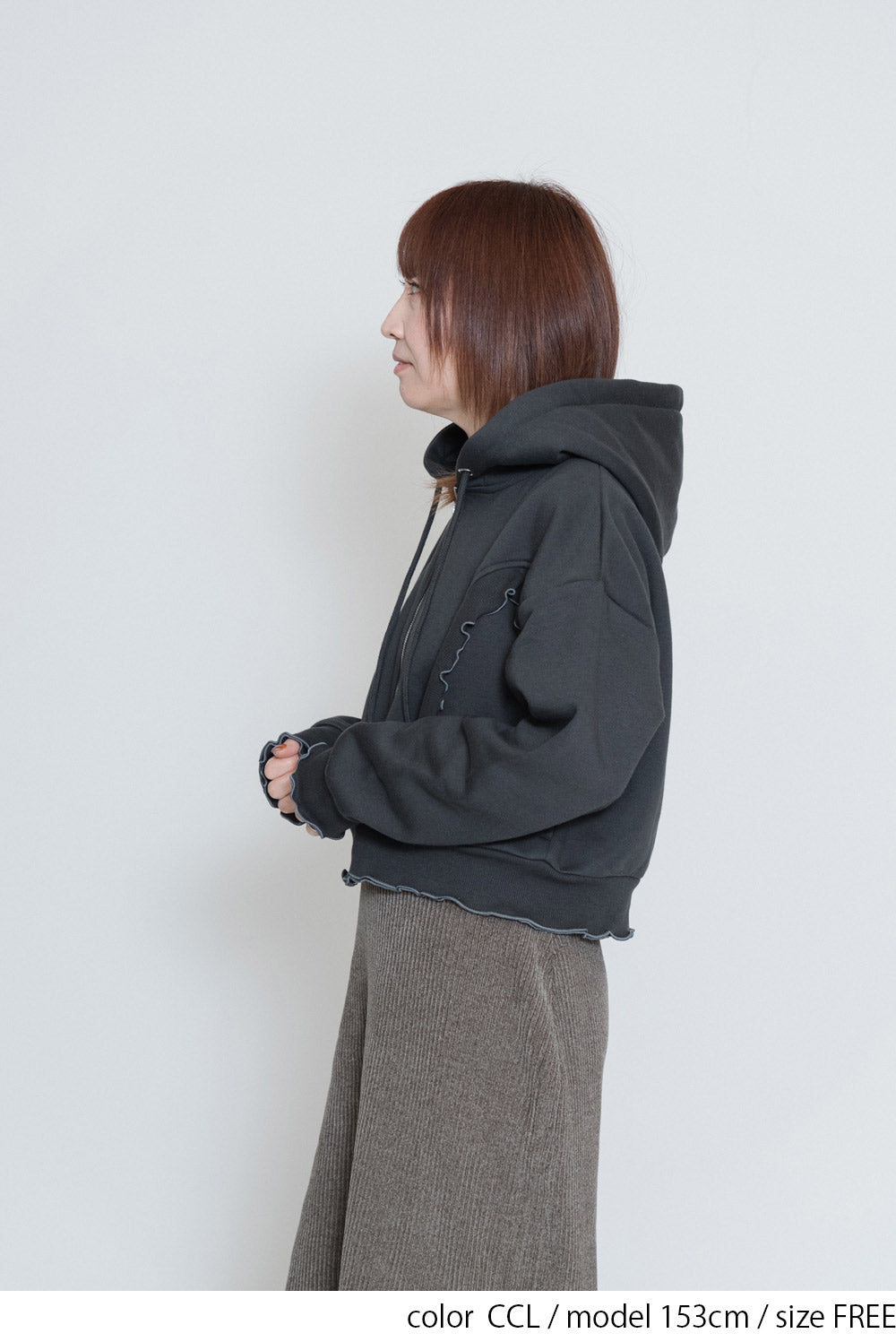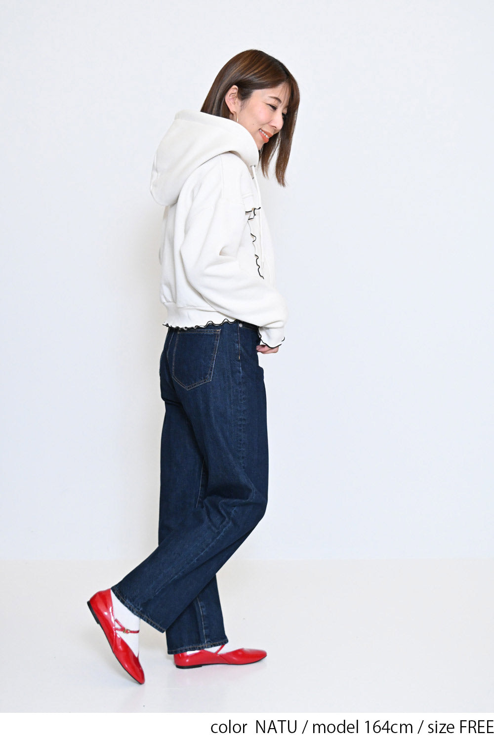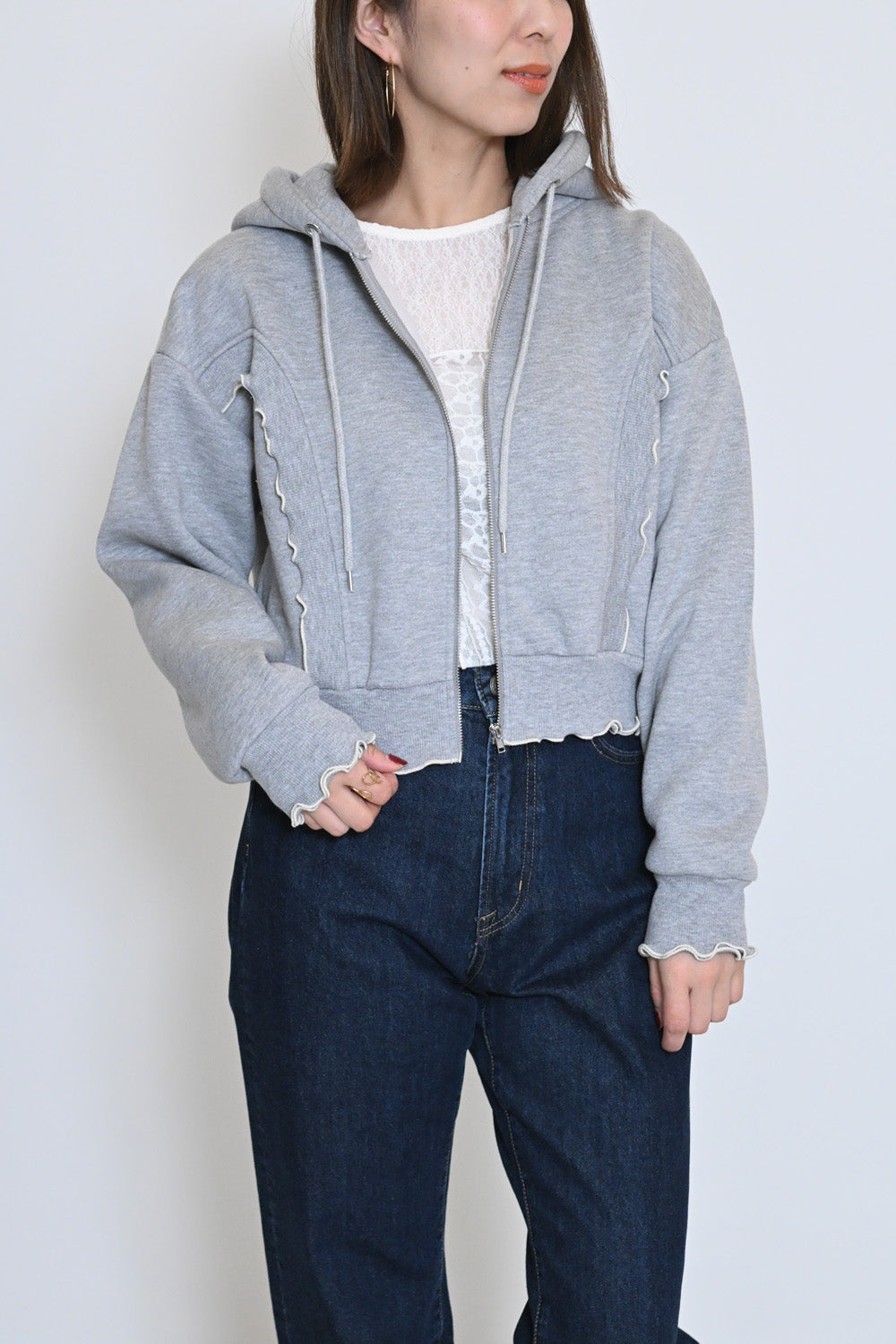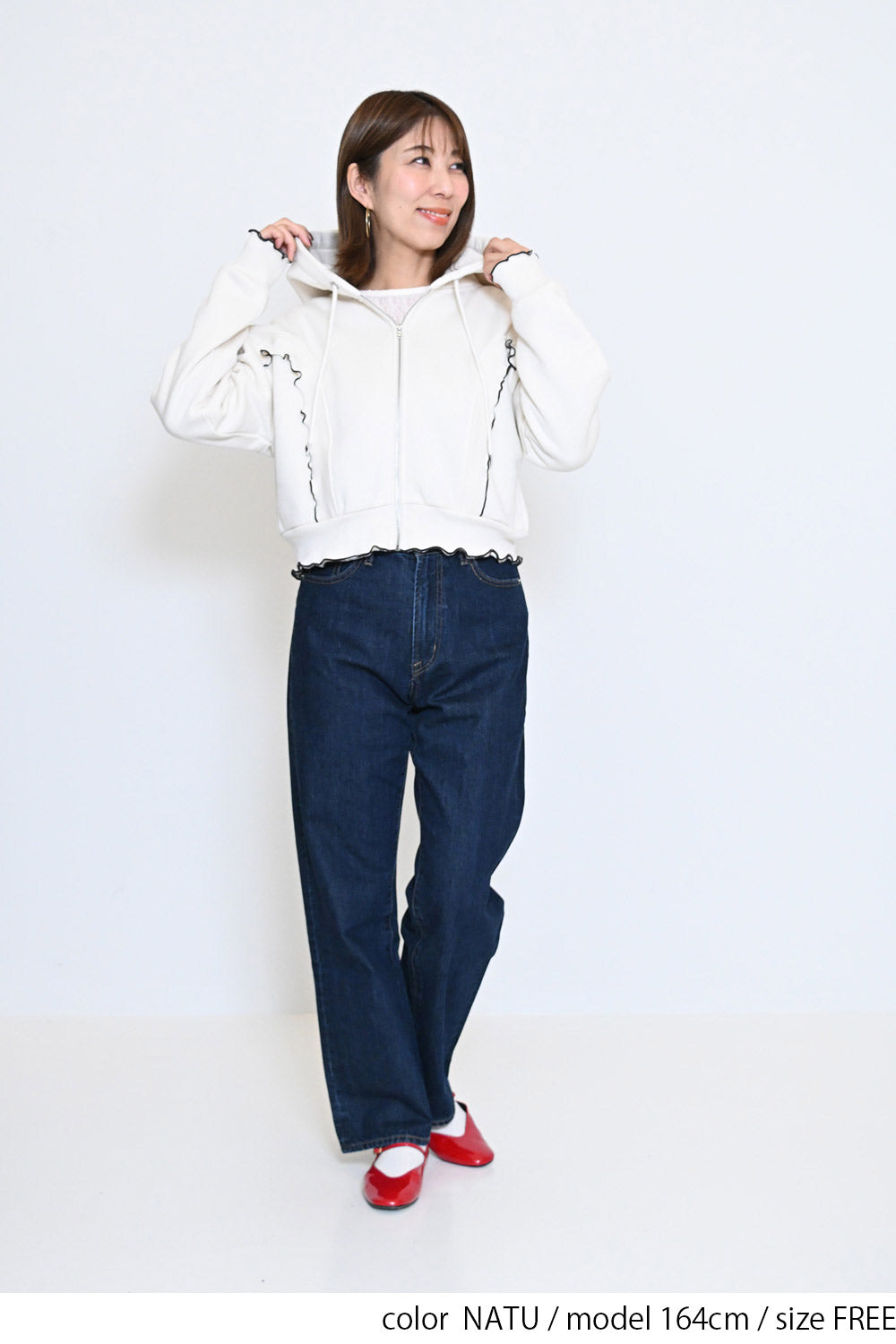 袖、脇、裾に施された配色のフリルがアクセントになっていて、シンプルながらガーリーで存在感があるパーカー。