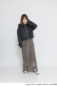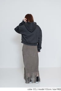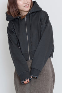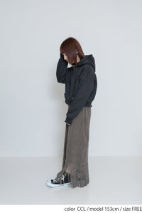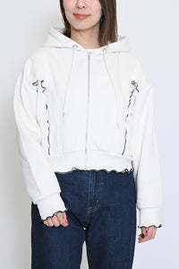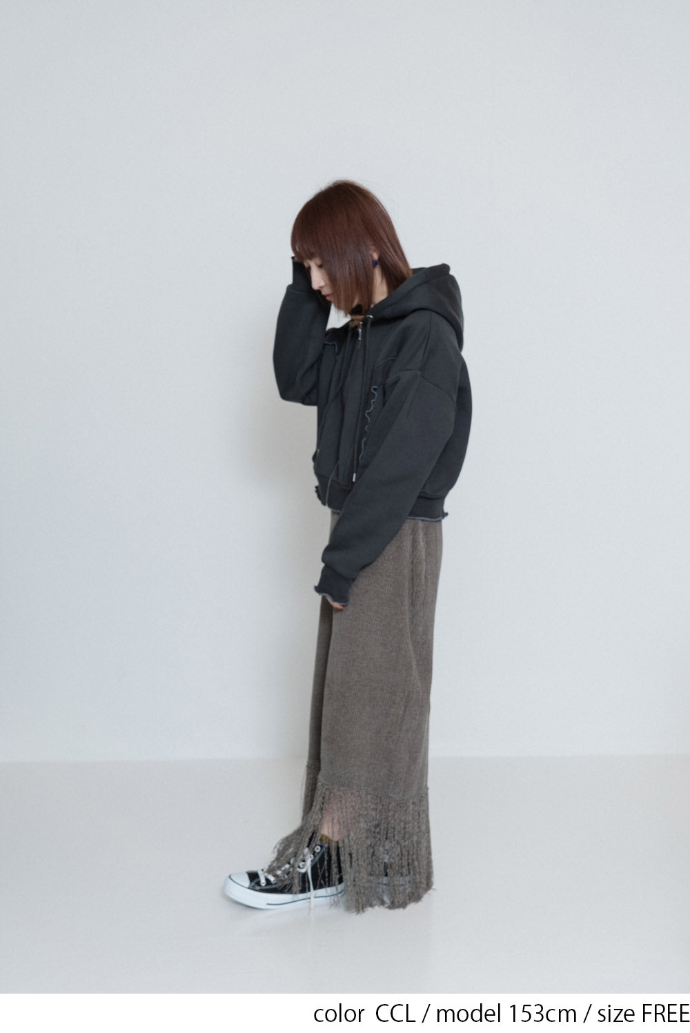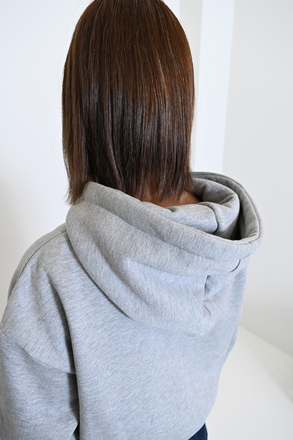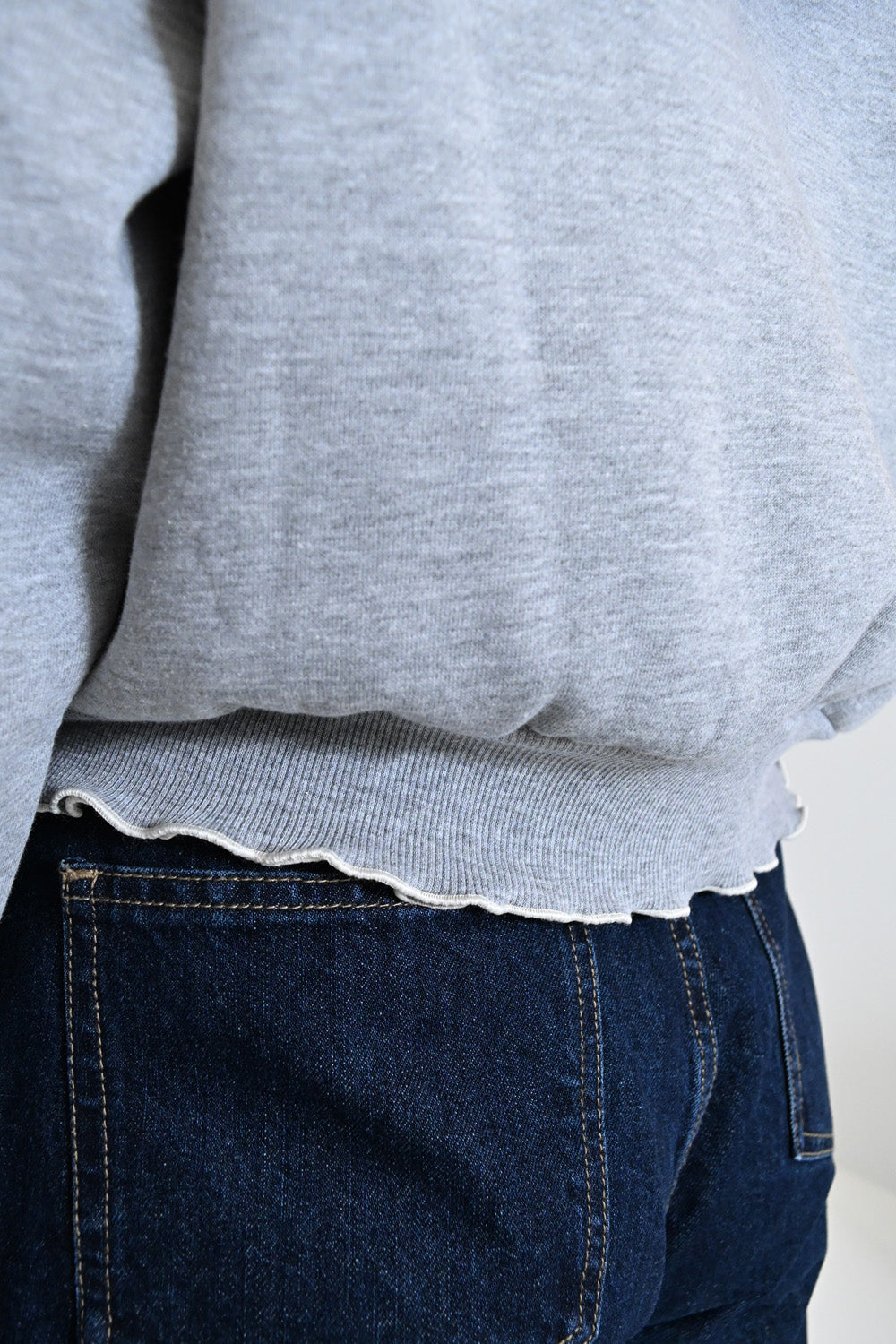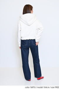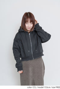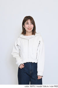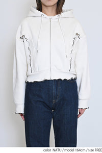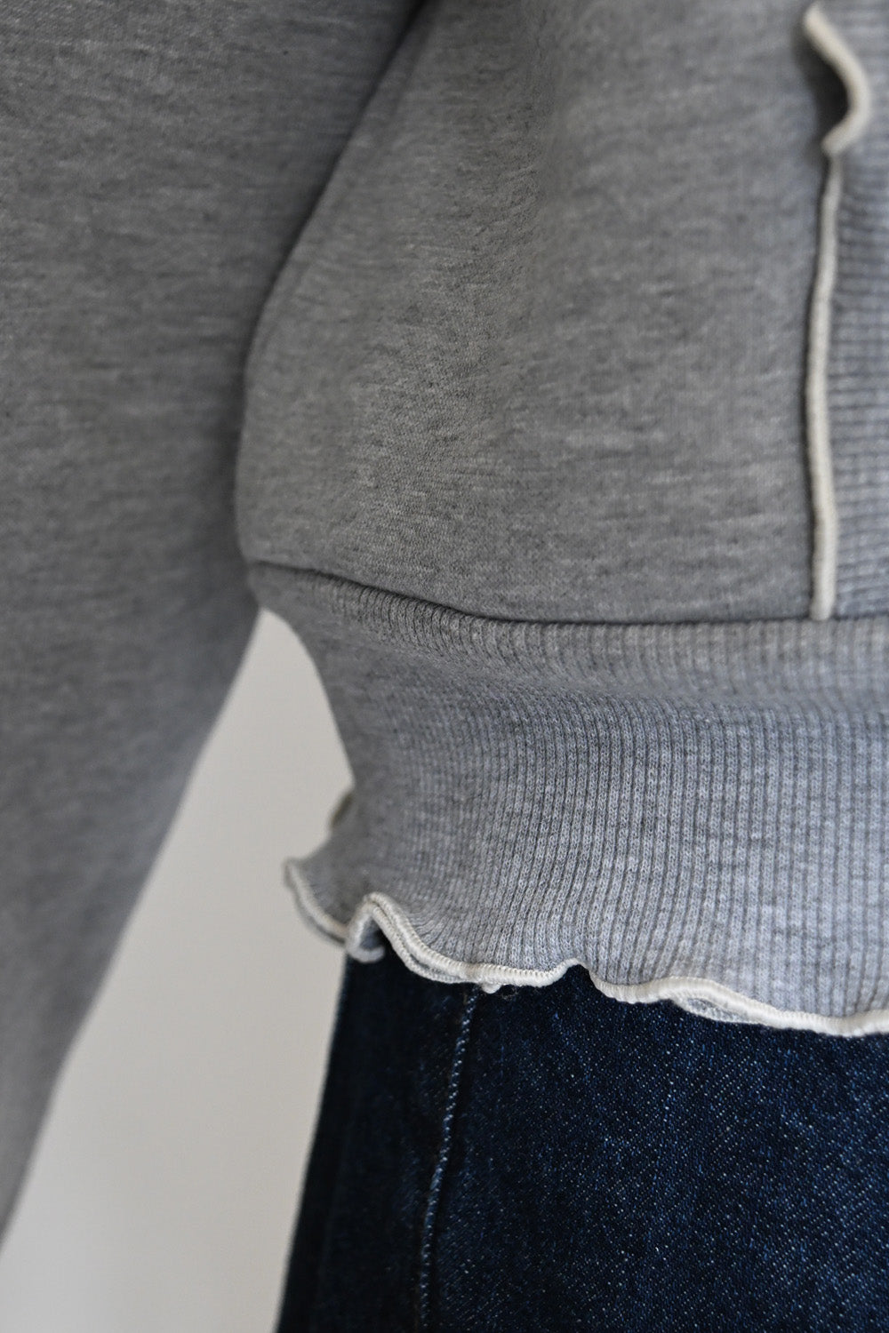 袖、脇、裾に施された配色のフリルがアクセントになっていて、シンプルながらガーリーで存在感があるパーカー。