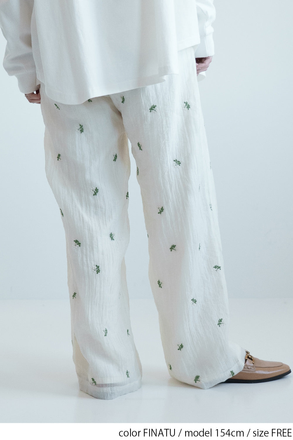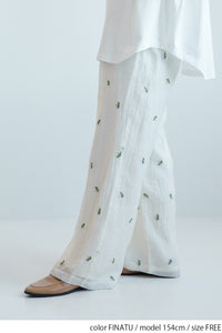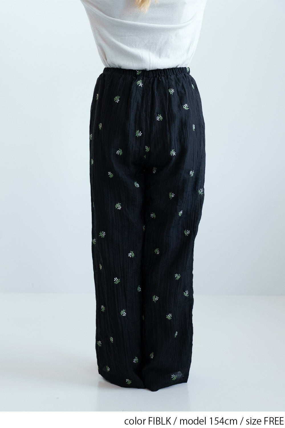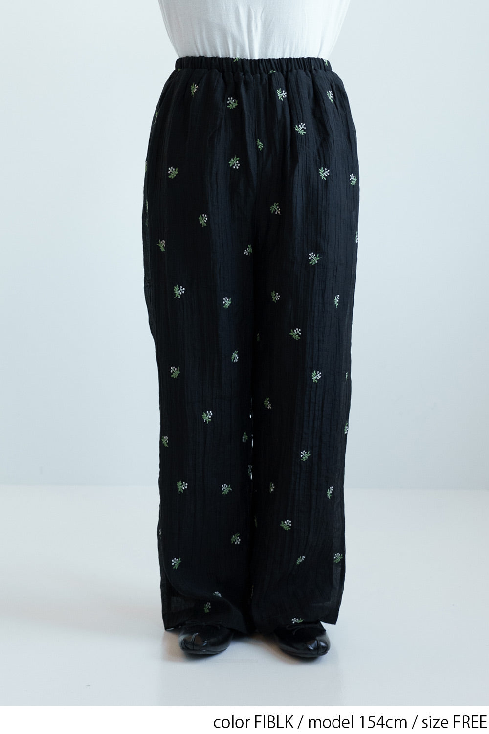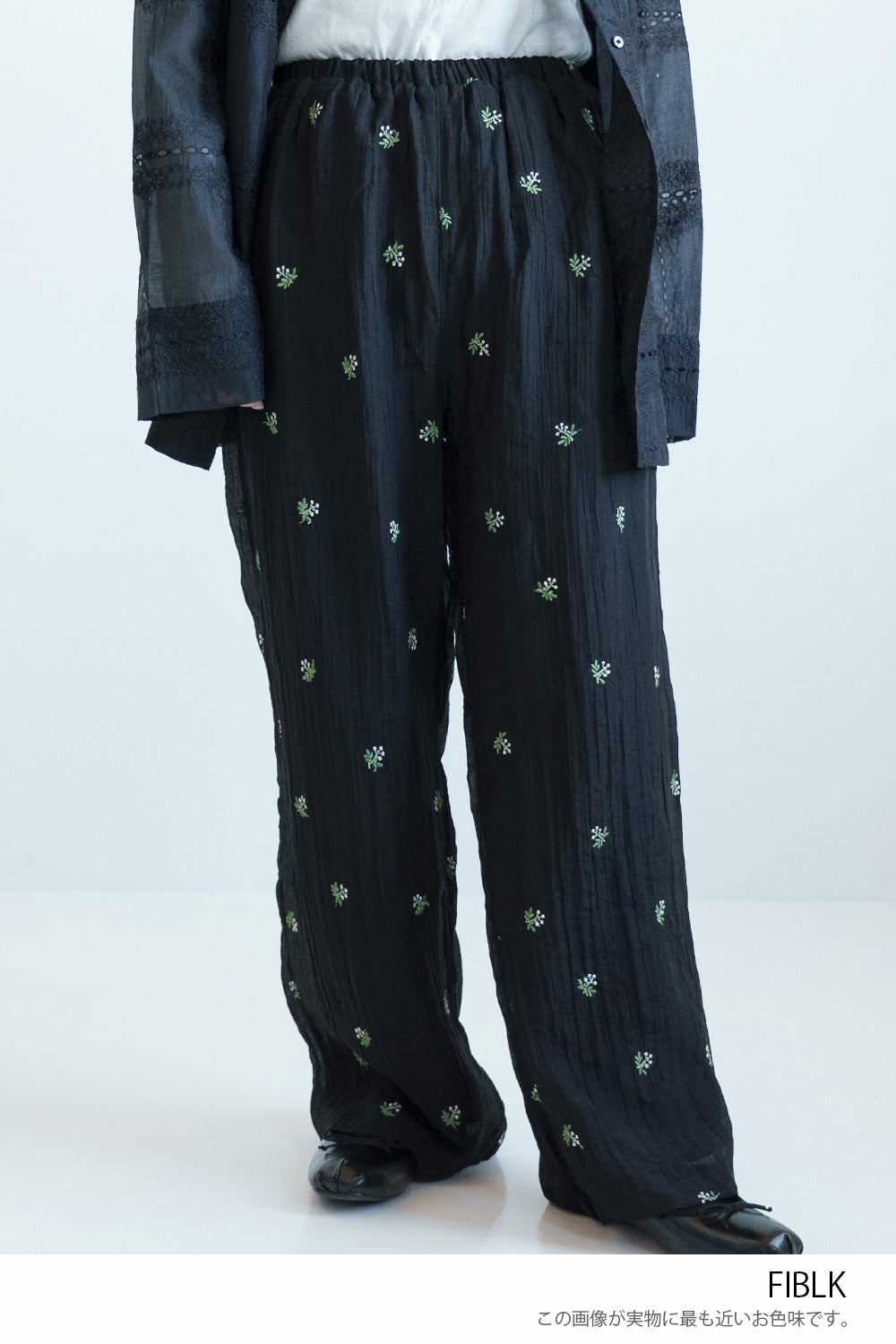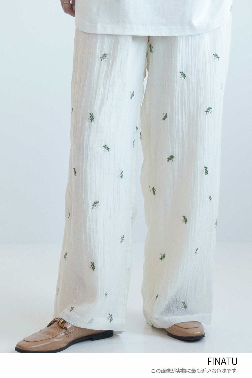 ナチュラルでやさしい雰囲気が魅力の、小花刺繍パンツ。