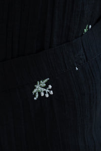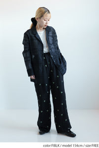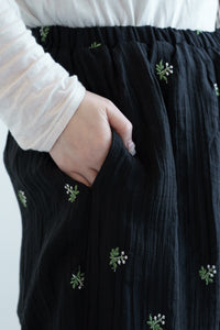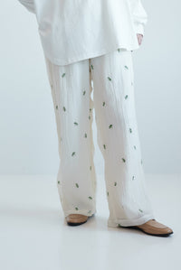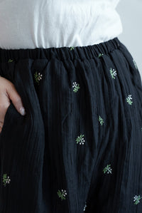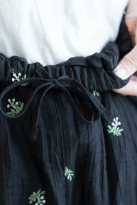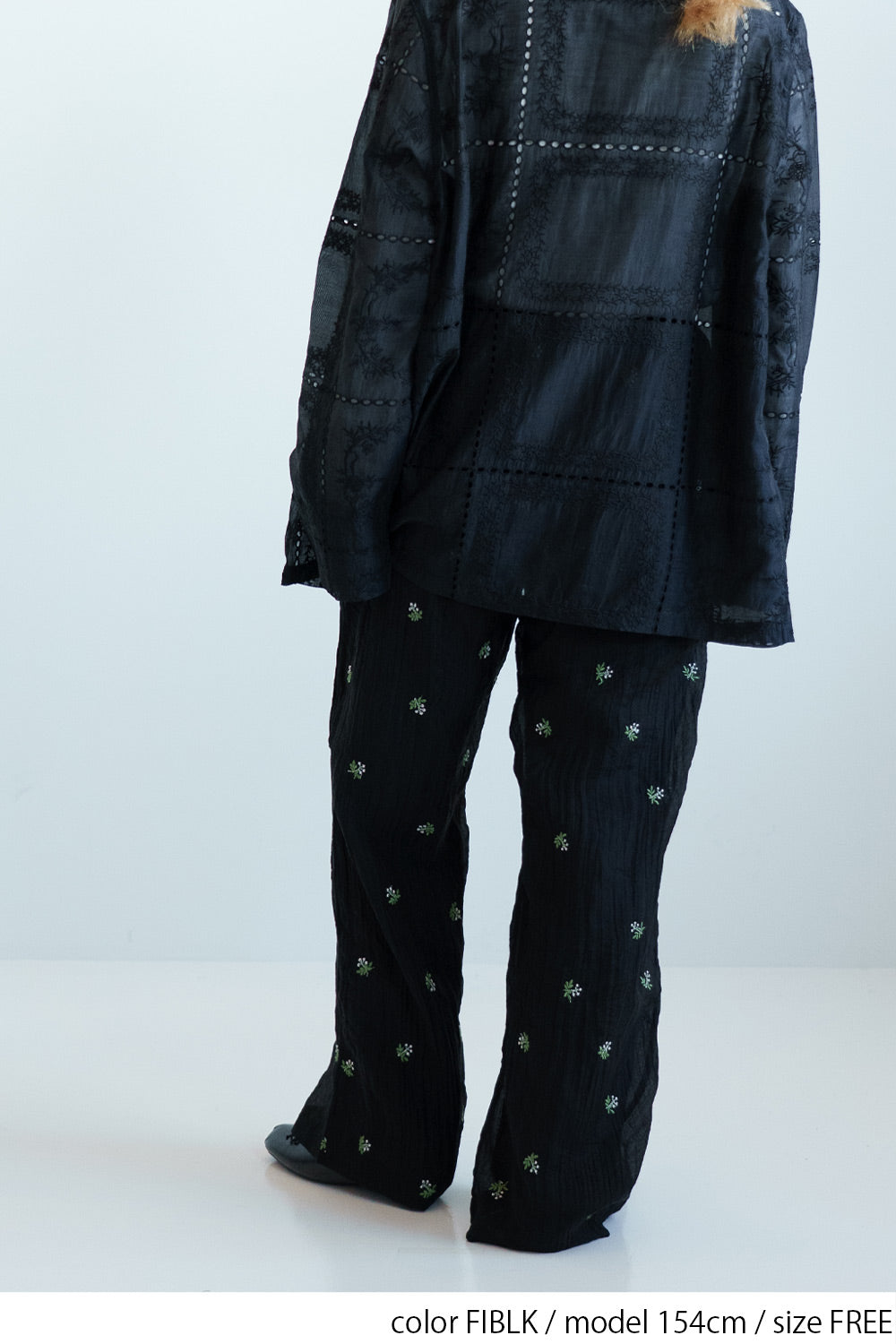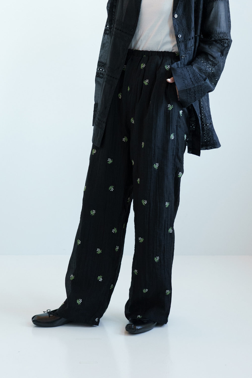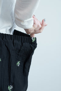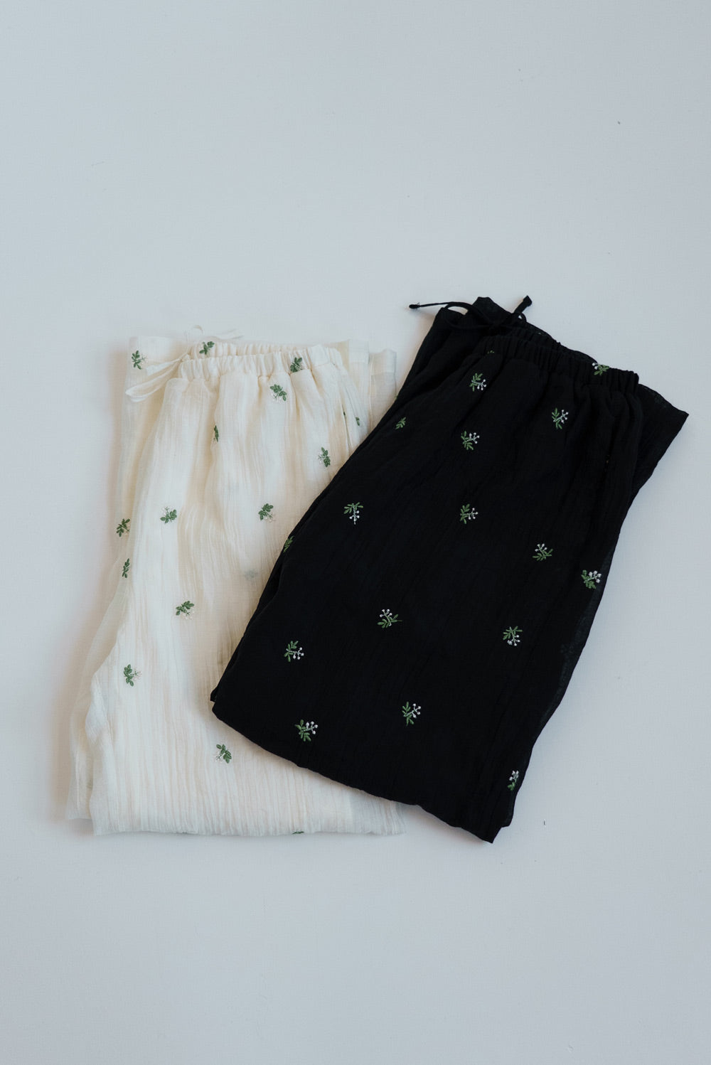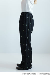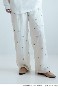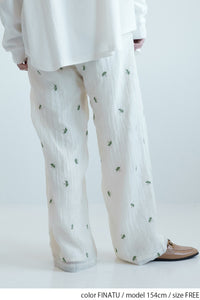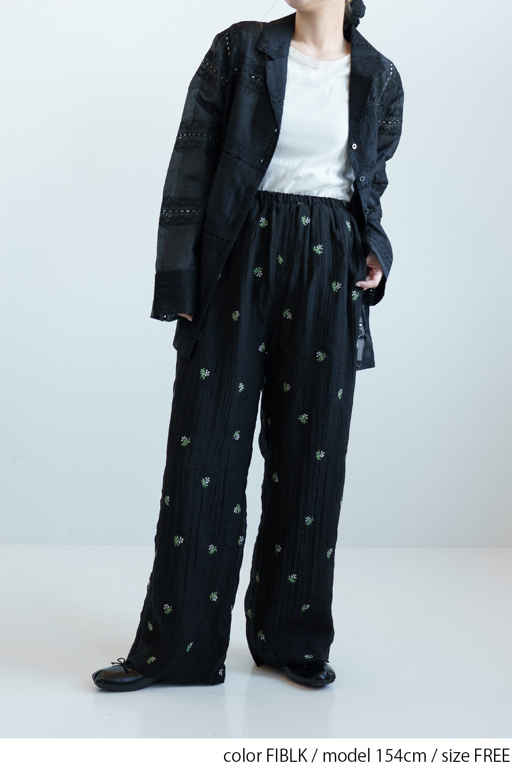 ナチュラルでやさしい雰囲気が魅力の、小花刺繍パンツ。