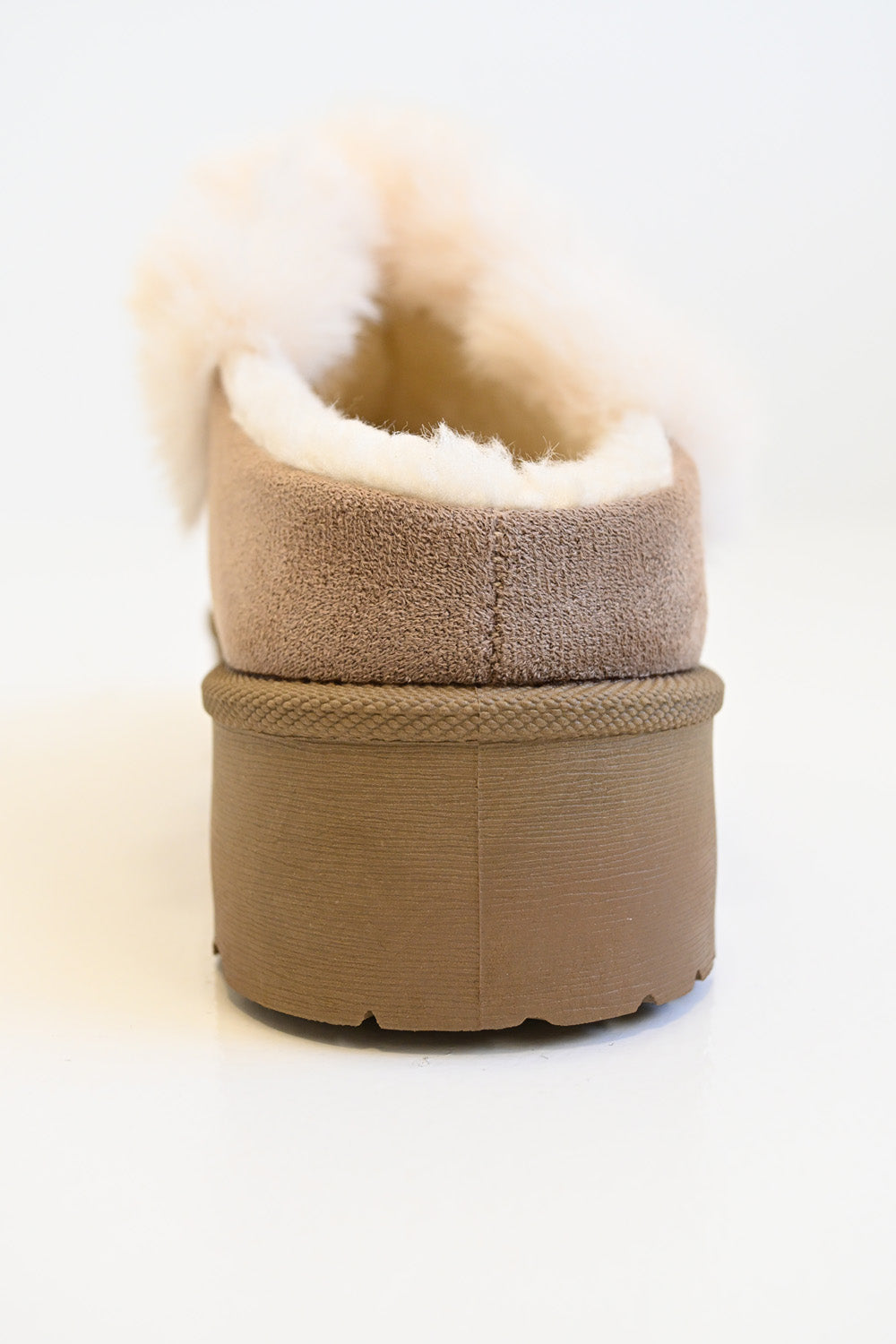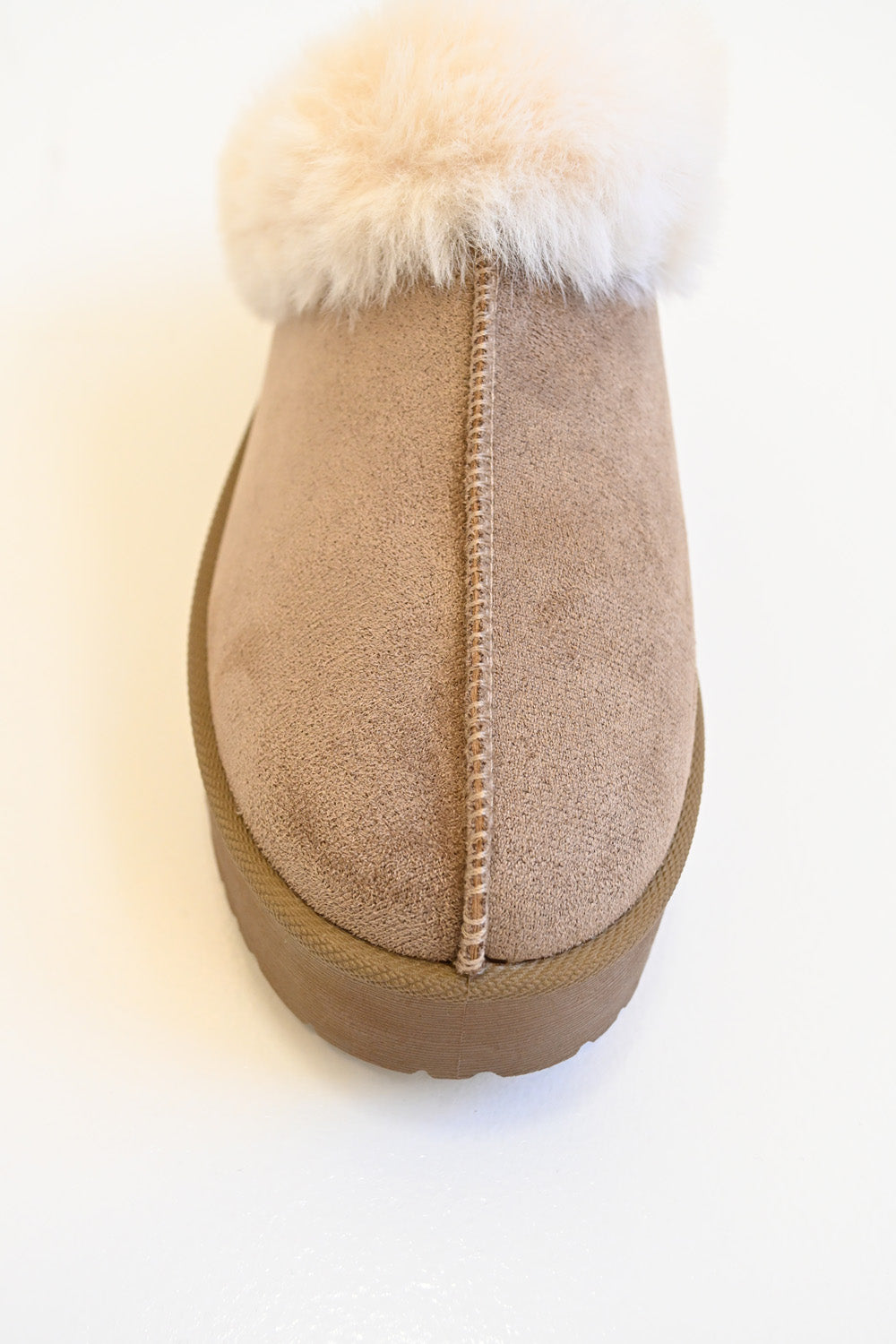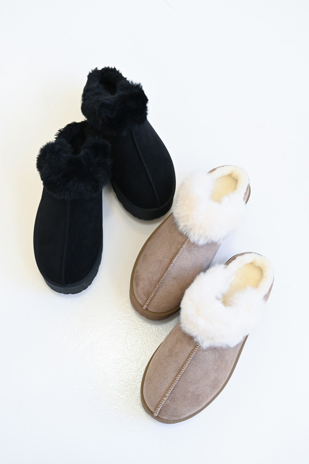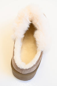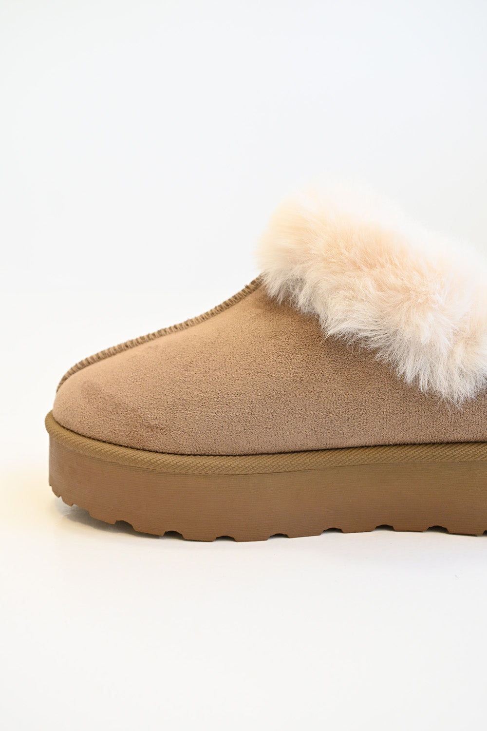 ふんわりファーが足元を包み込む、季節感たっぷりに仕上げたムートンサボ。
