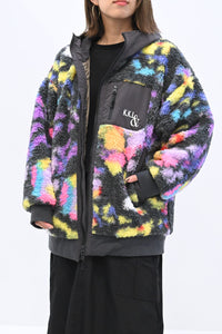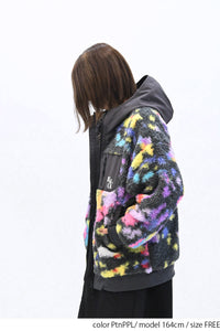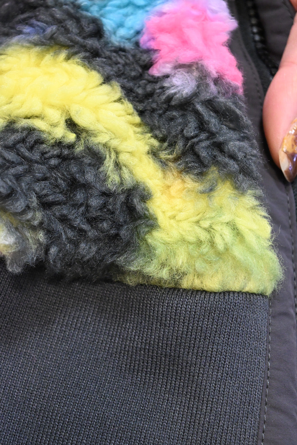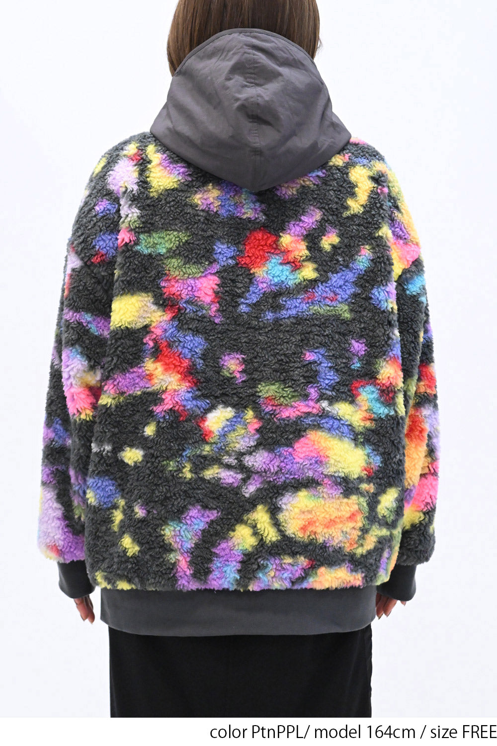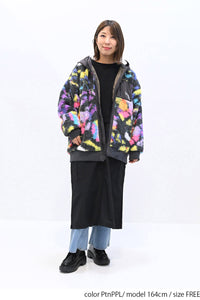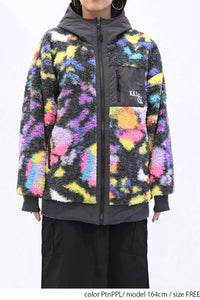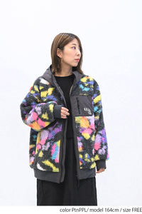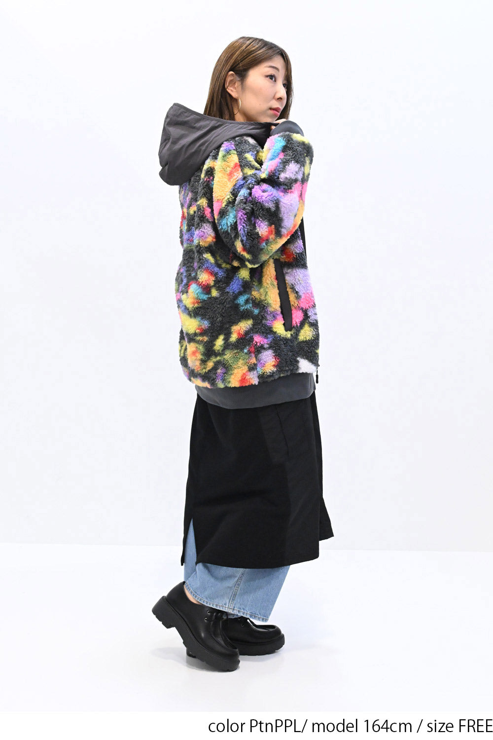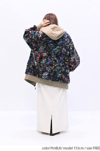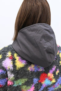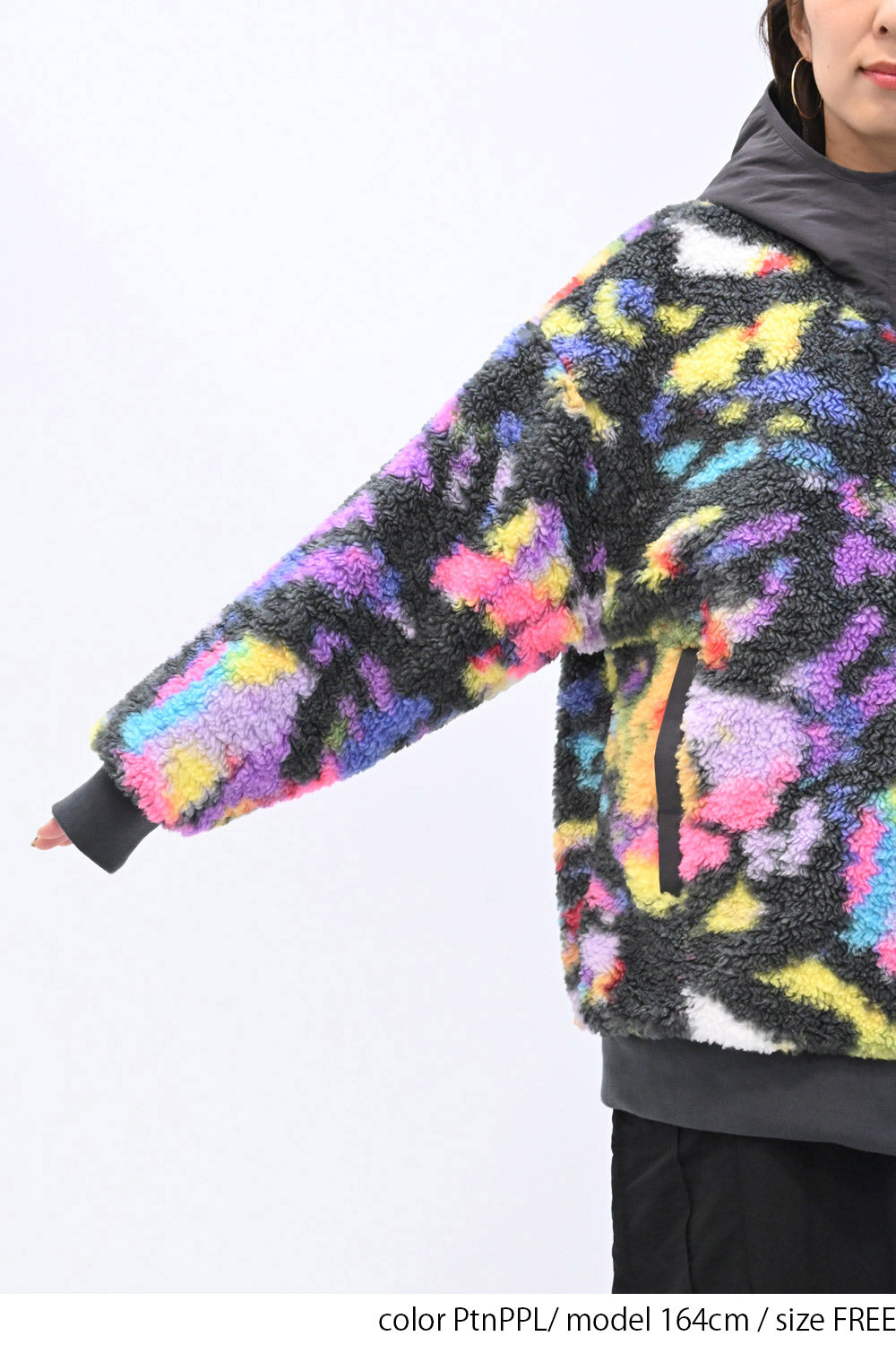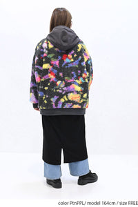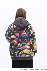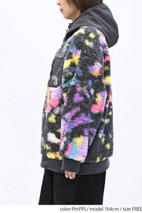 毛足のある存在感たっぷりなボア×目を惹くサイケ柄がコーデの主役として活躍します。