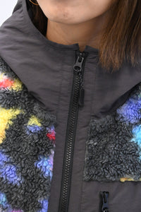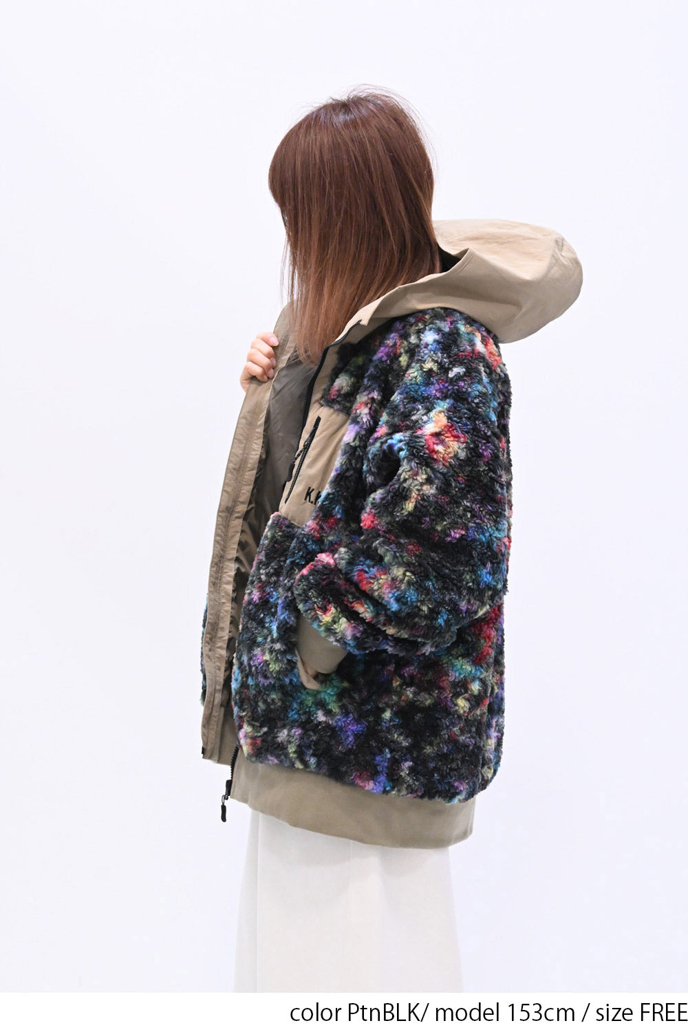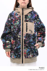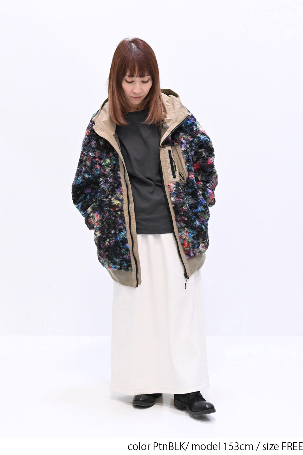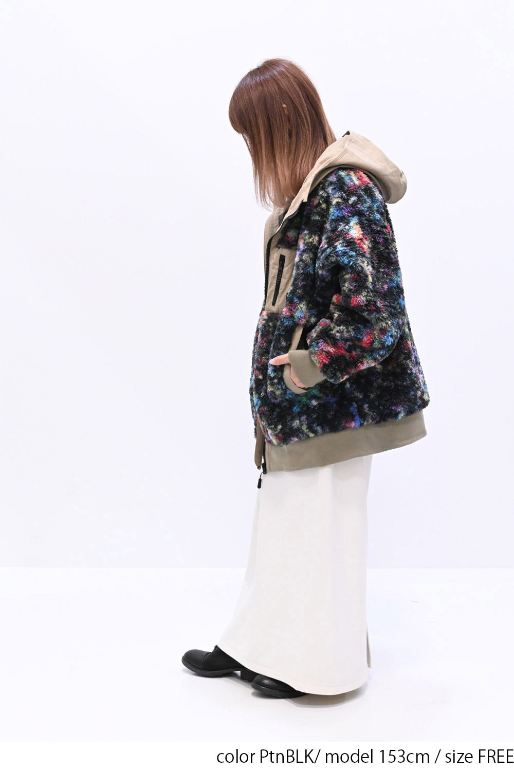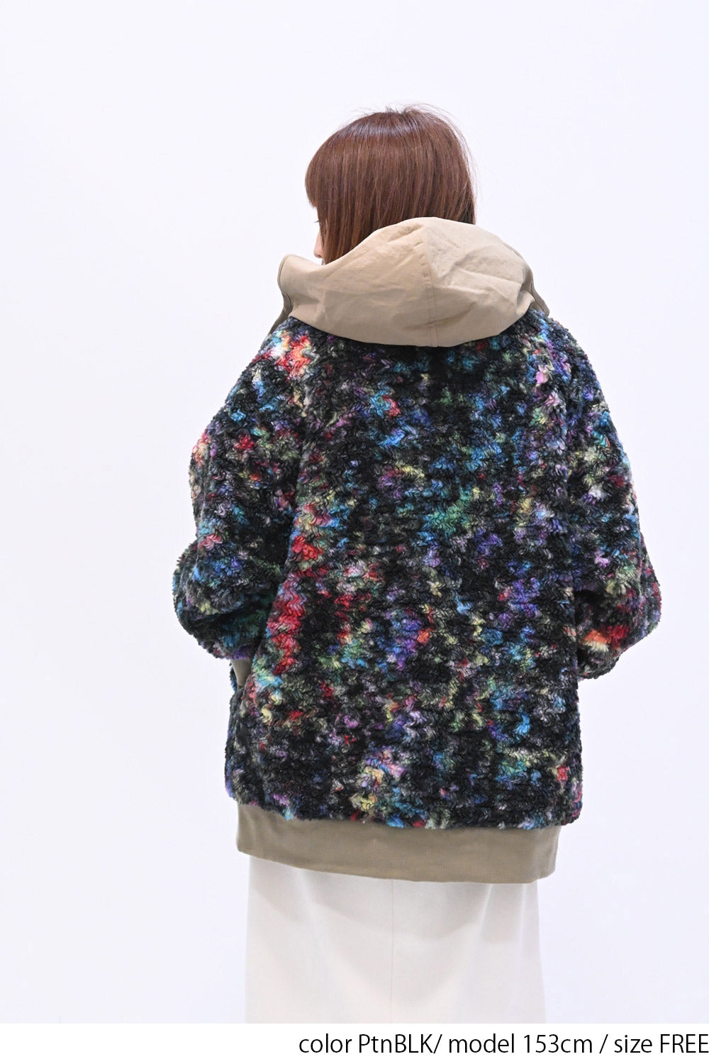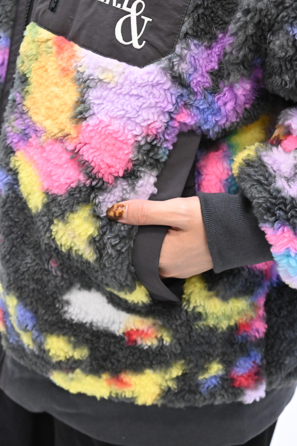 毛足のある存在感たっぷりなボア×目を惹くサイケ柄がコーデの主役として活躍します。