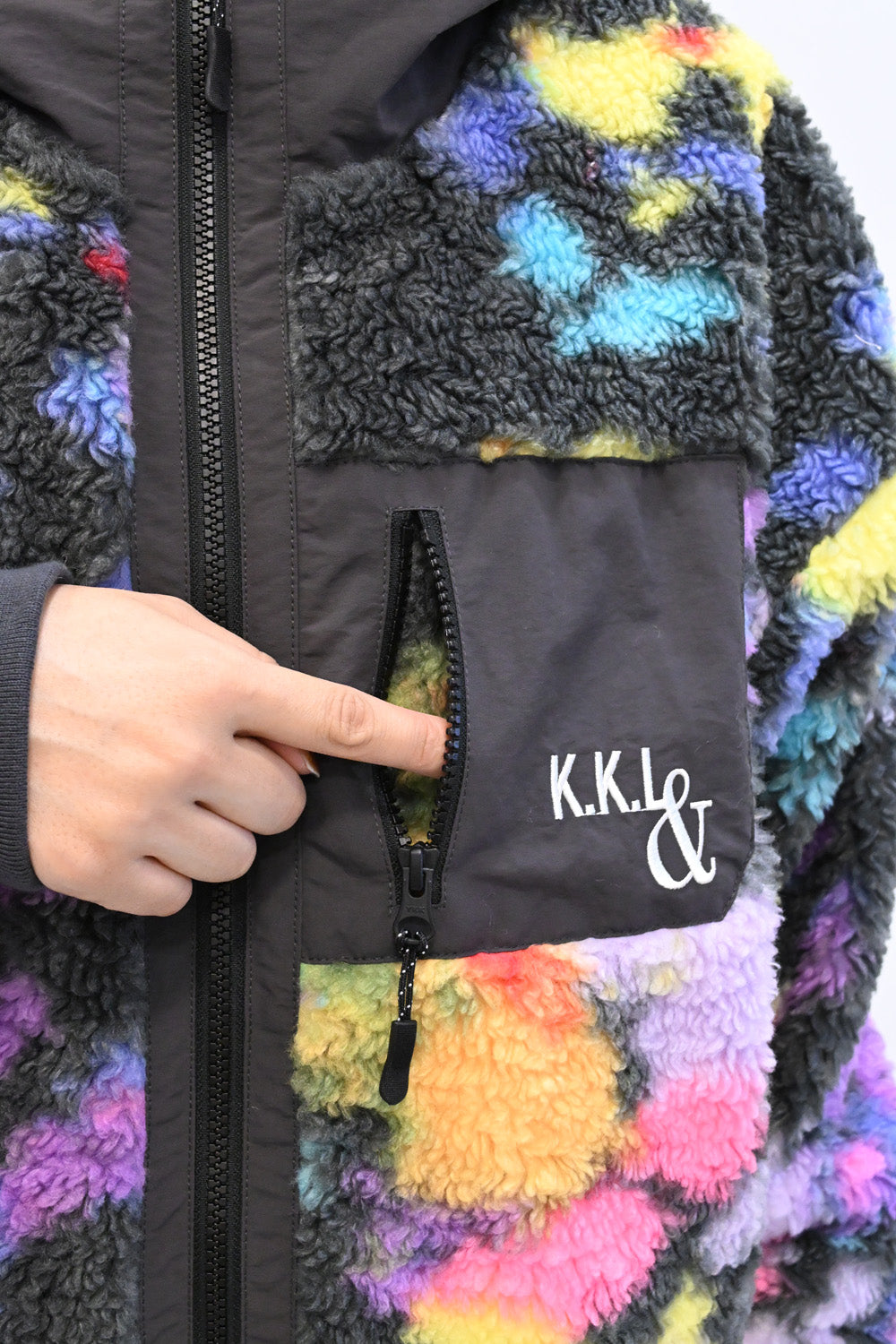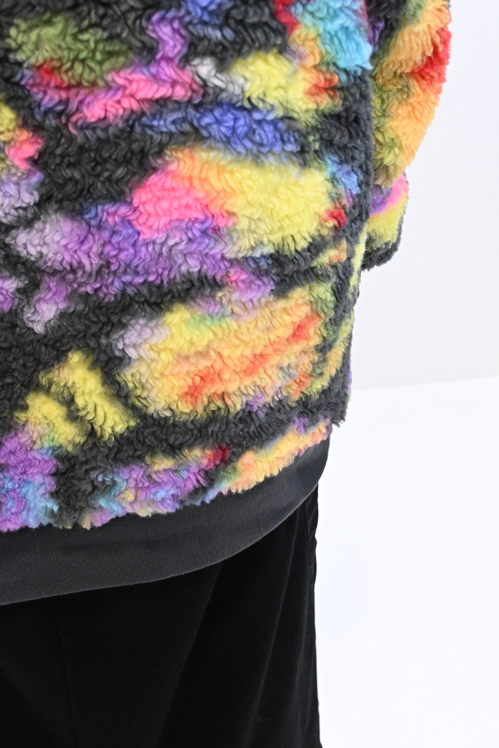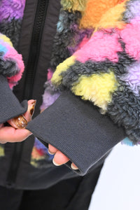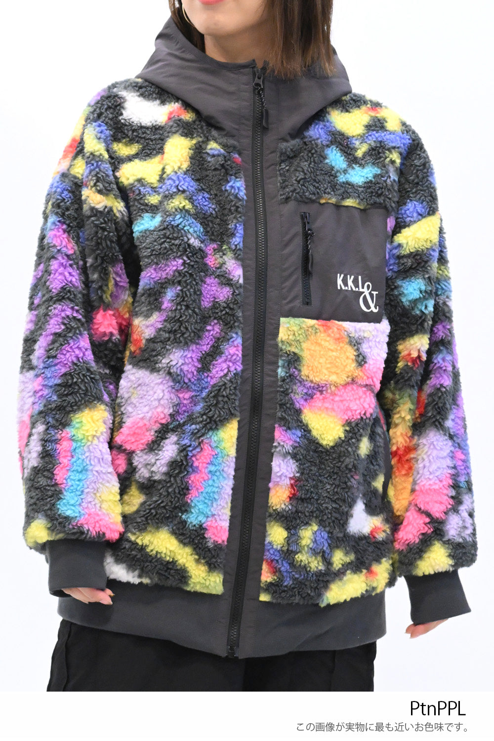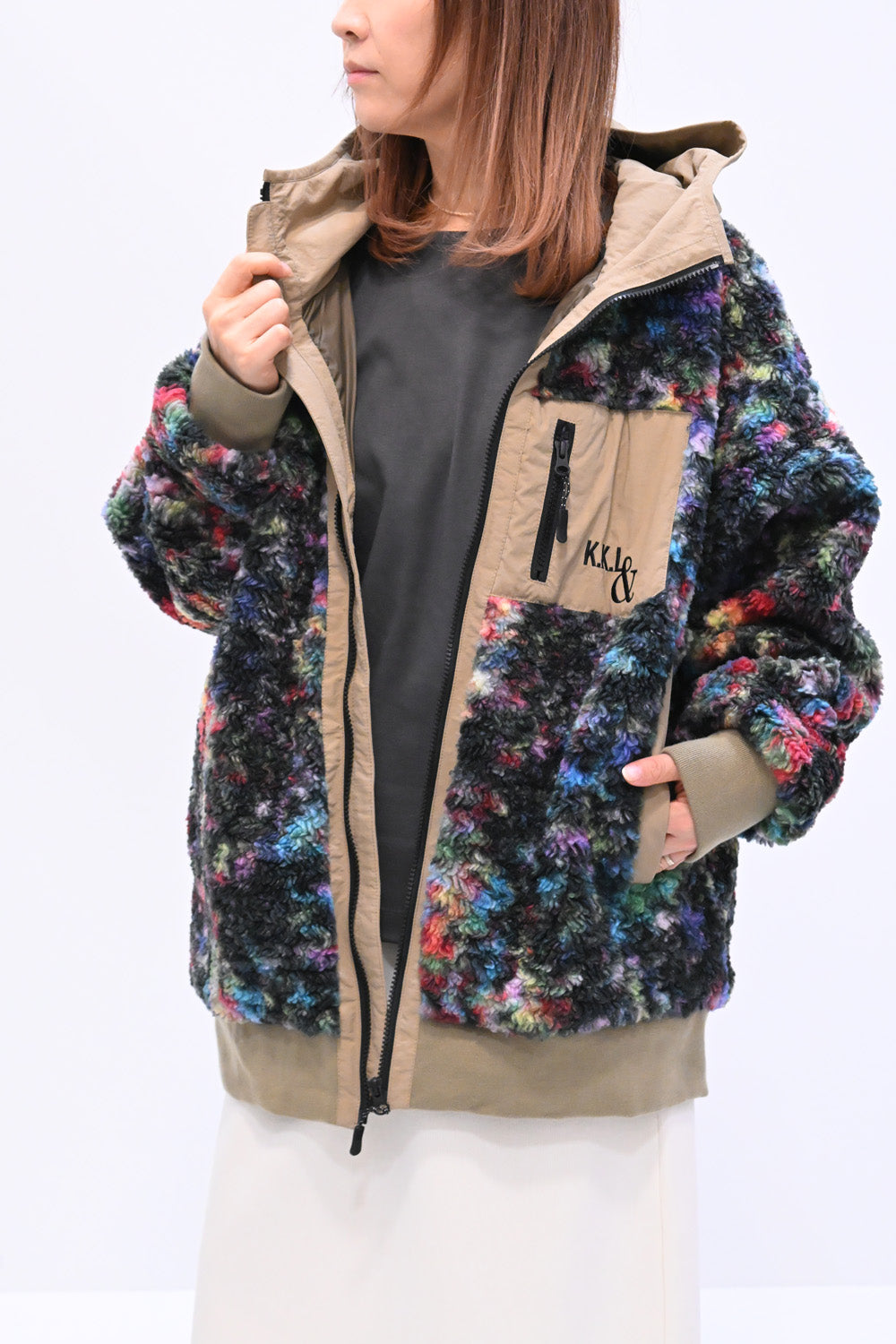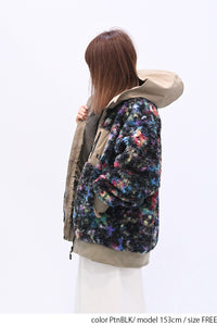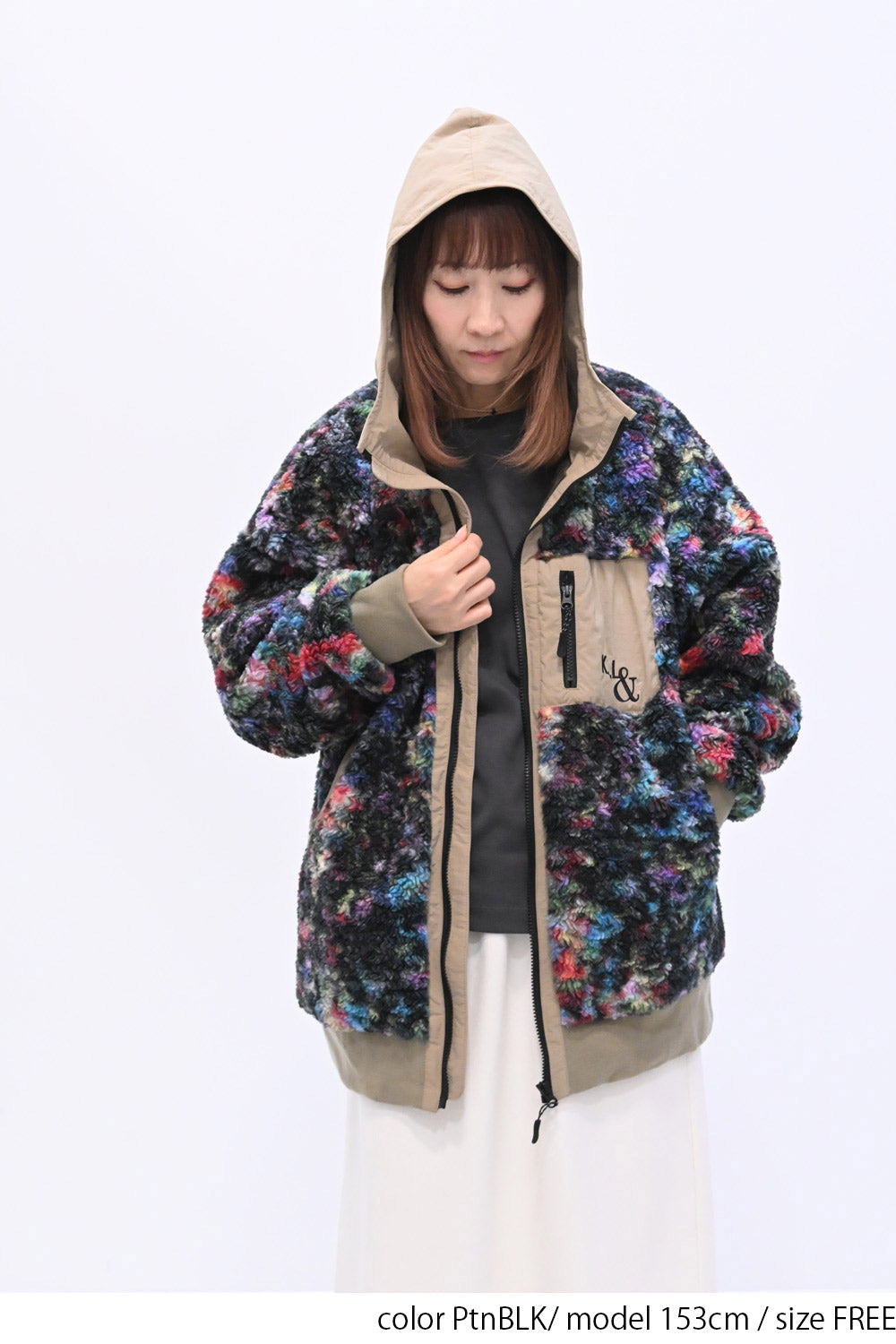 毛足のある存在感たっぷりなボア×目を惹くサイケ柄がコーデの主役として活躍します。