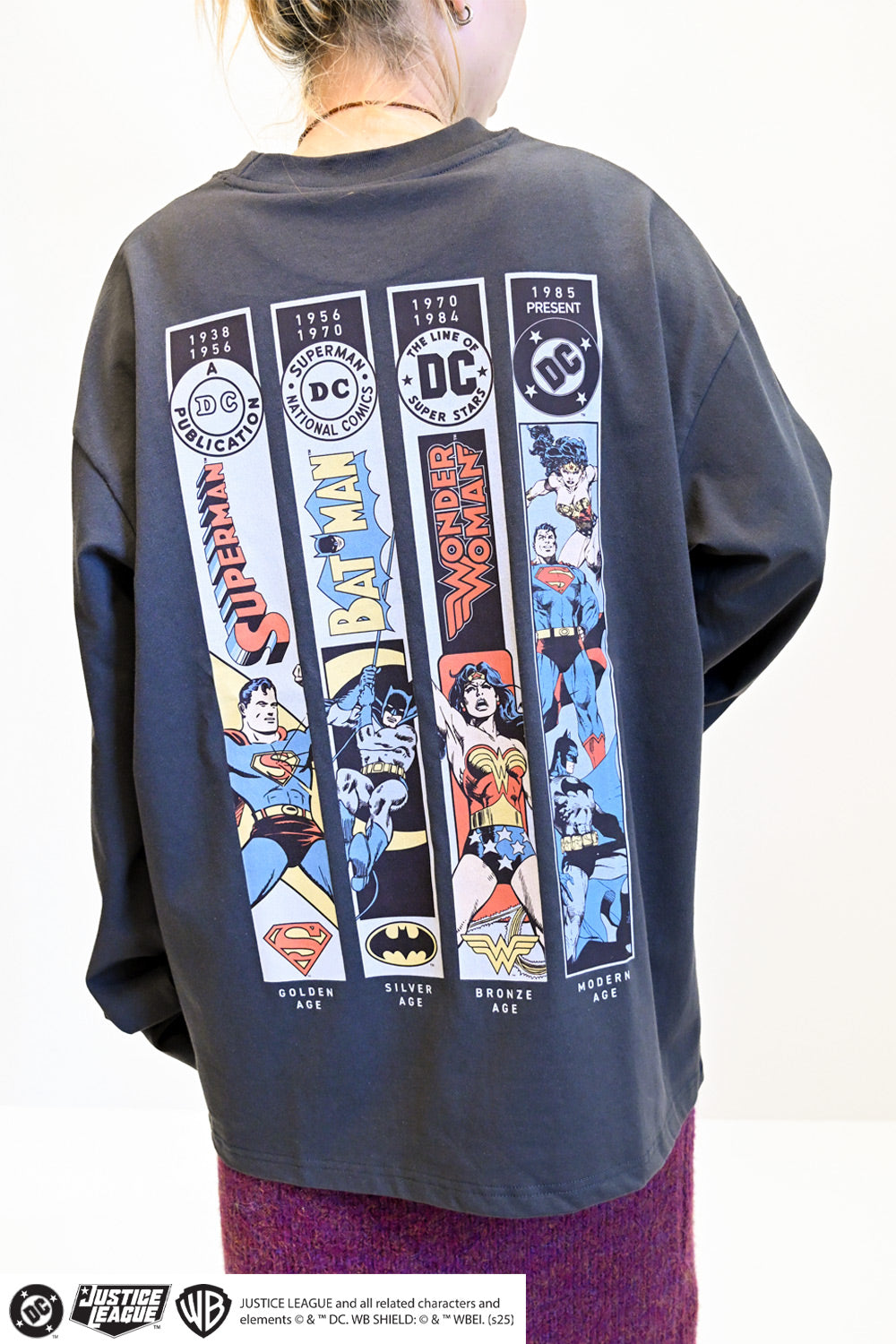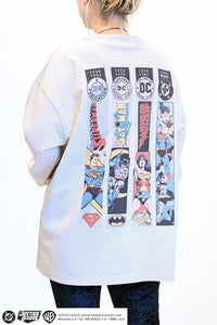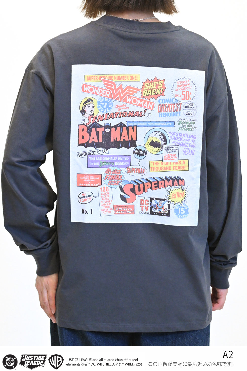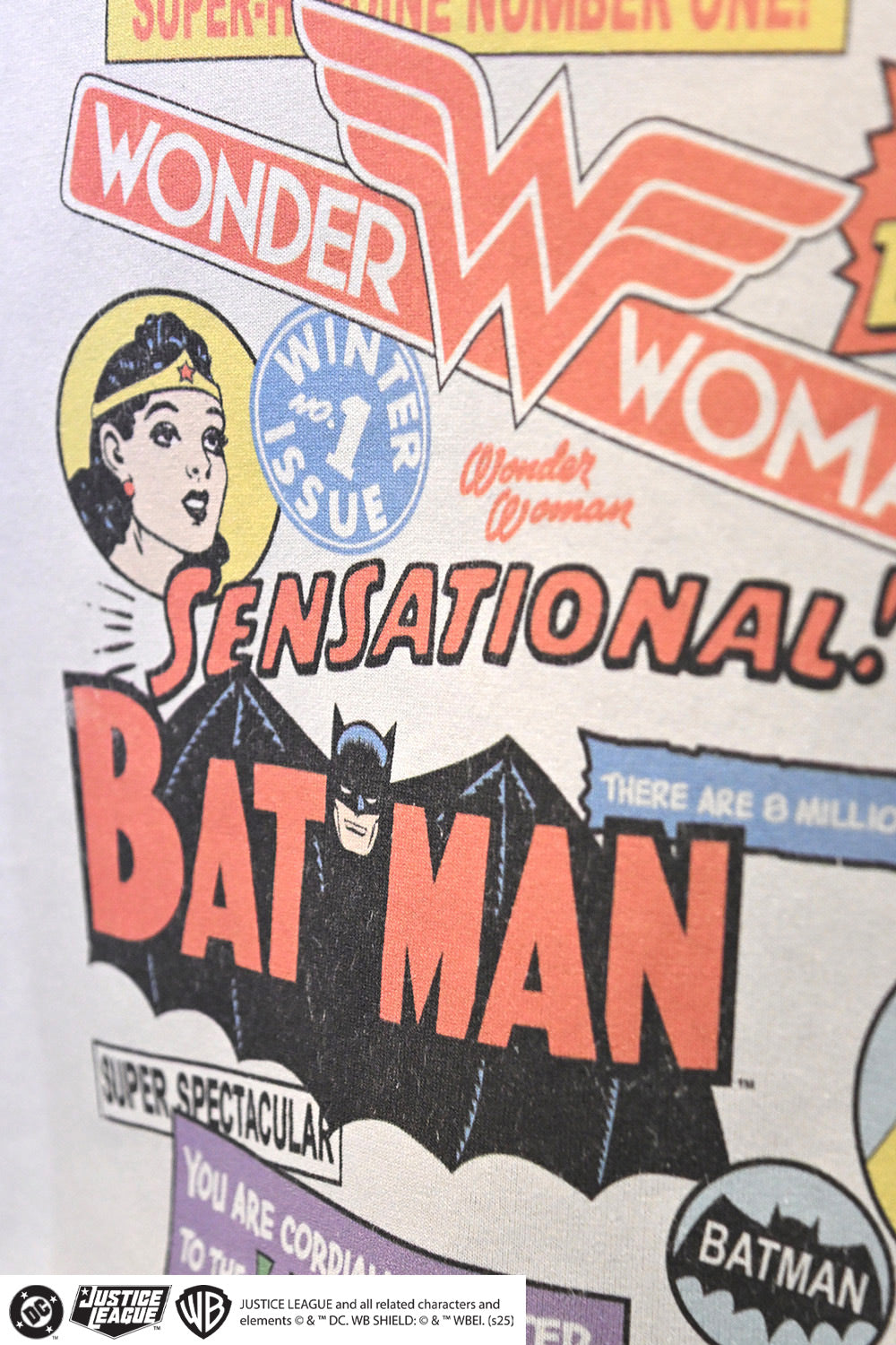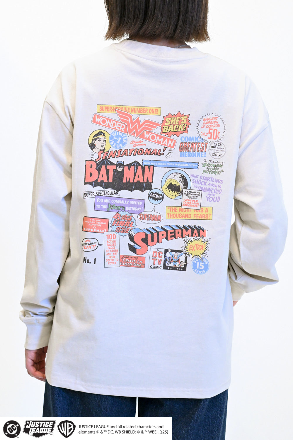 世界的に大人気の『スーパーマン』『バットマン』『ワンダーウーマン』イラストをバックに描いたプリントロンT。