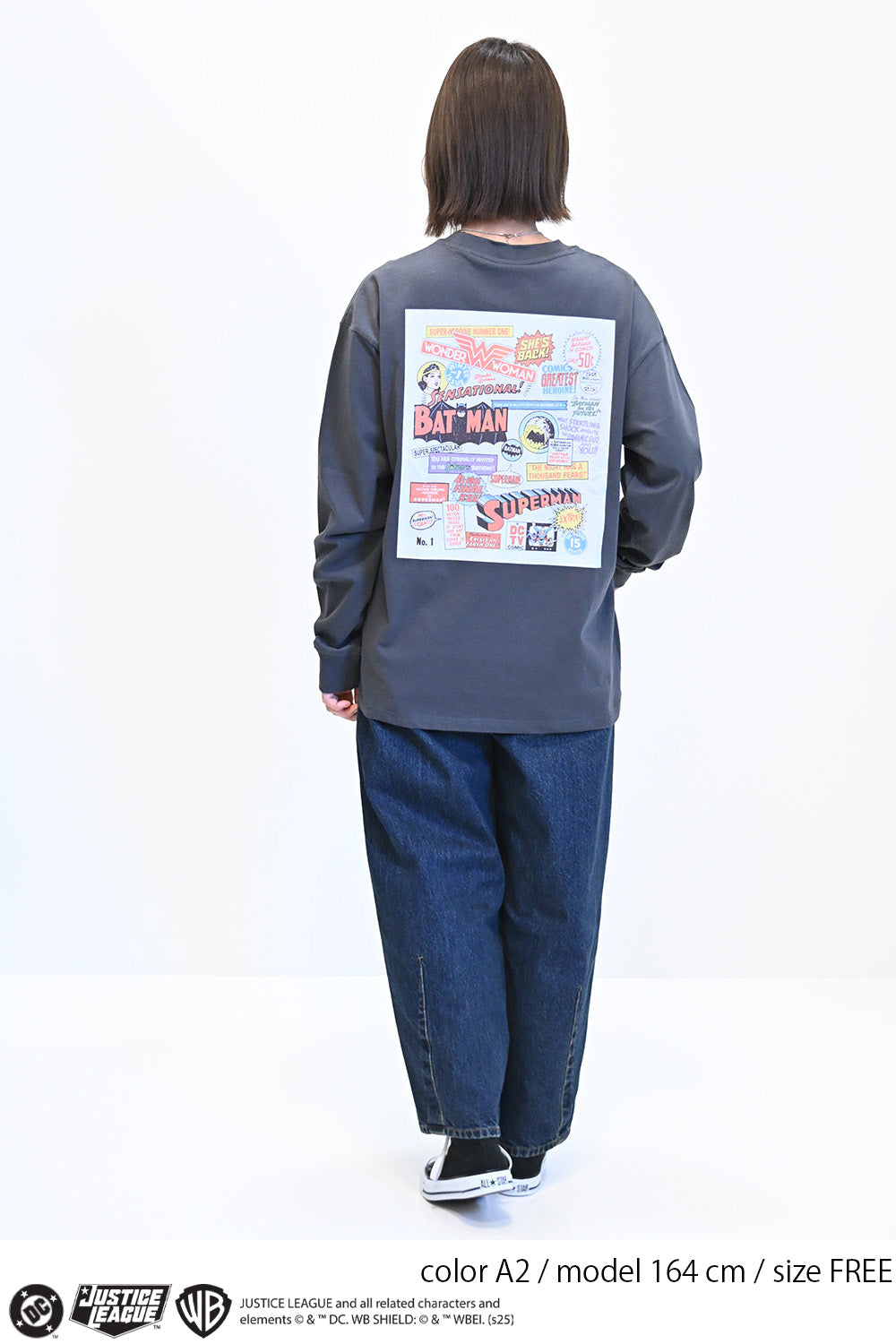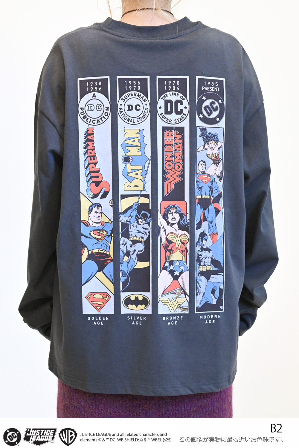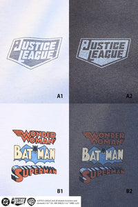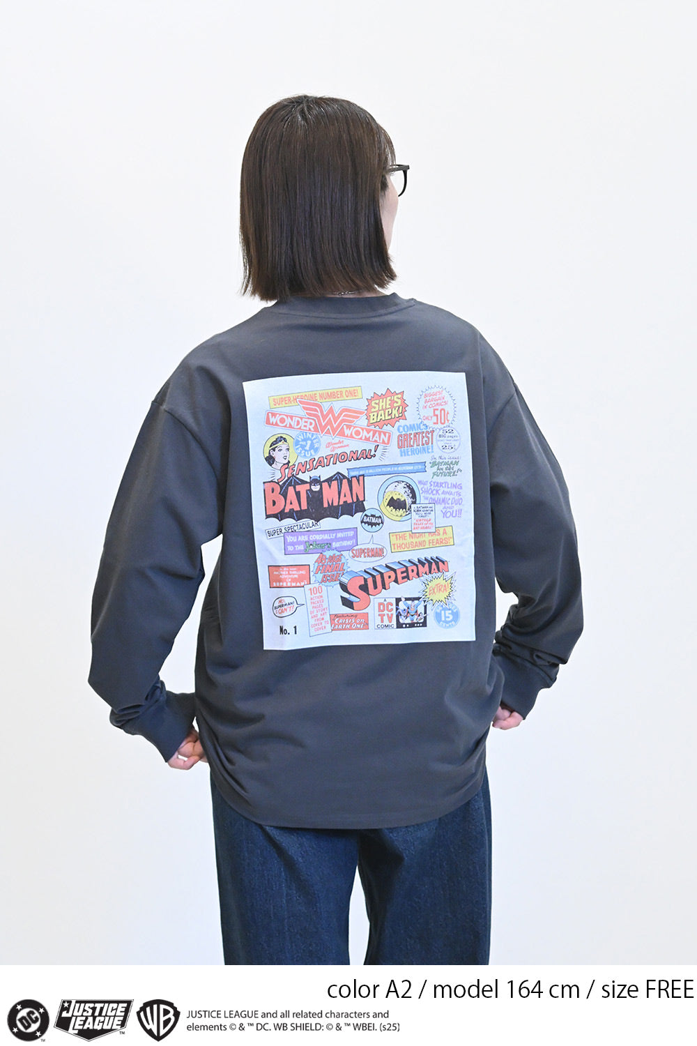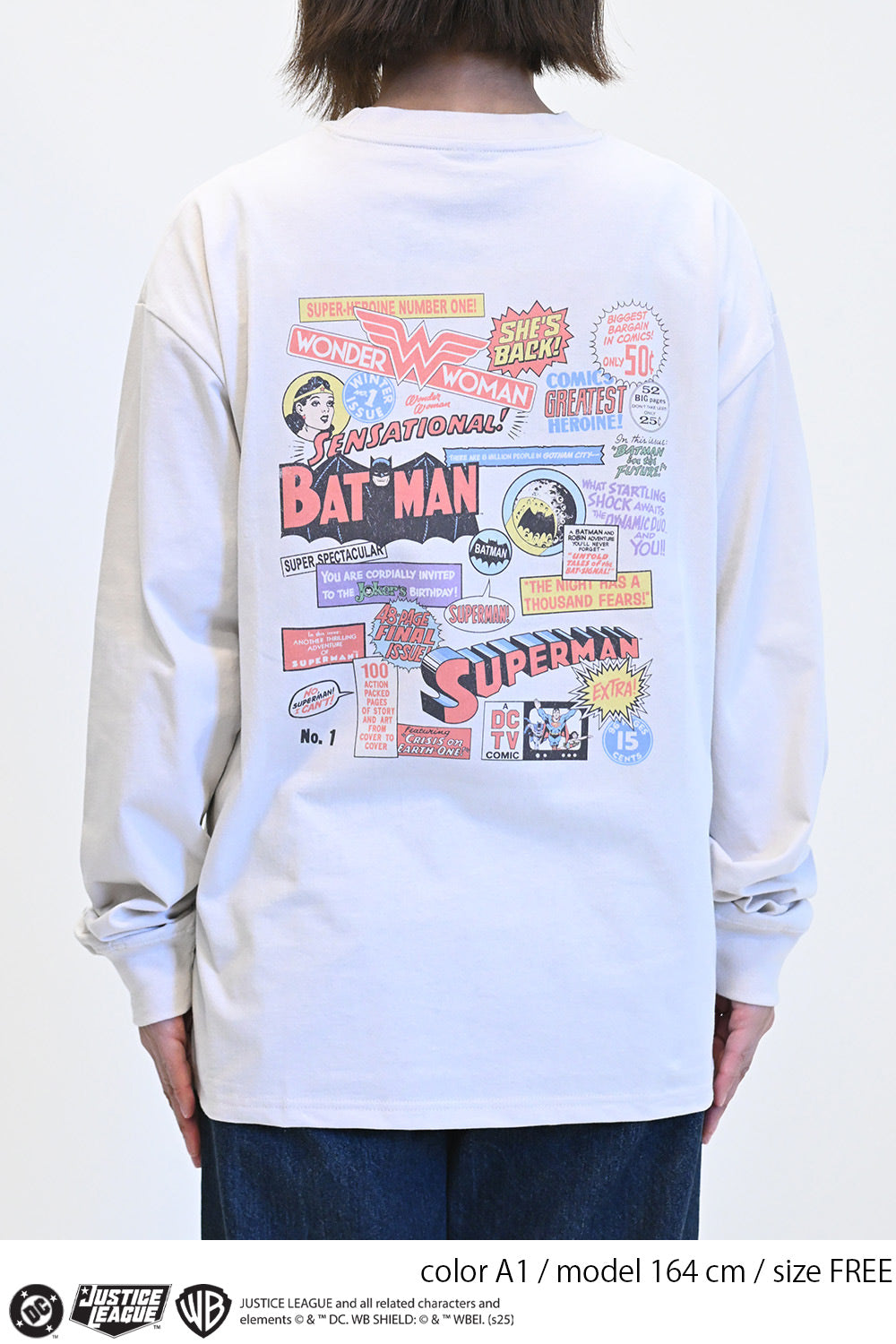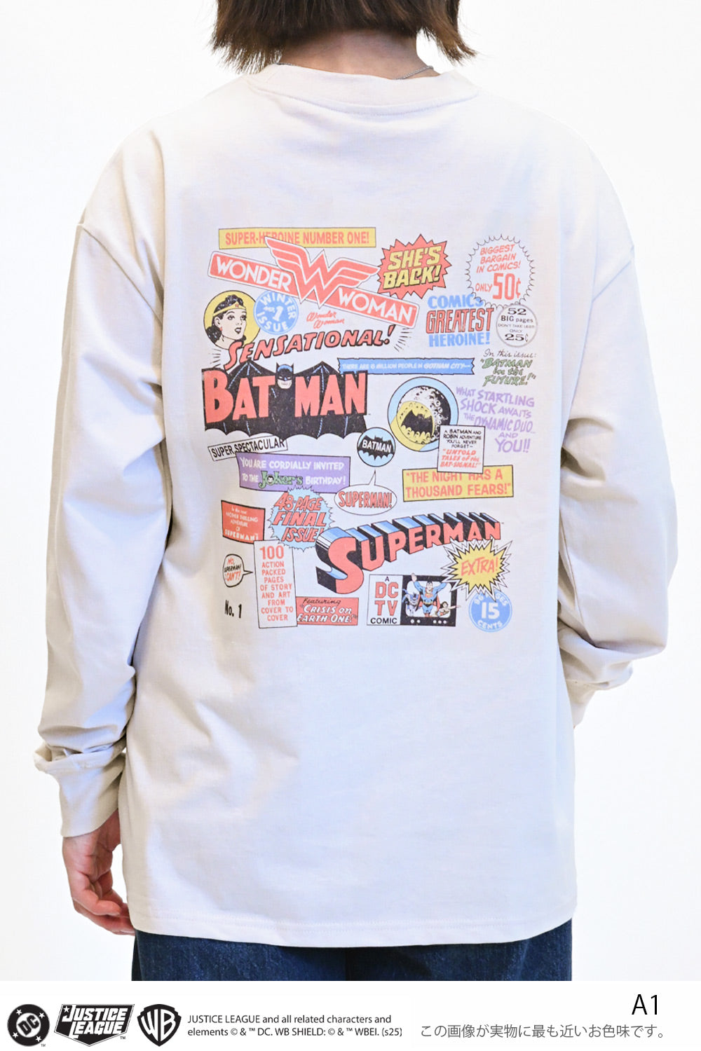 世界的に大人気の『スーパーマン』『バットマン』『ワンダーウーマン』イラストをバックに描いたプリントロンT。