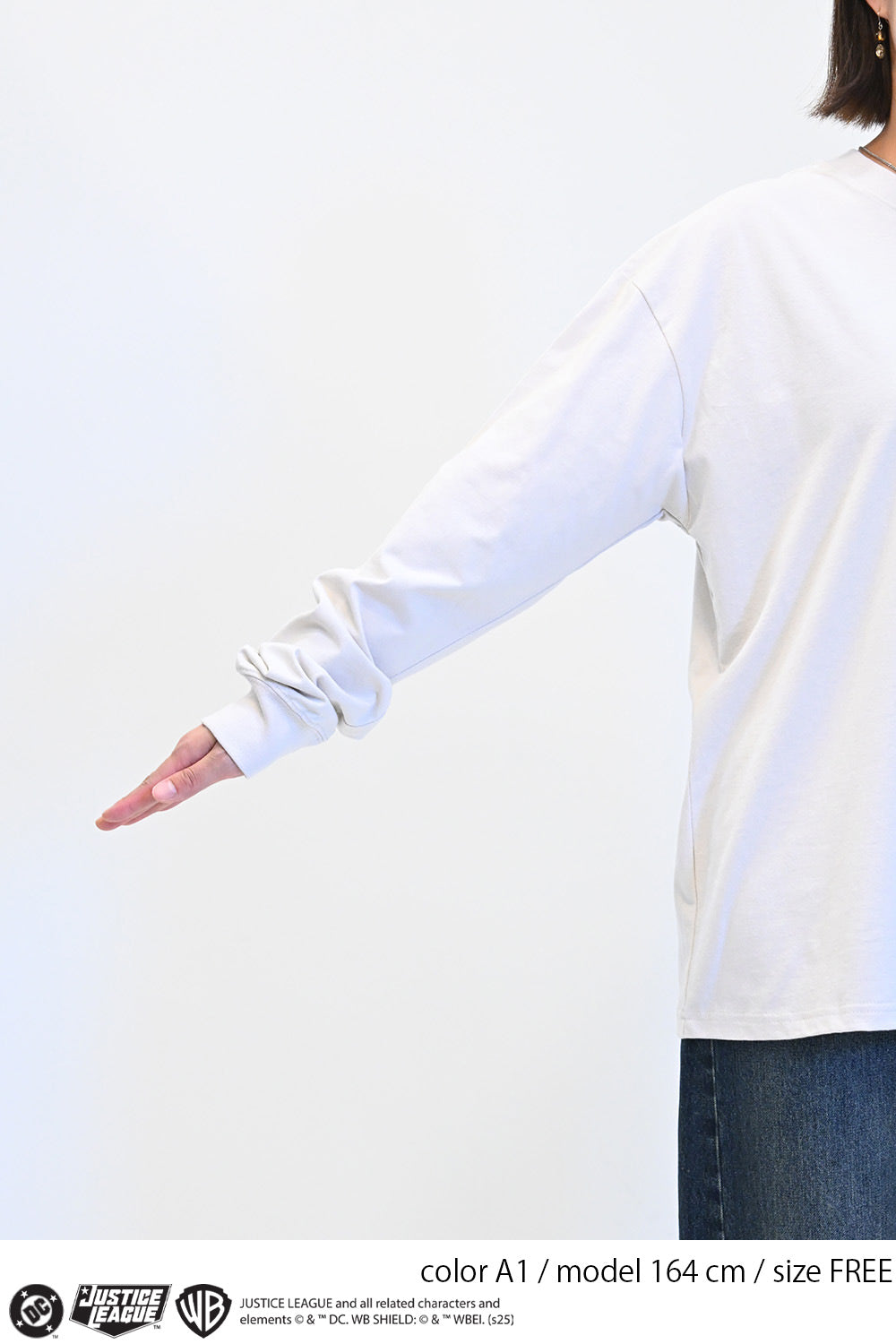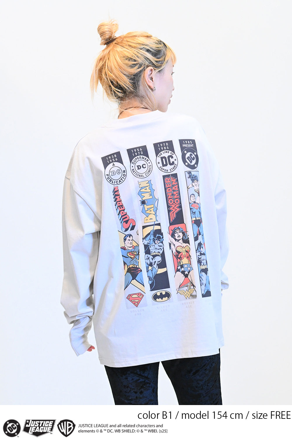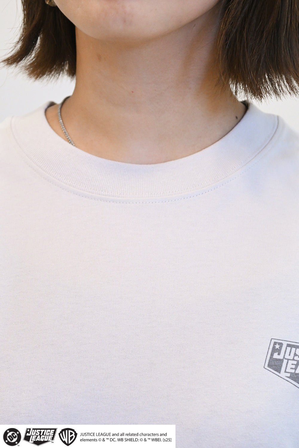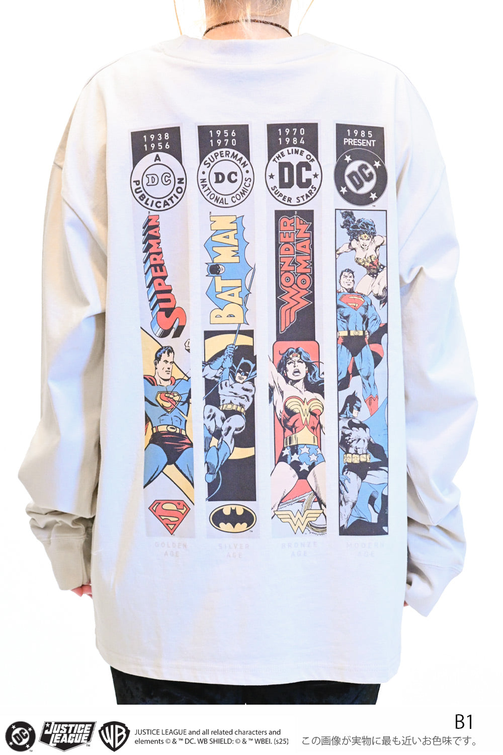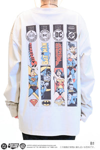 世界的に大人気の『スーパーマン』『バットマン』『ワンダーウーマン』イラストをバックに描いたプリントロンT。
