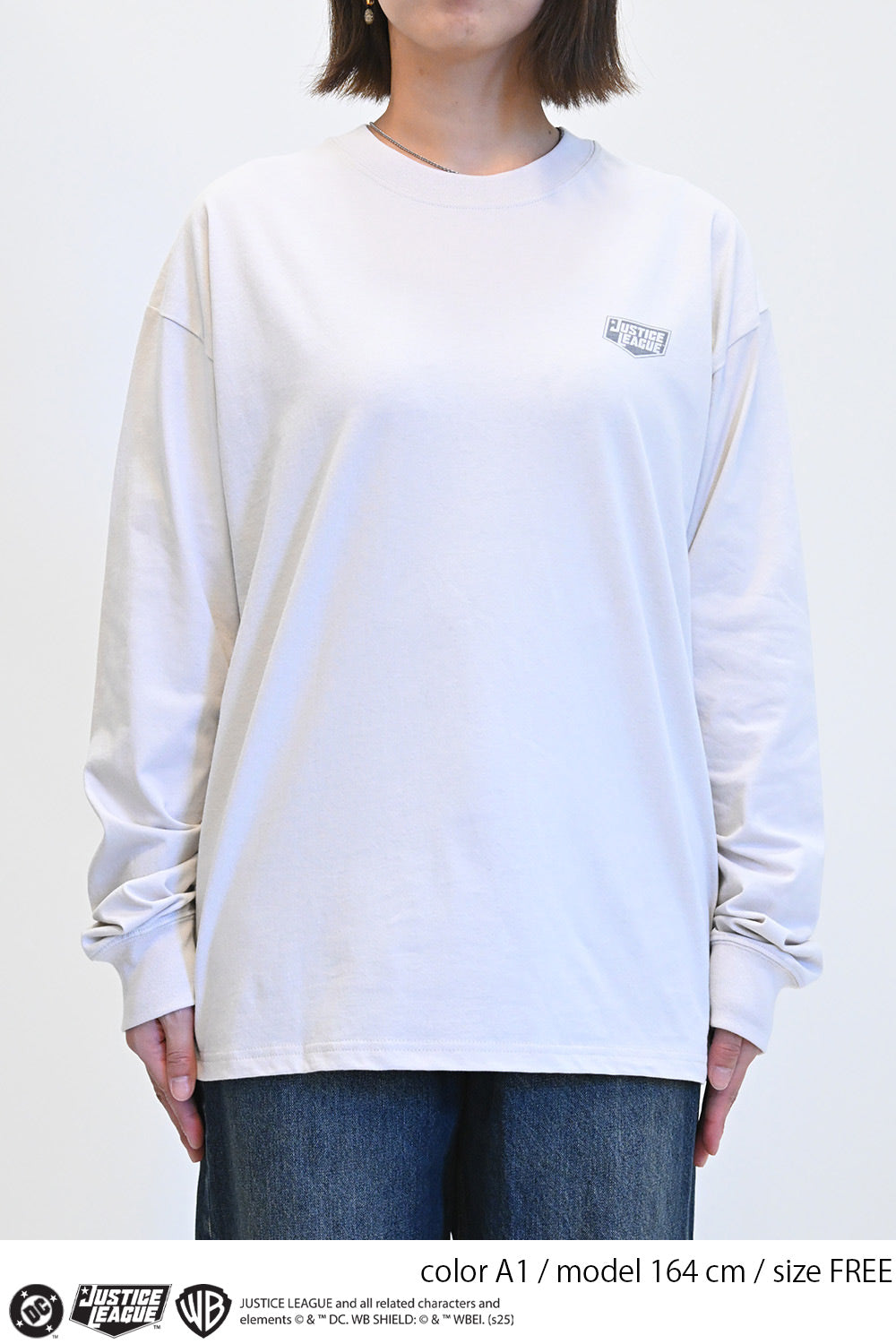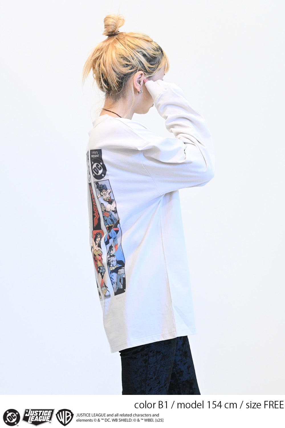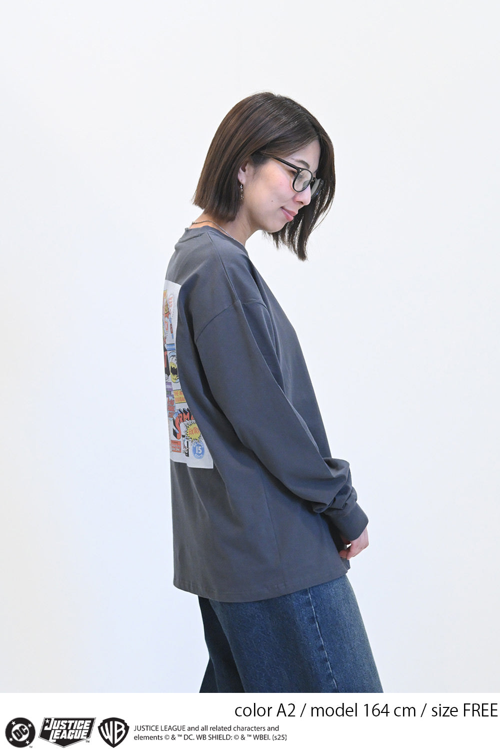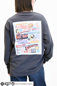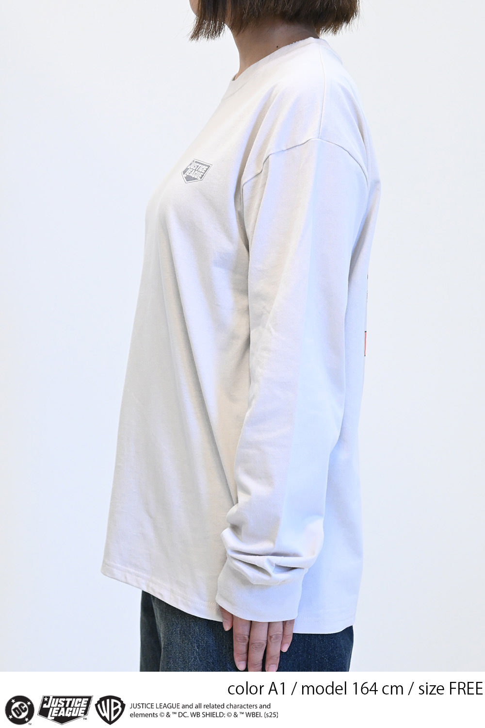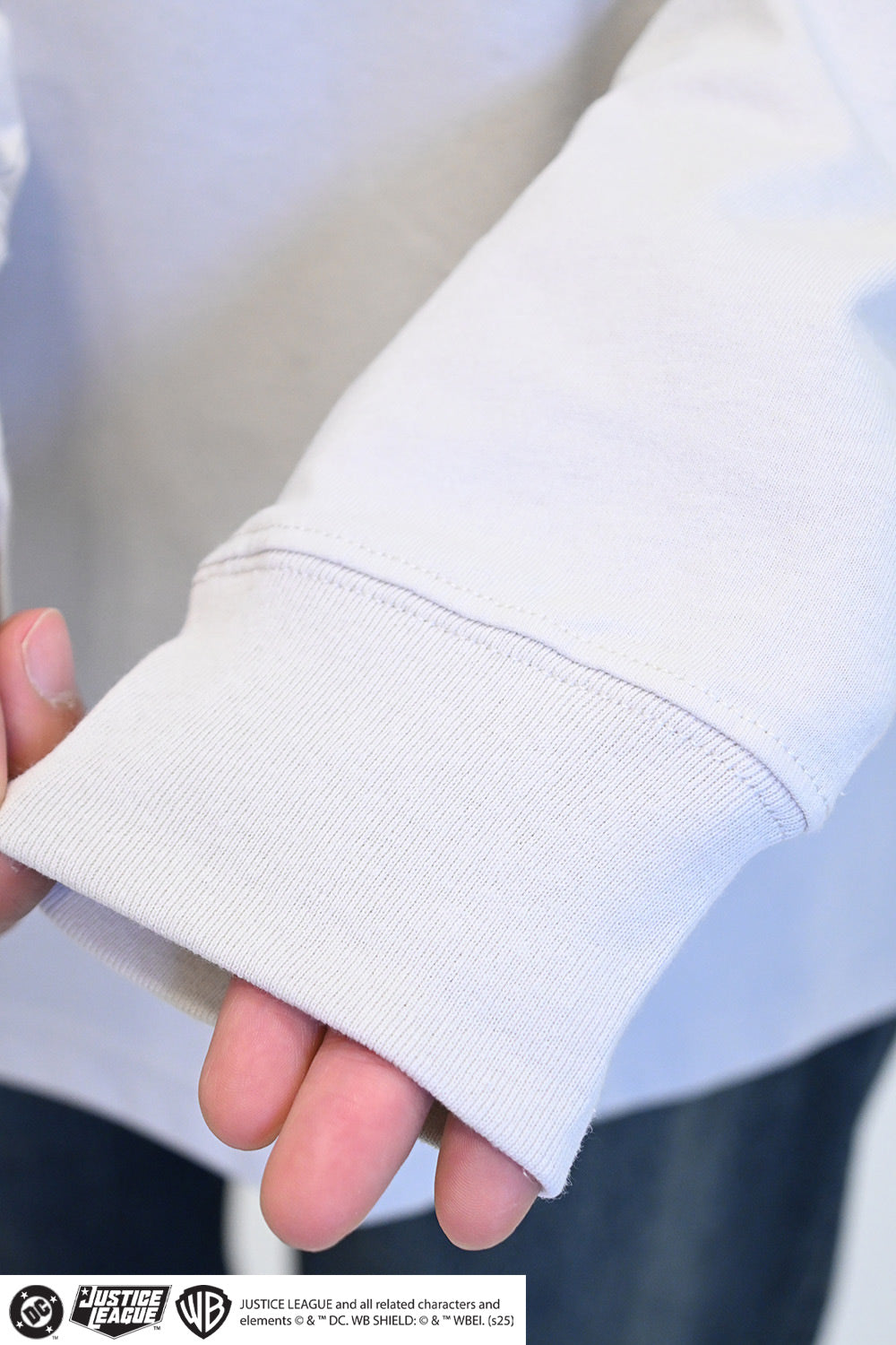世界的に大人気の『スーパーマン』『バットマン』『ワンダーウーマン』イラストをバックに描いたプリントロンT。