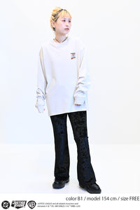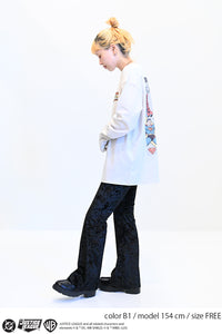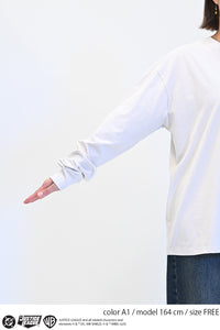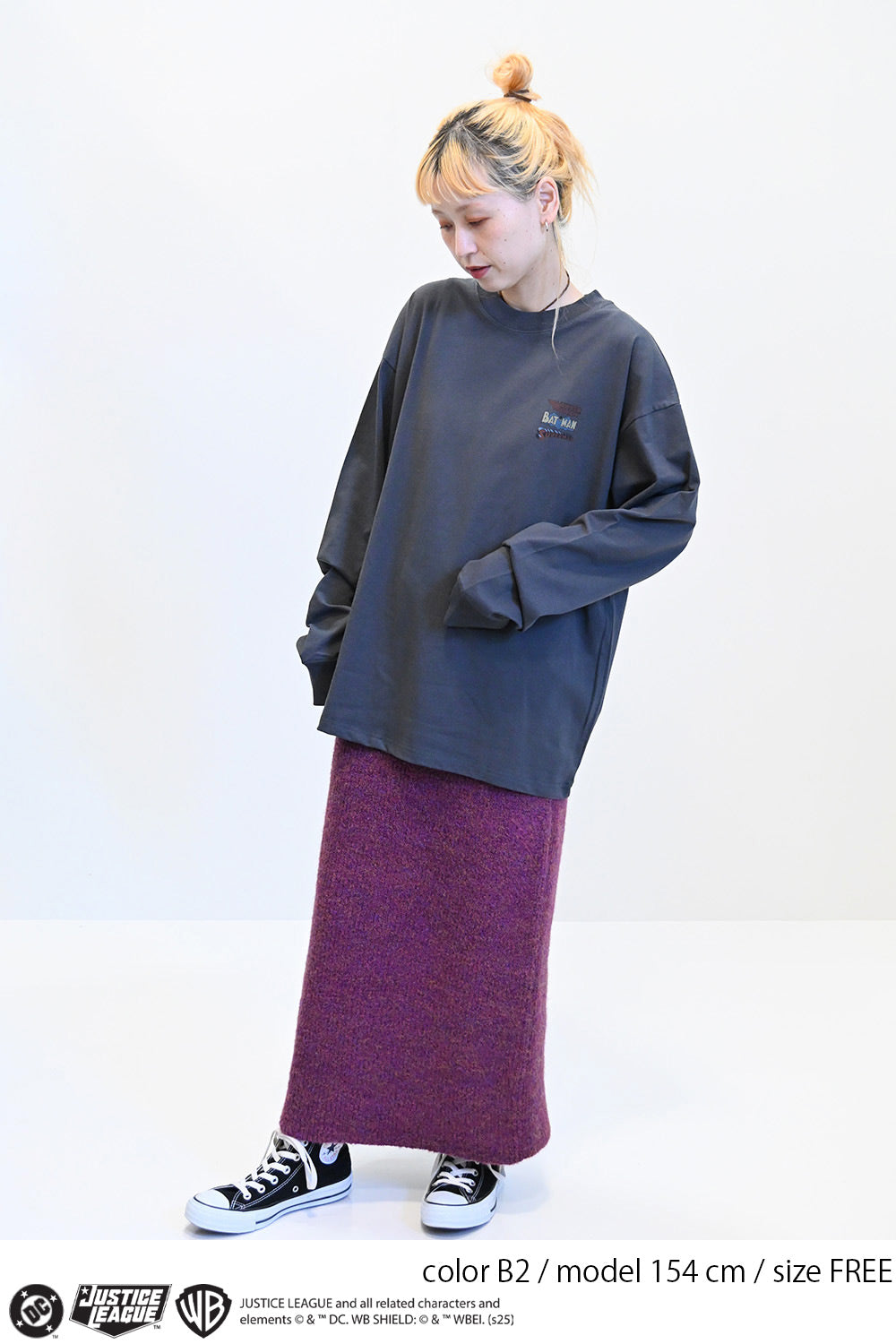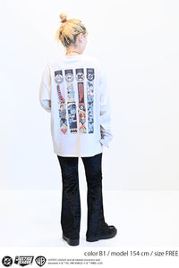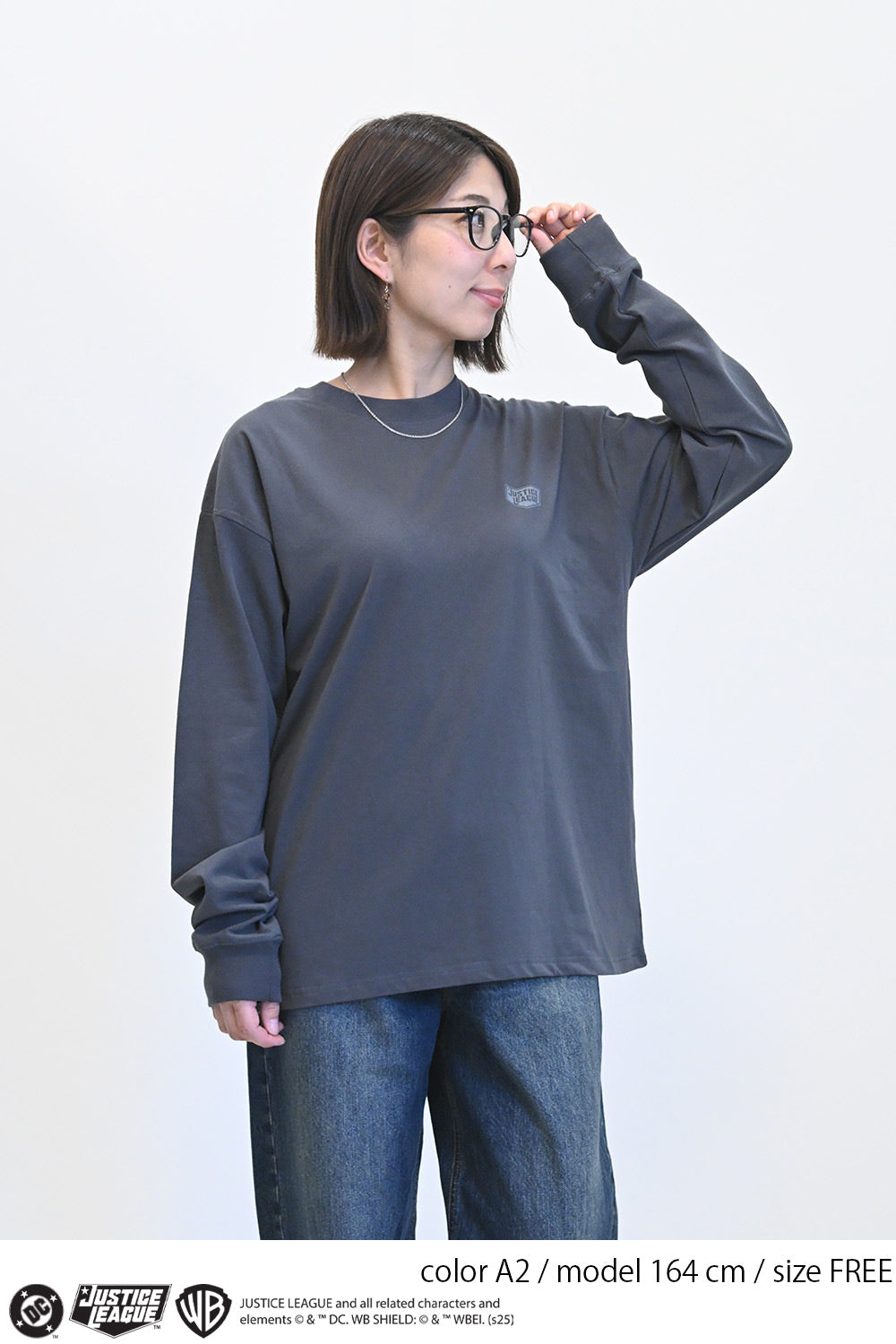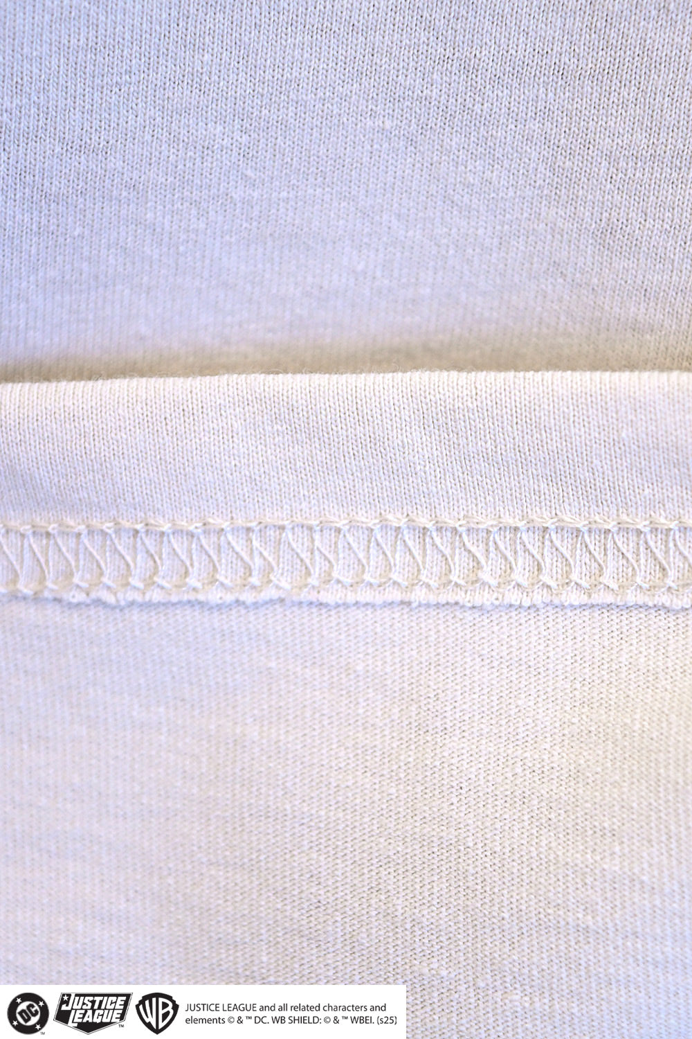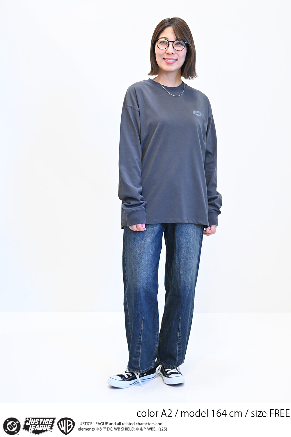 世界的に大人気の『スーパーマン』『バットマン』『ワンダーウーマン』イラストをバックに描いたプリントロンT。