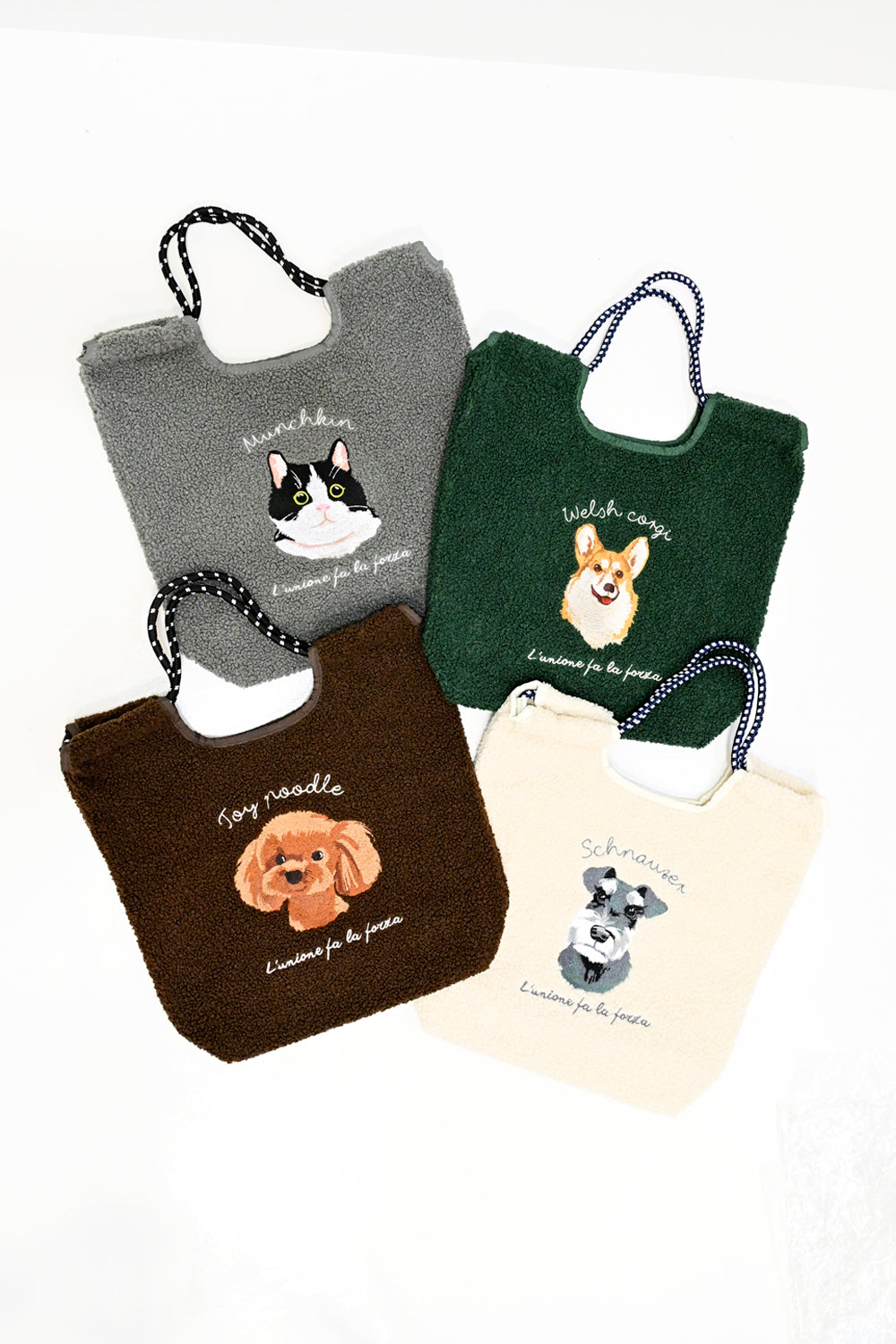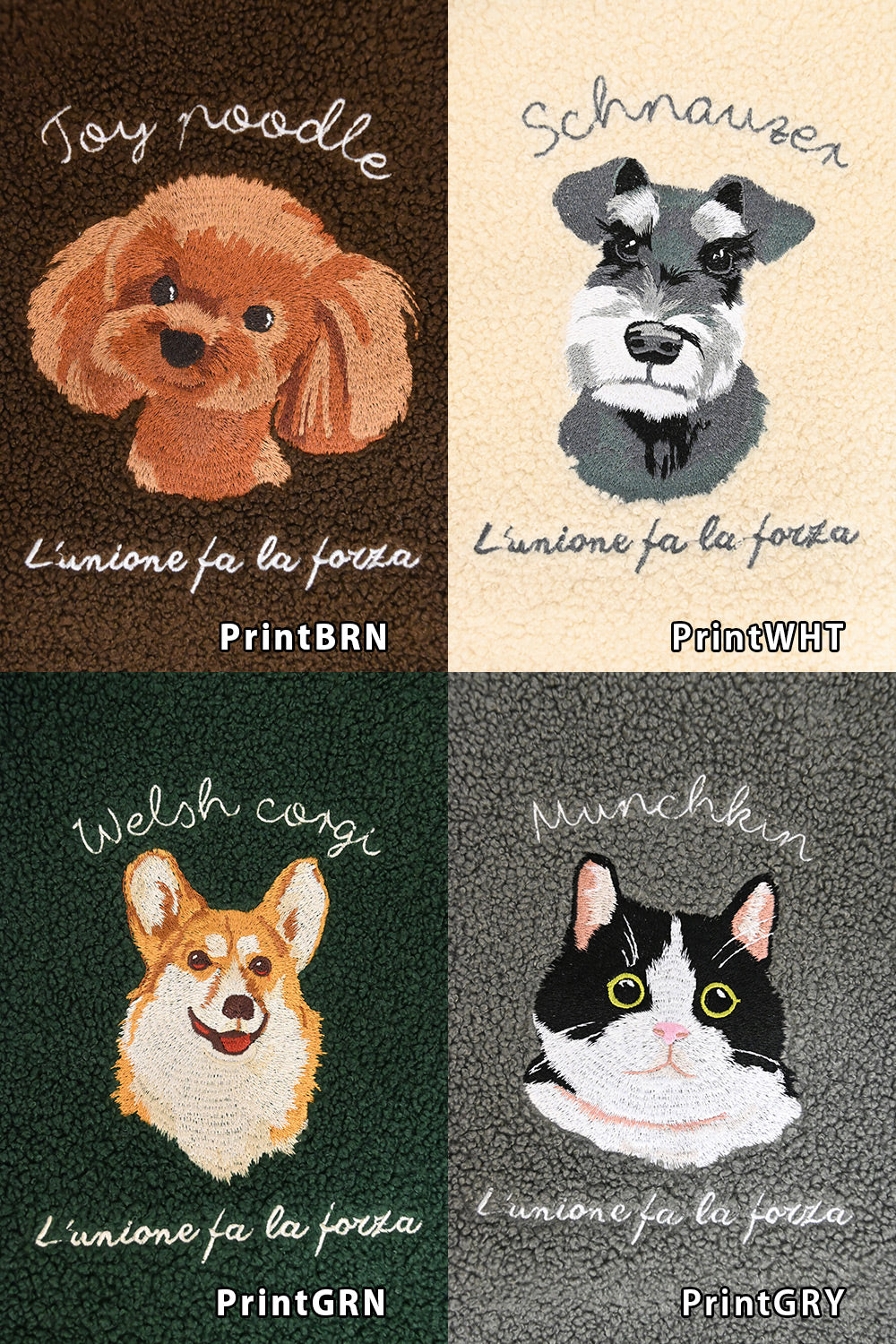 PrintWHT(シュナウザー)、PrintGRY(マンチカン)、PrintBRN(トイプー)、PrintGRN(コーギー)