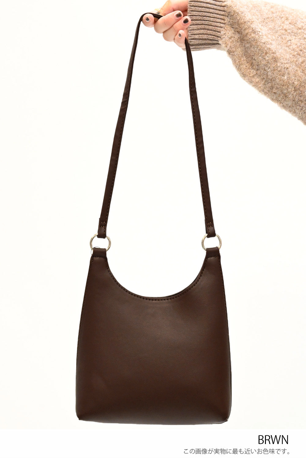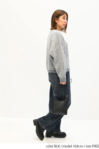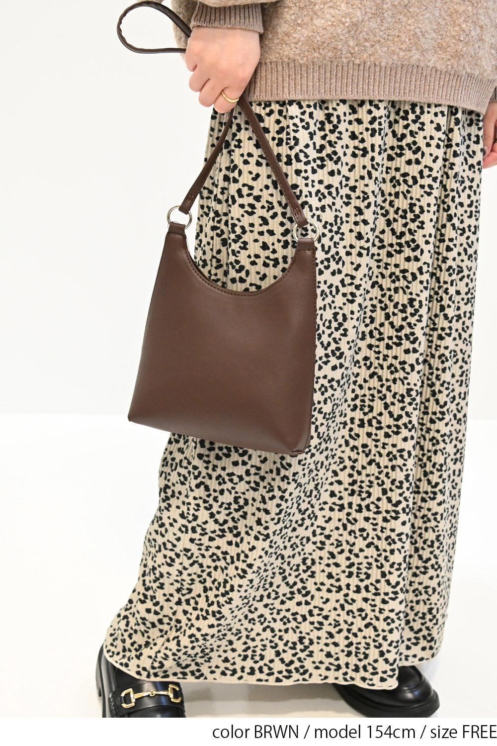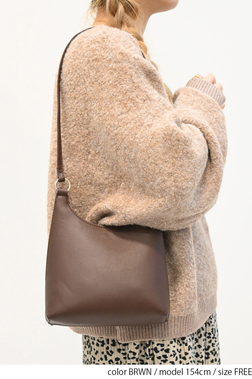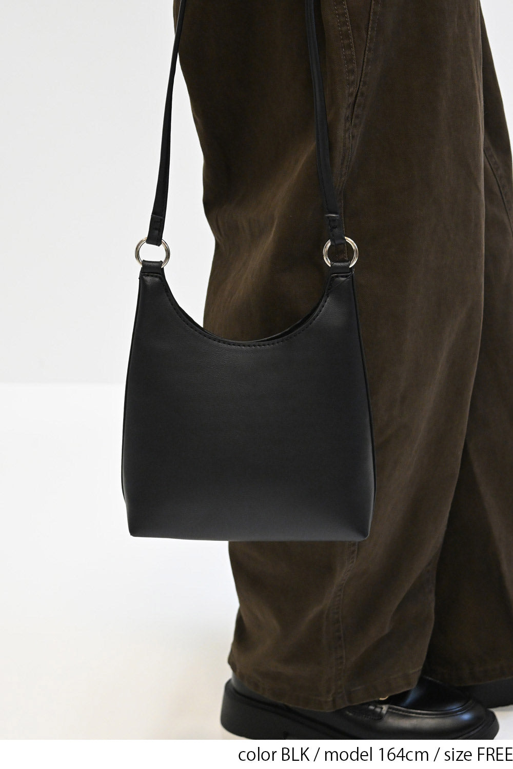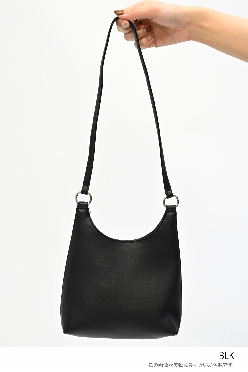 艶のある合皮素材と、持ち手の付け根にあしらわれたシルバーリングが印象的なミニバッグ。