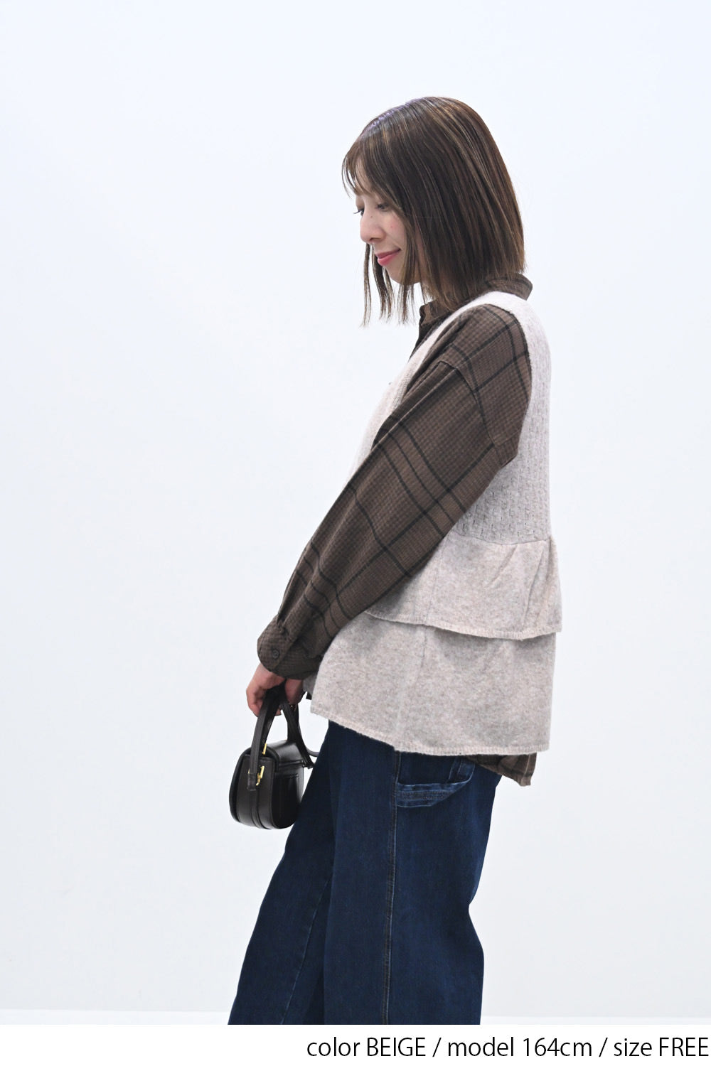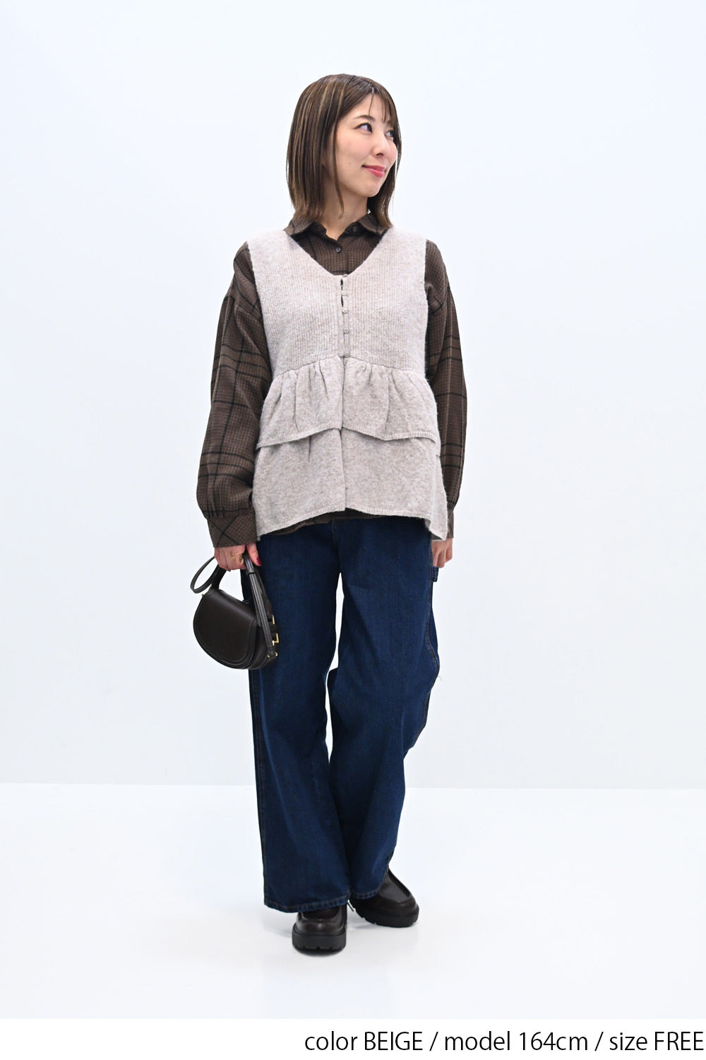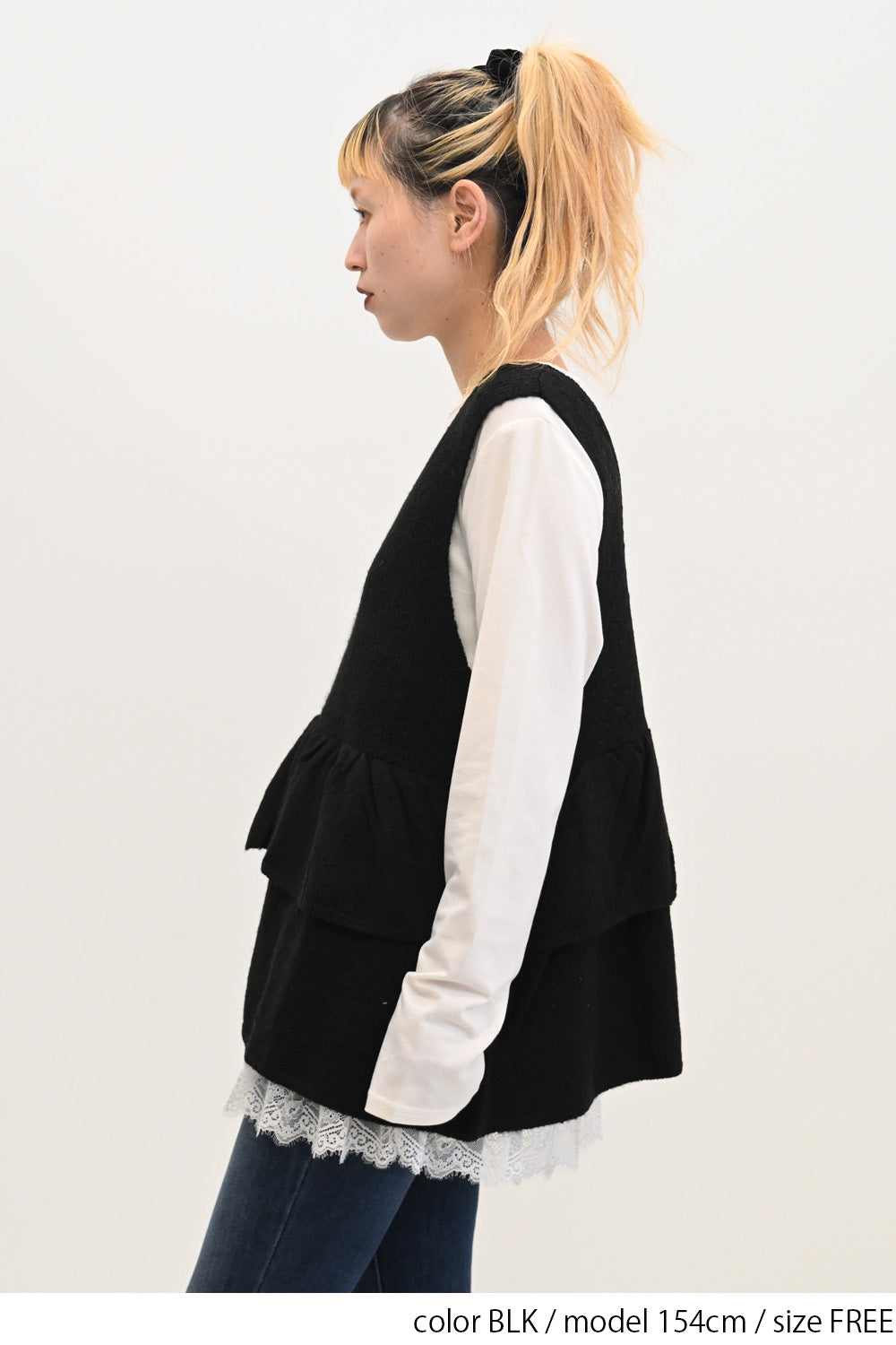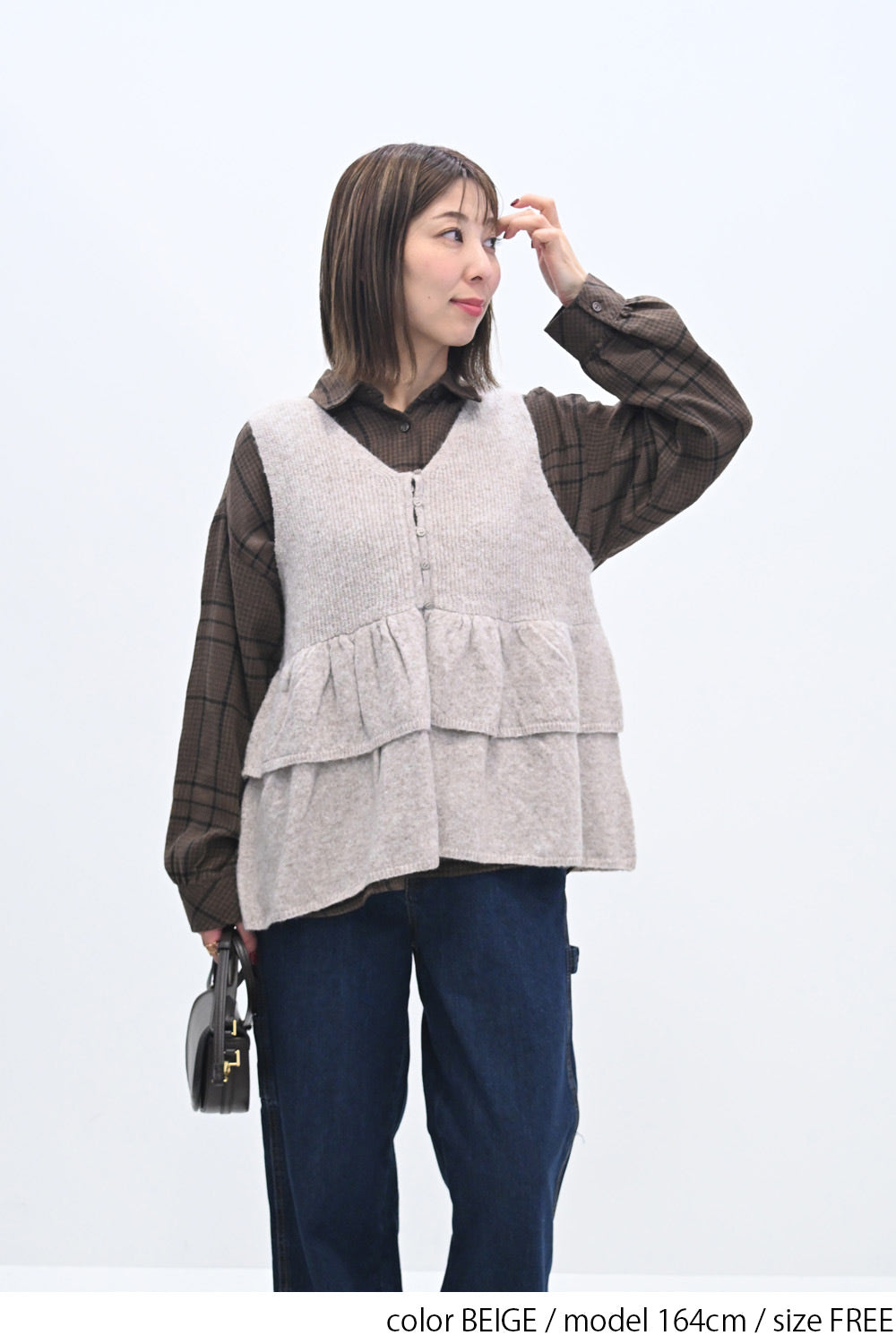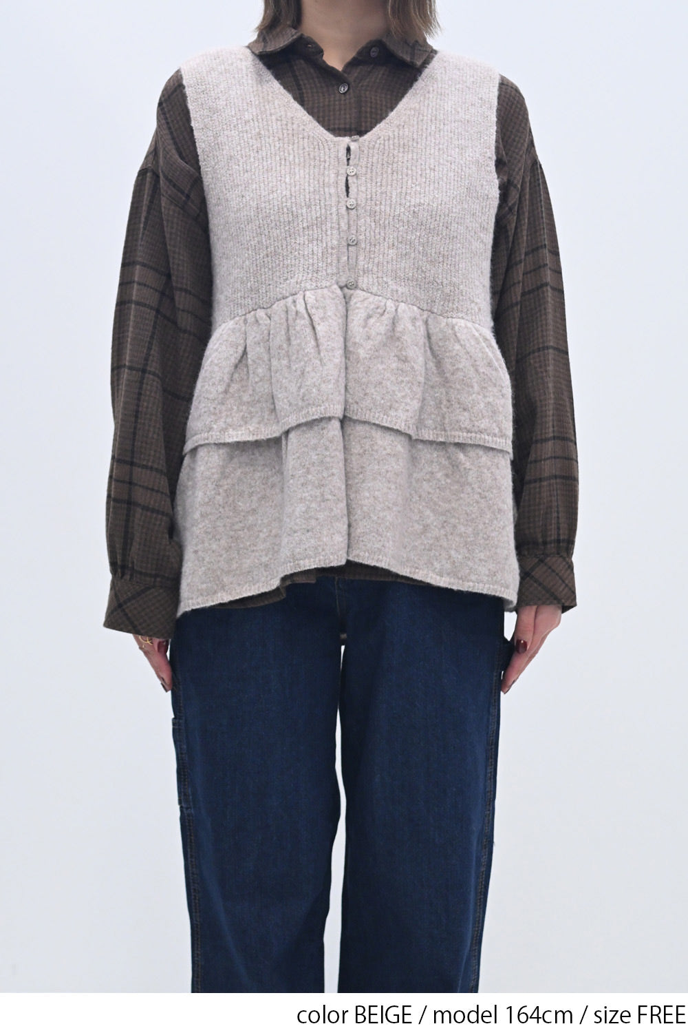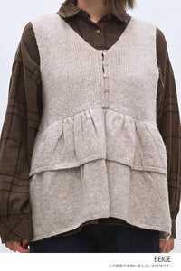 ふんわりとした裾フリルが目を惹く、愛らしい雰囲気のニットベスト。