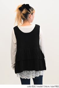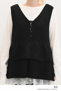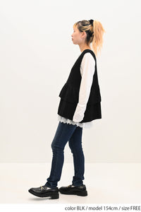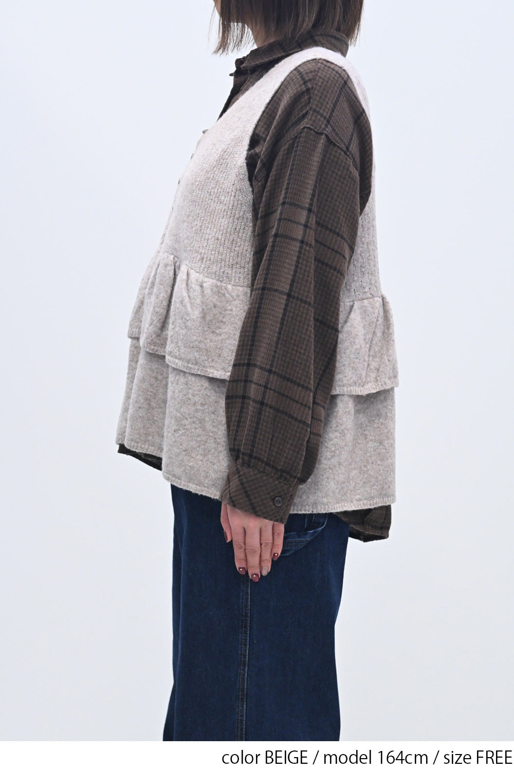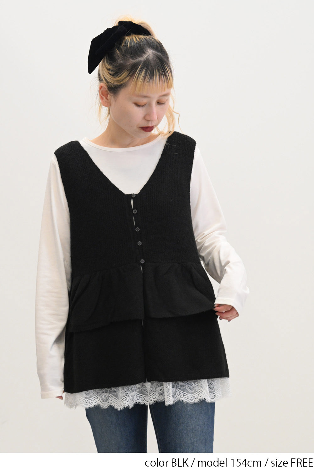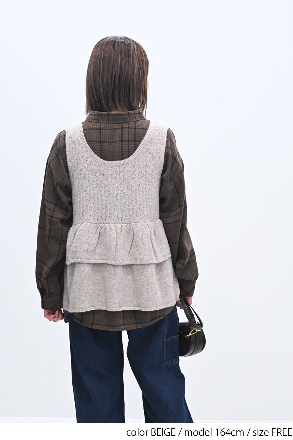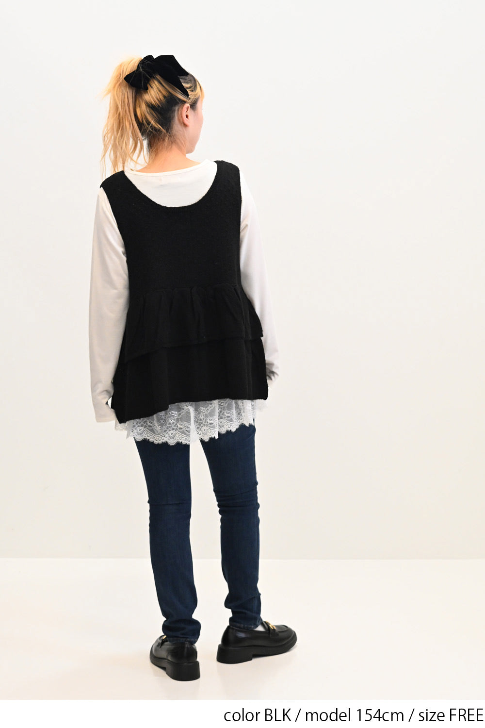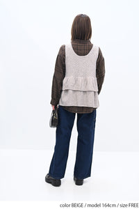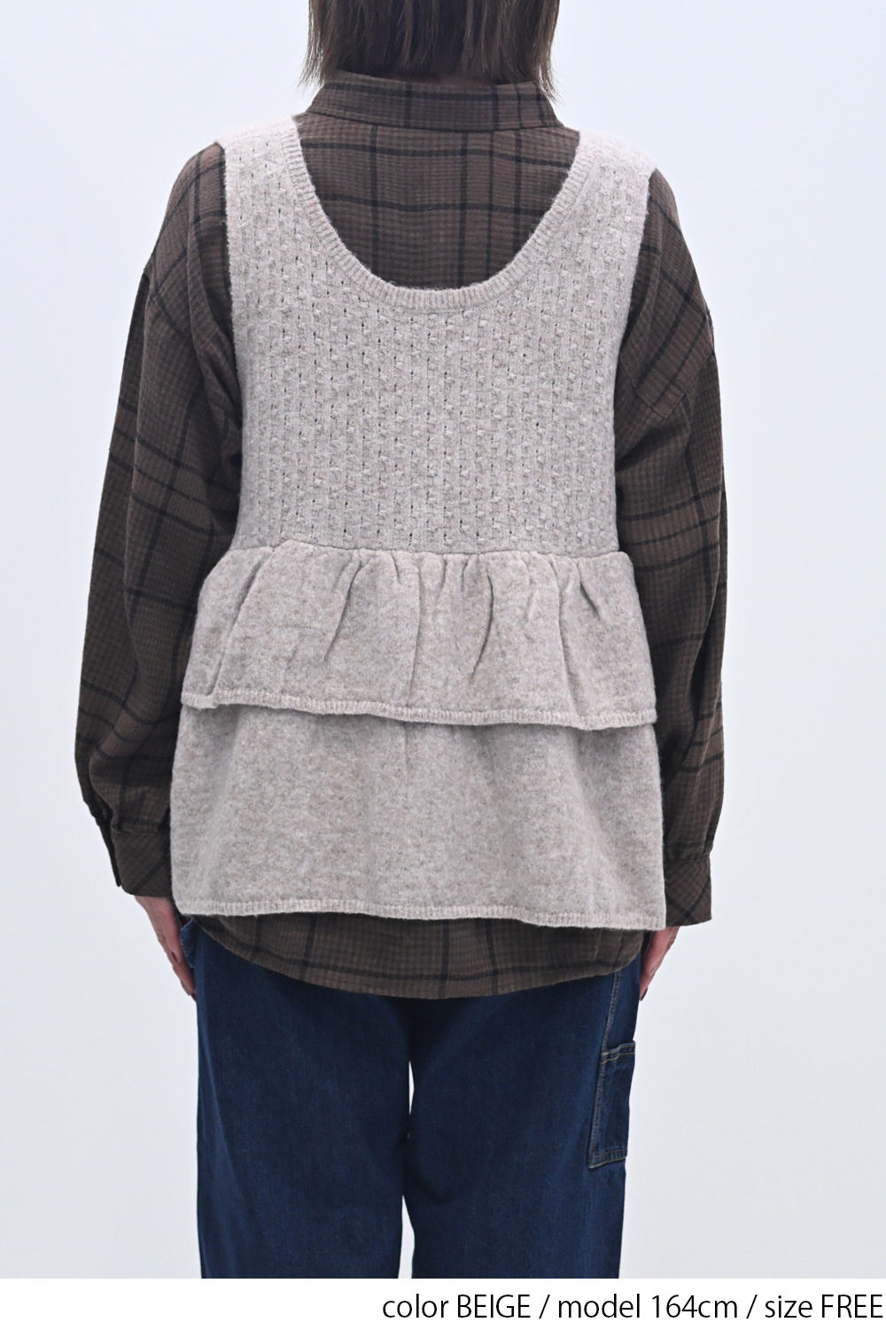 ふんわりとした裾フリルが目を惹く、愛らしい雰囲気のニットベスト。