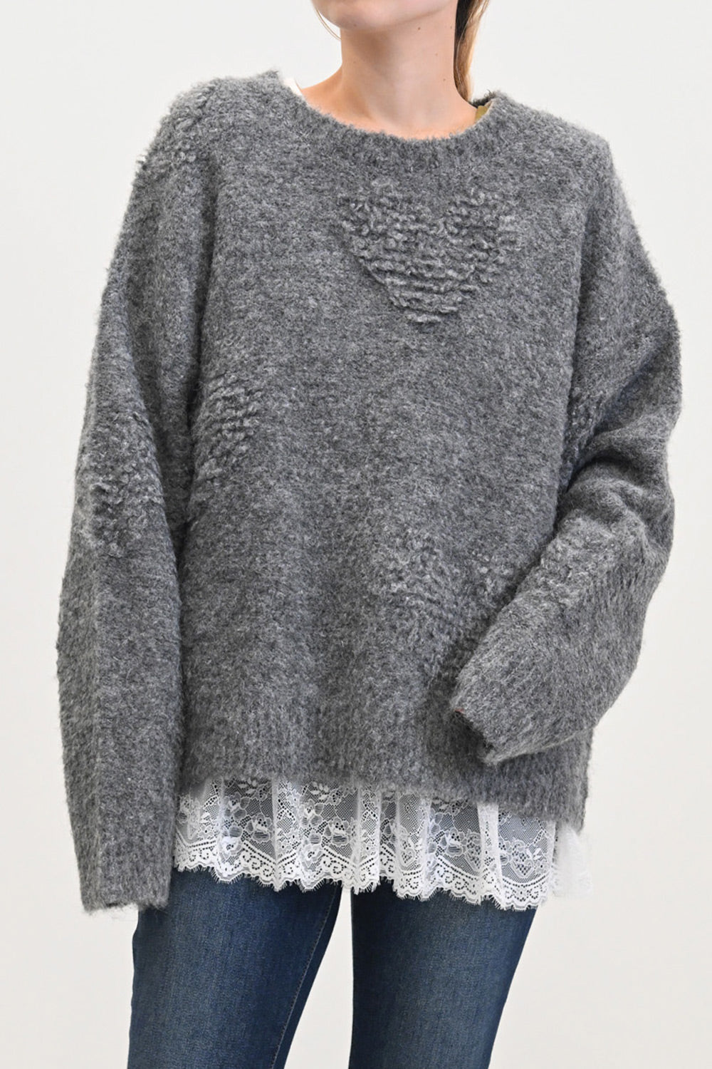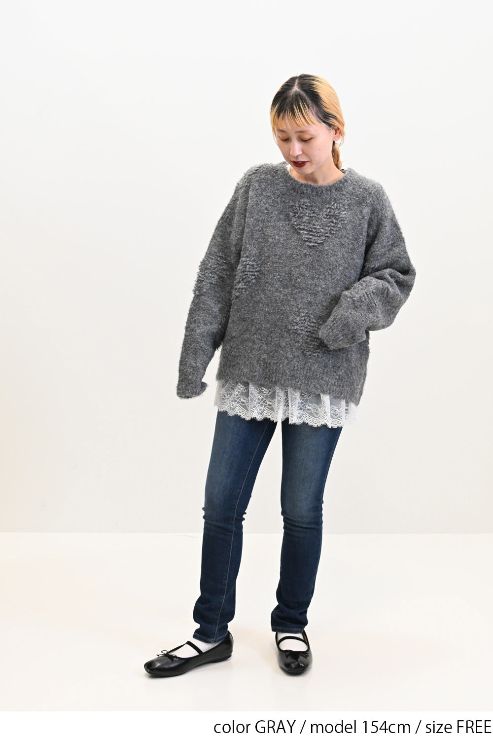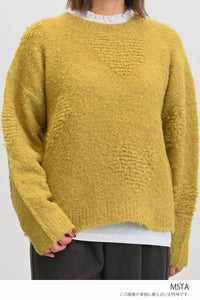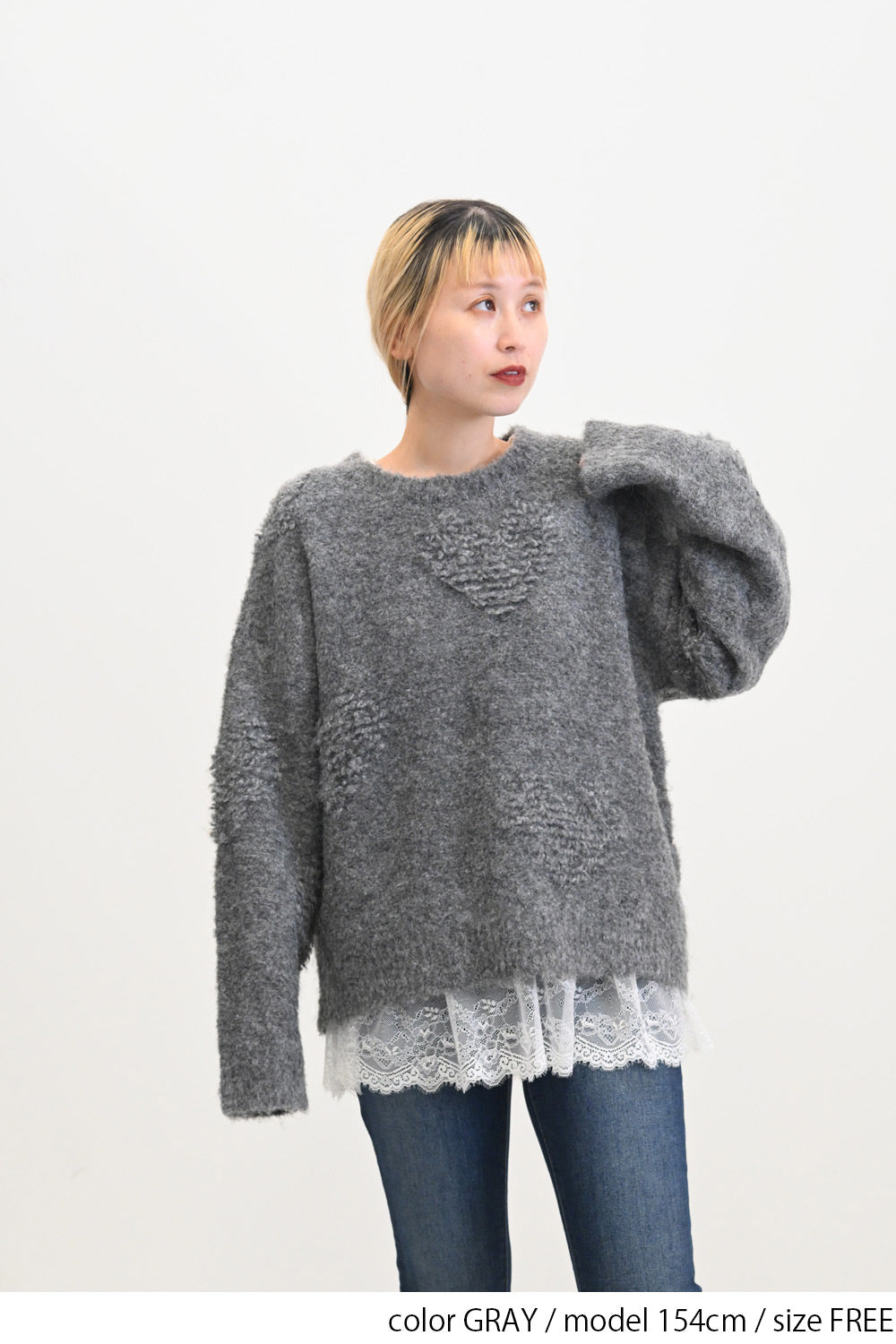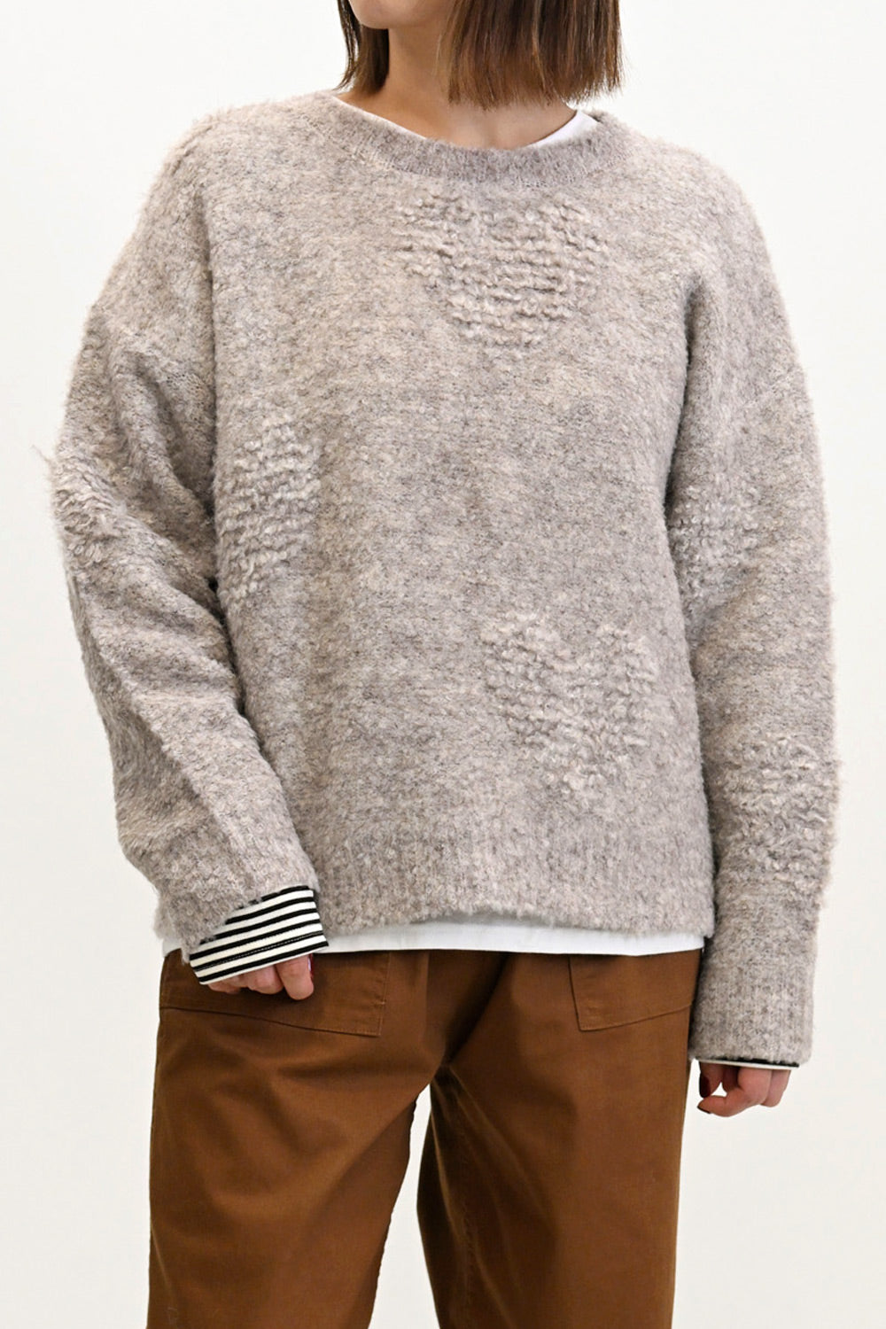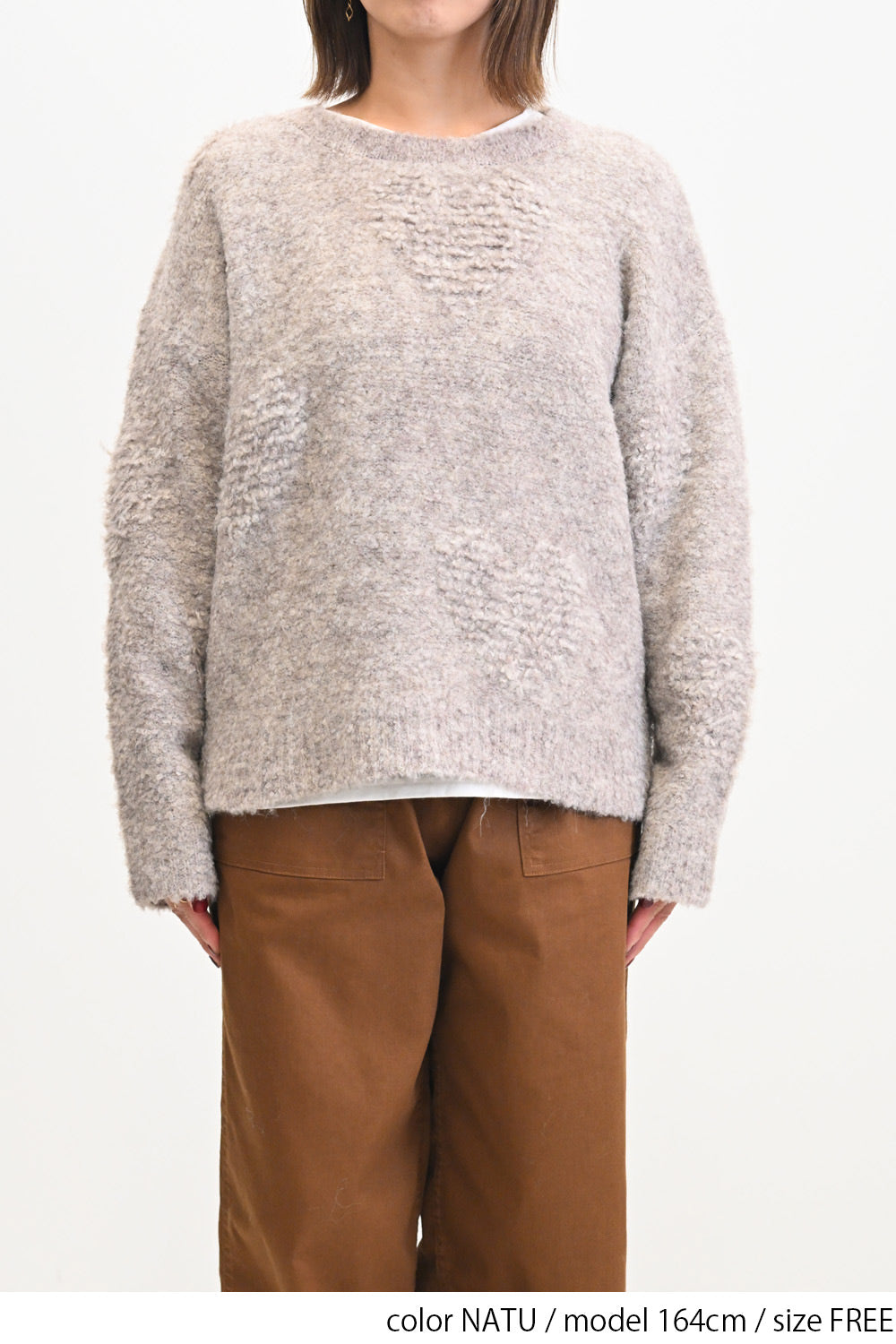 ふわふわのブークレー素材で編み立てた、ハート柄ジャガードのニットプルオーバー。