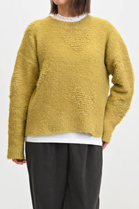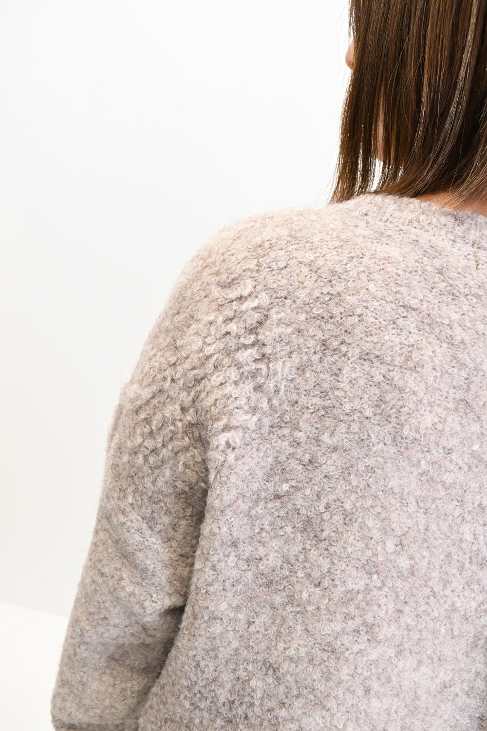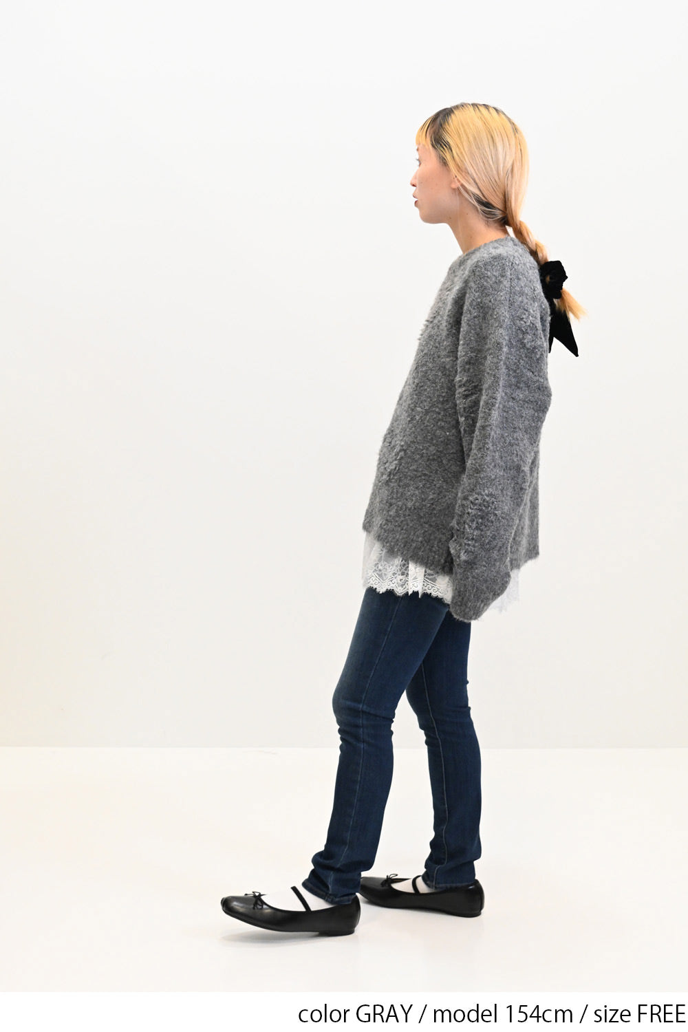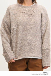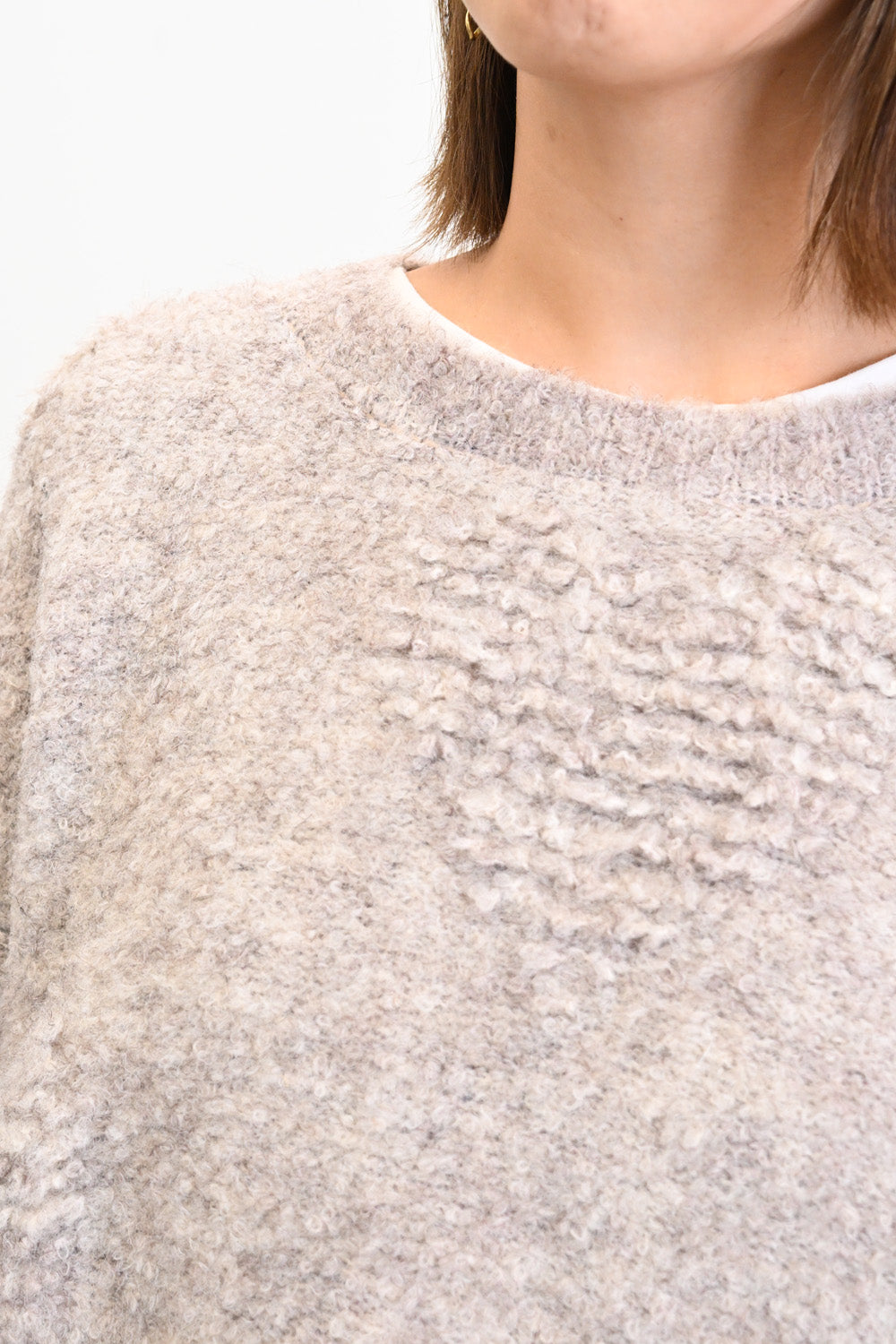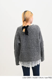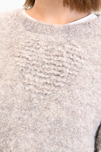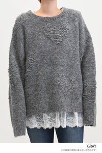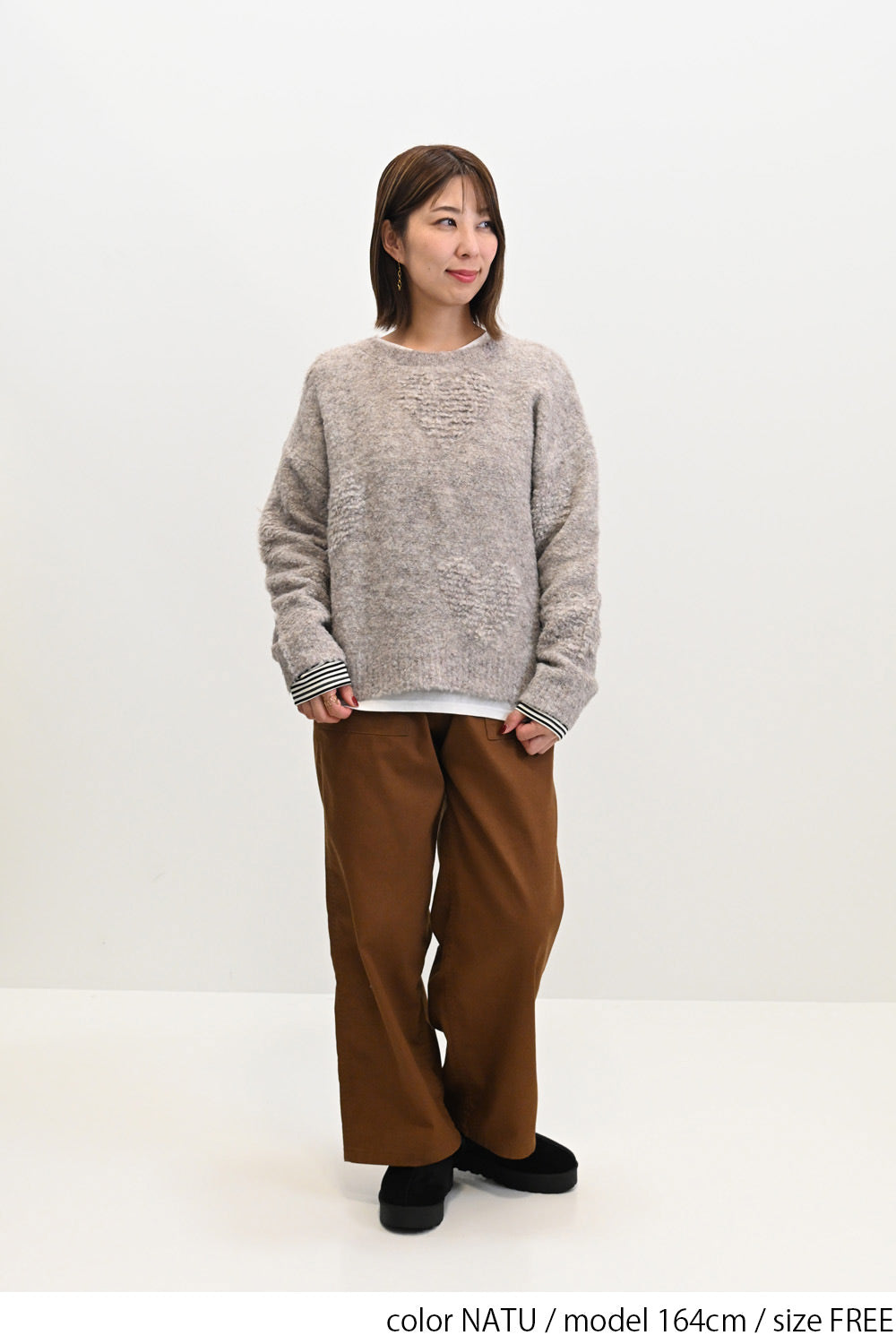 ふわふわのブークレー素材で編み立てた、ハート柄ジャガードのニットプルオーバー。