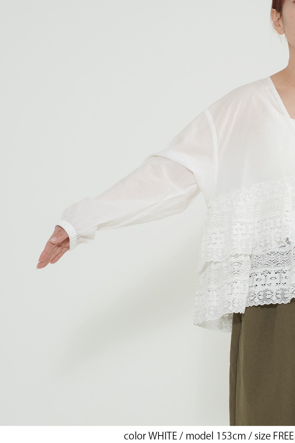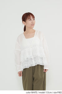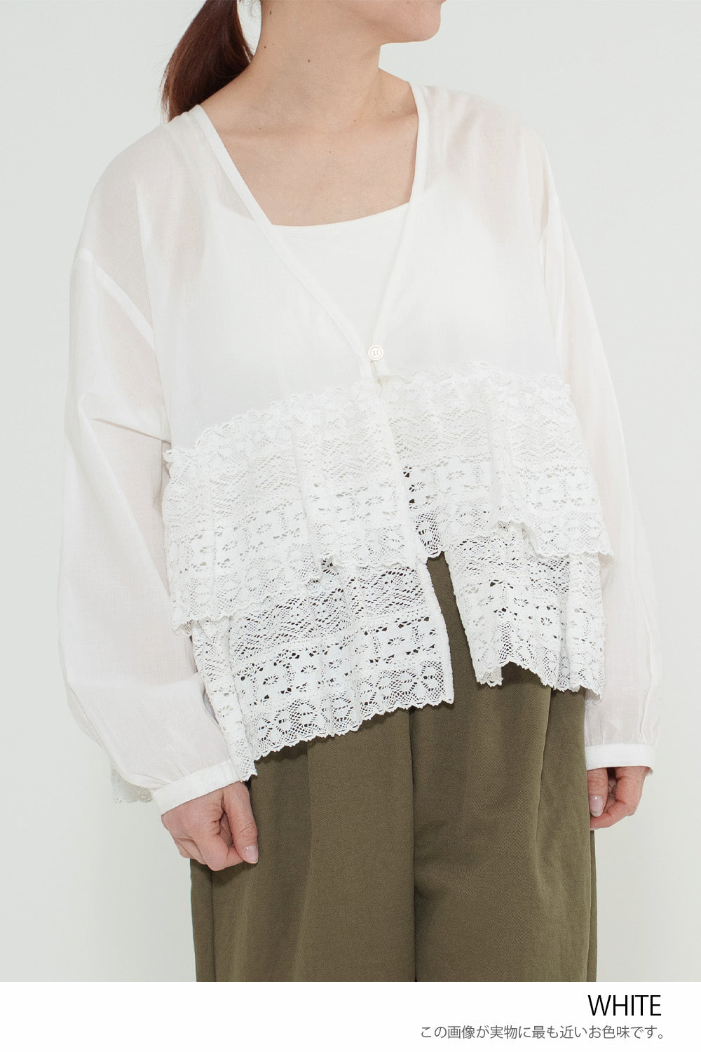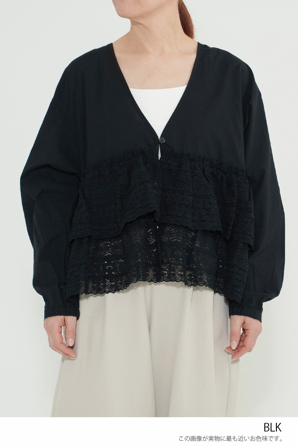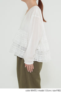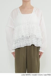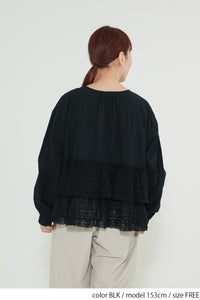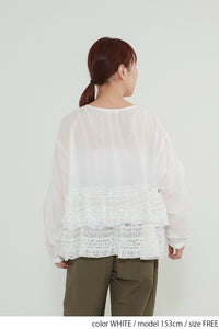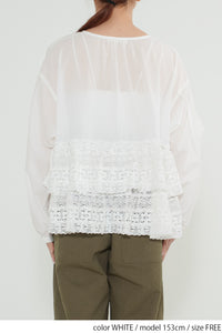 ウエストからレースを贅沢にあしらった、前開きのティアードブラウス。