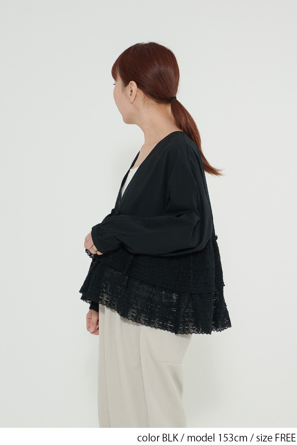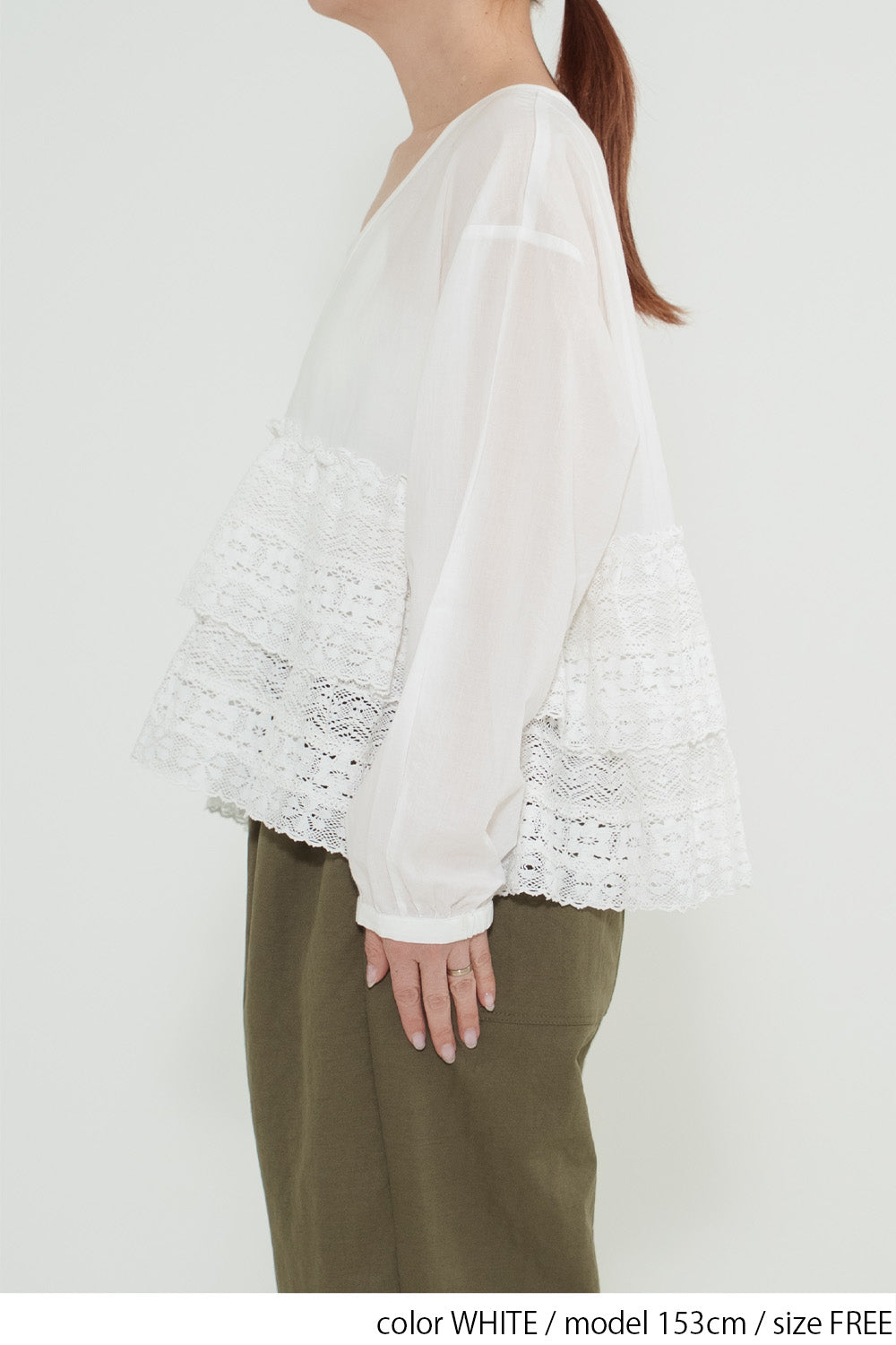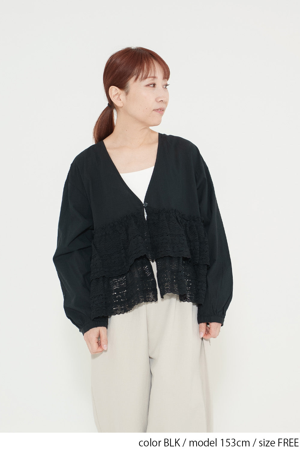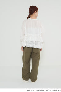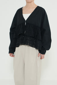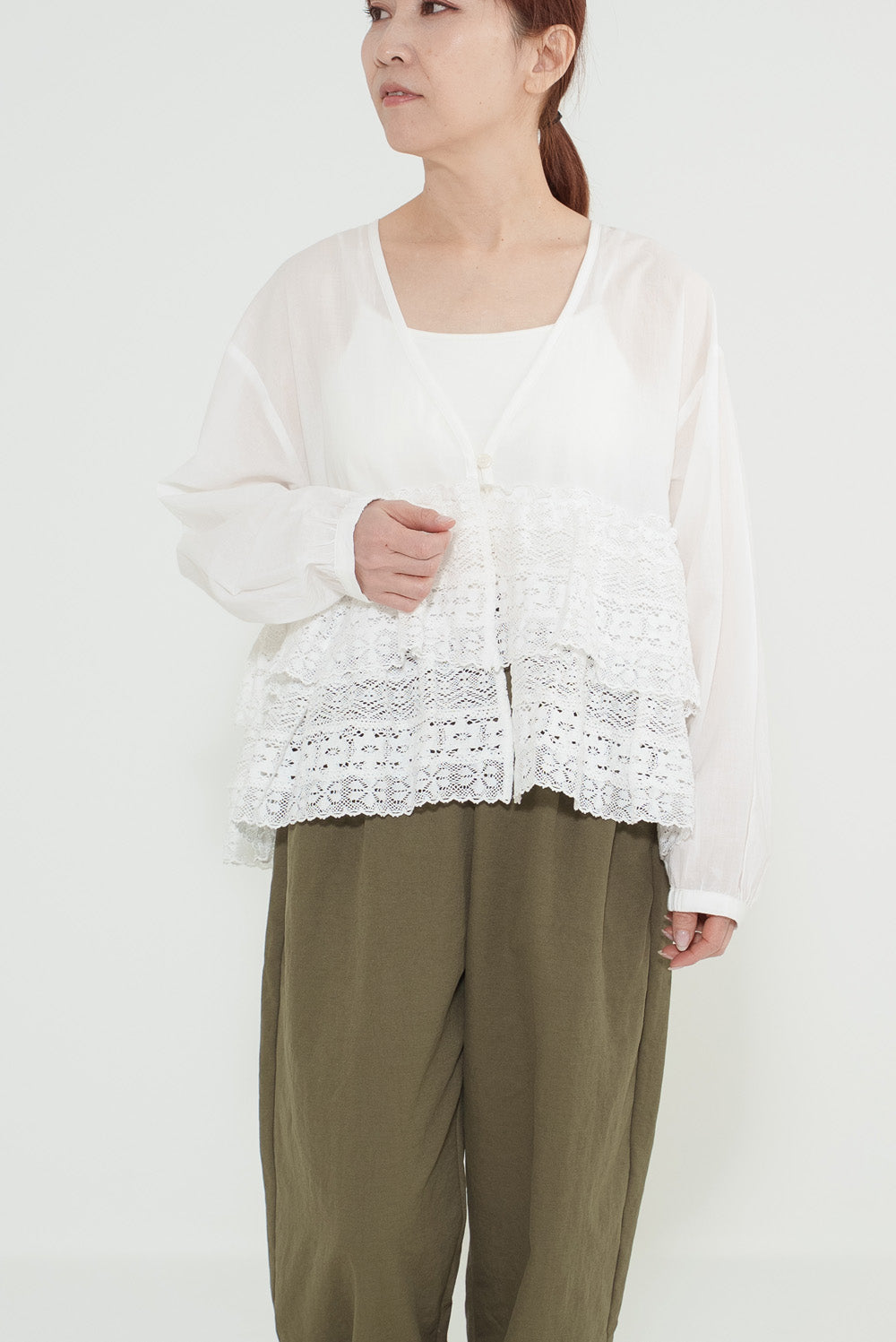 ウエストからレースを贅沢にあしらった、前開きのティアードブラウス。