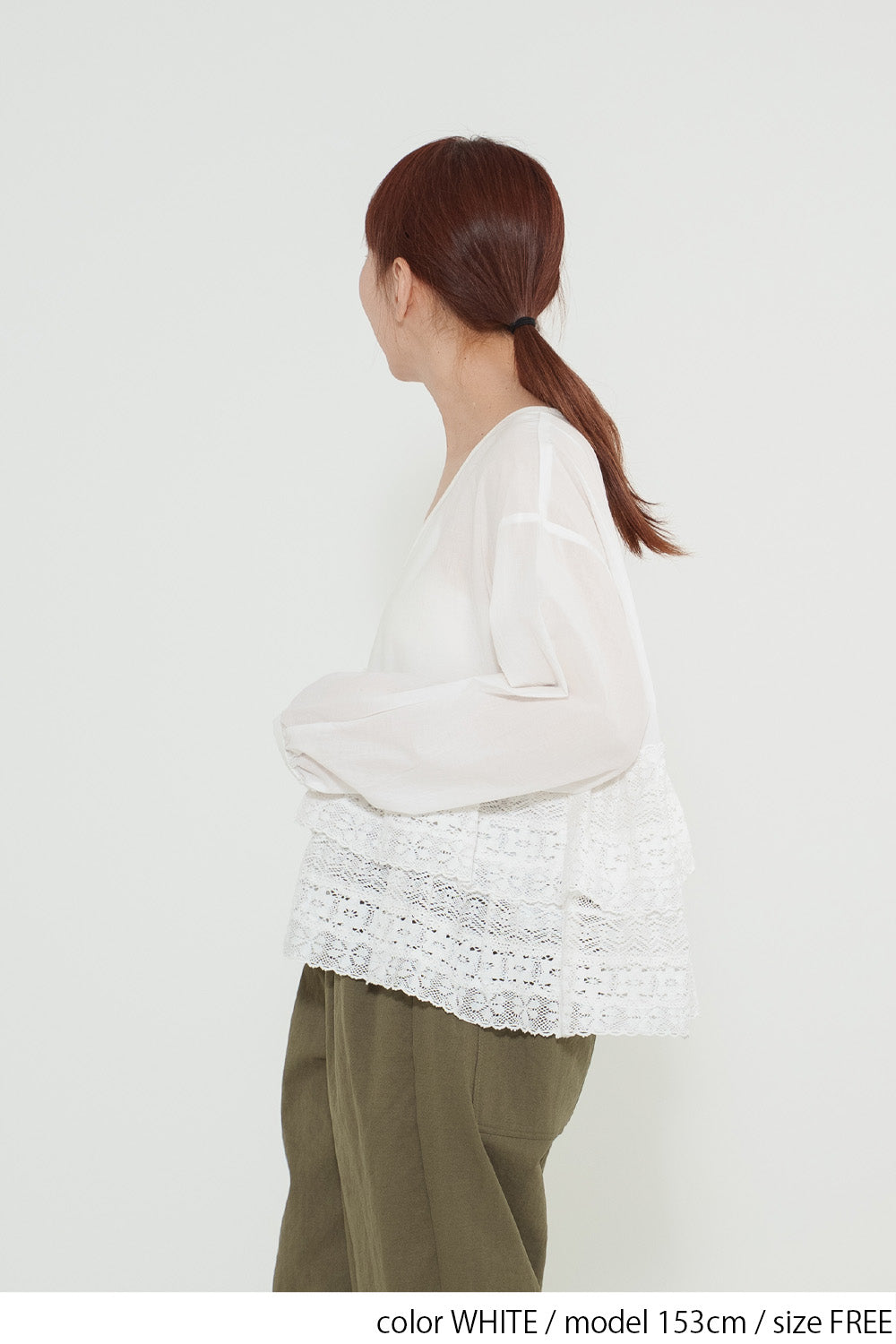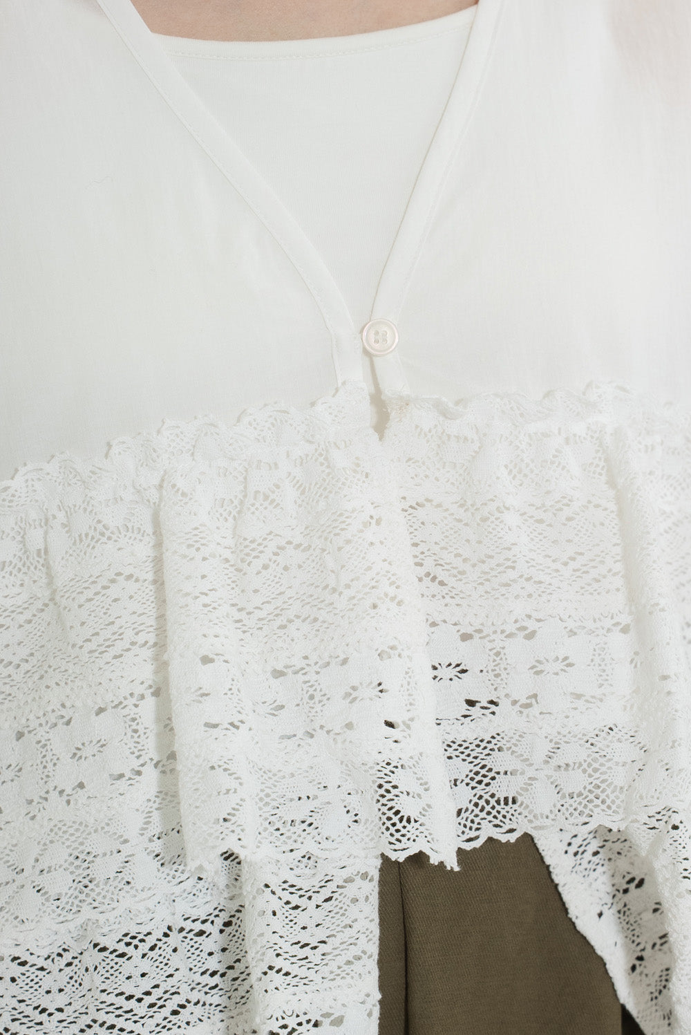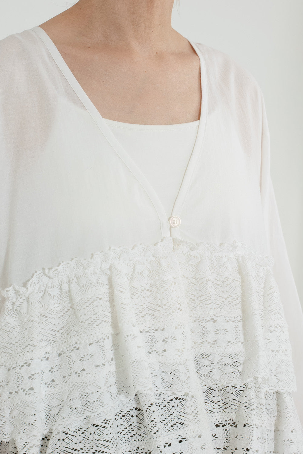 ウエストからレースを贅沢にあしらった、前開きのティアードブラウス。