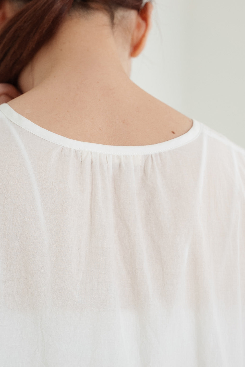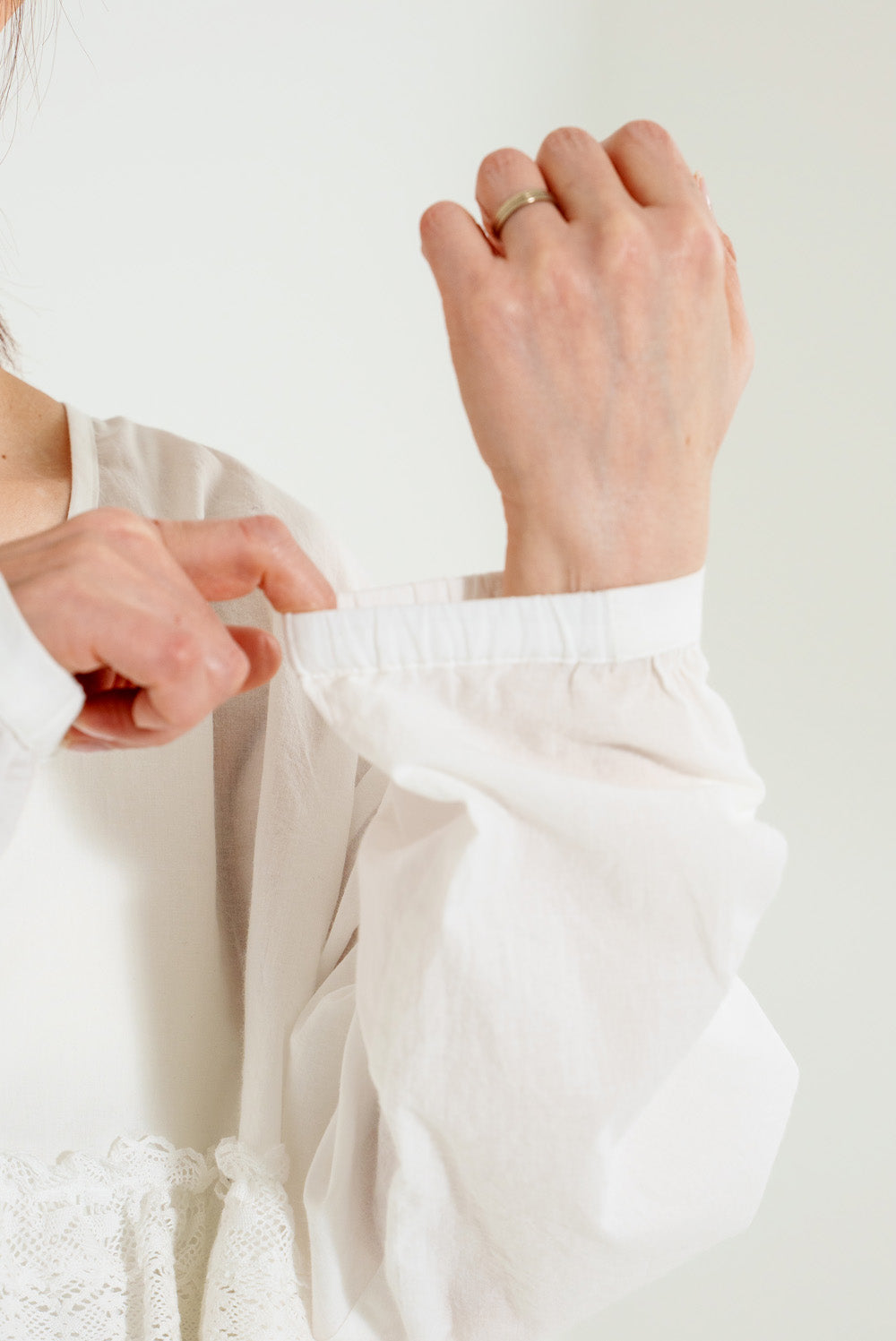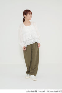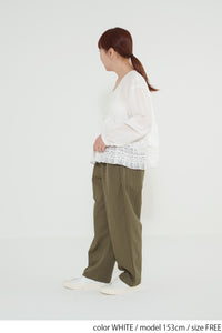 前開きボタン仕様なので、ブラウスとして一枚で着るのはもちろん、ボタンを開けて羽織りとしても活躍。