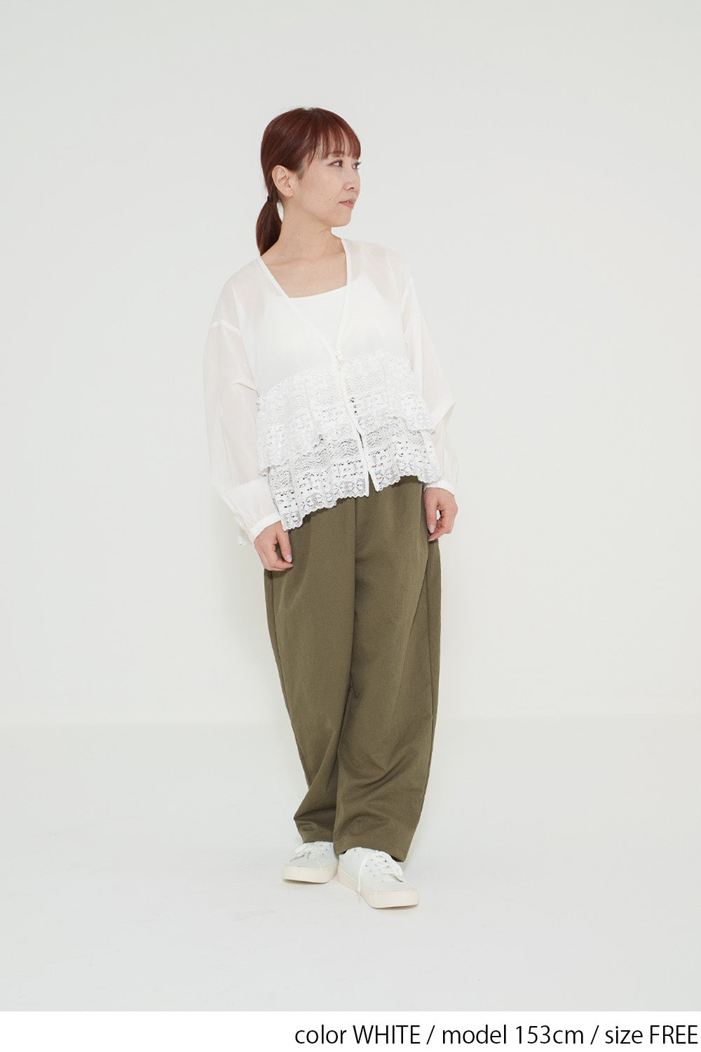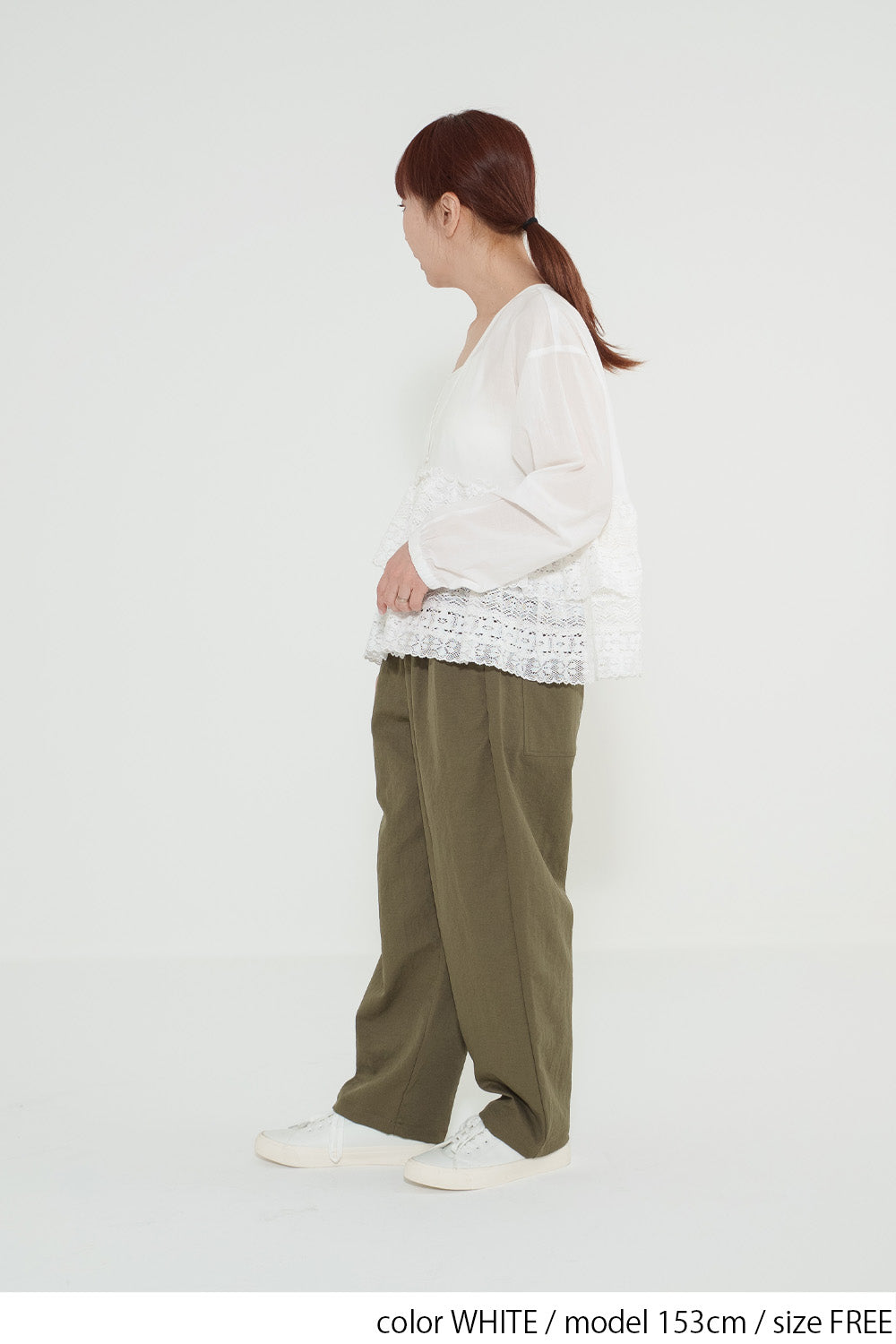 レースの華やかさと、すっきりとしたパンツラインがバランスよく、大人っぽく洗練された印象に仕上がります。
