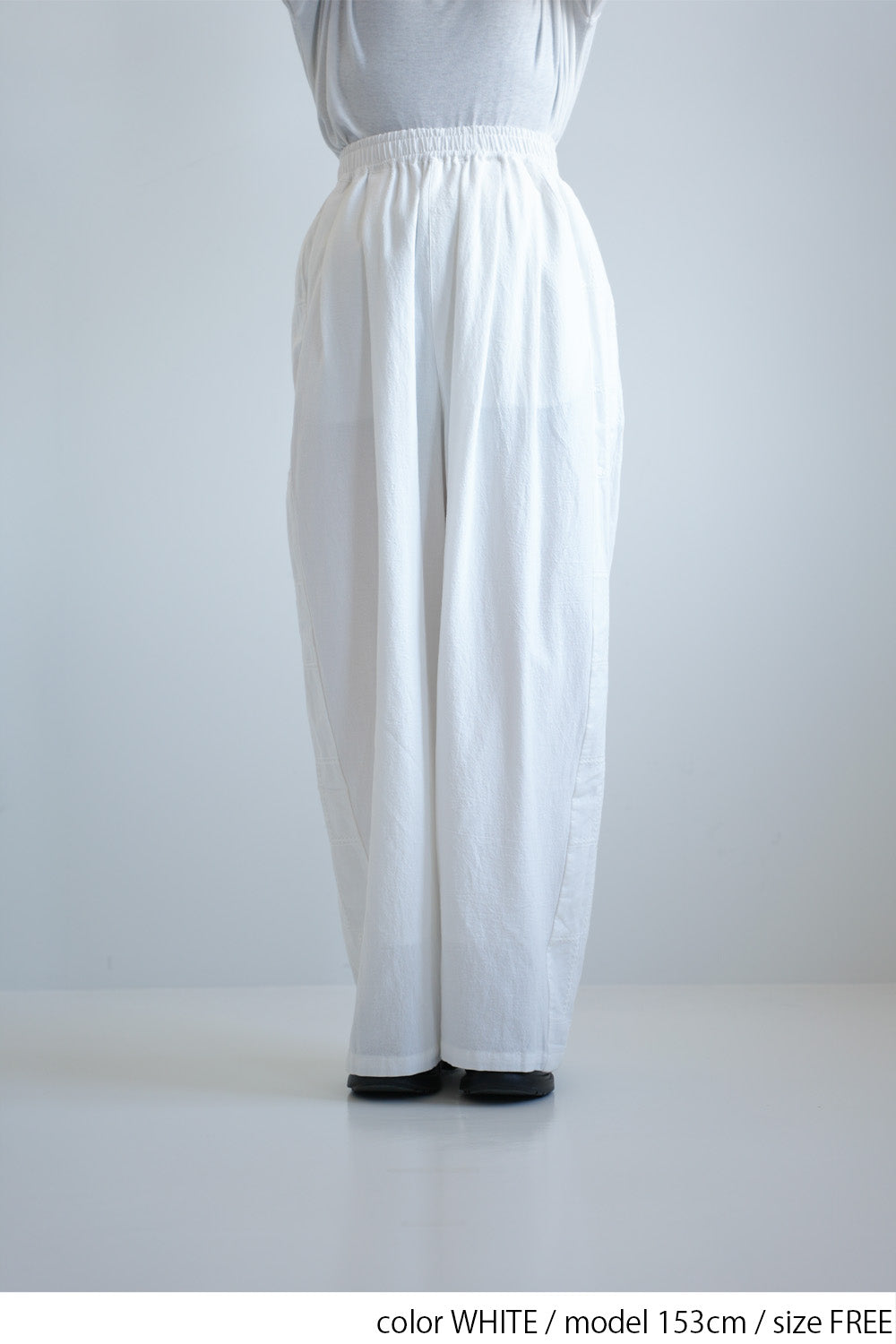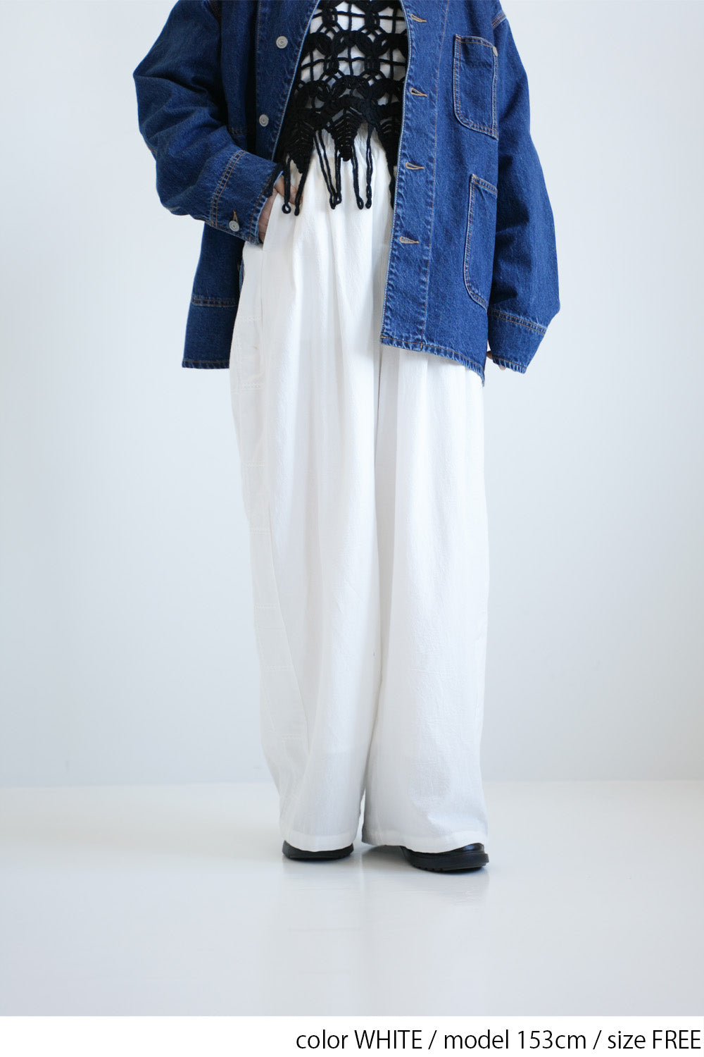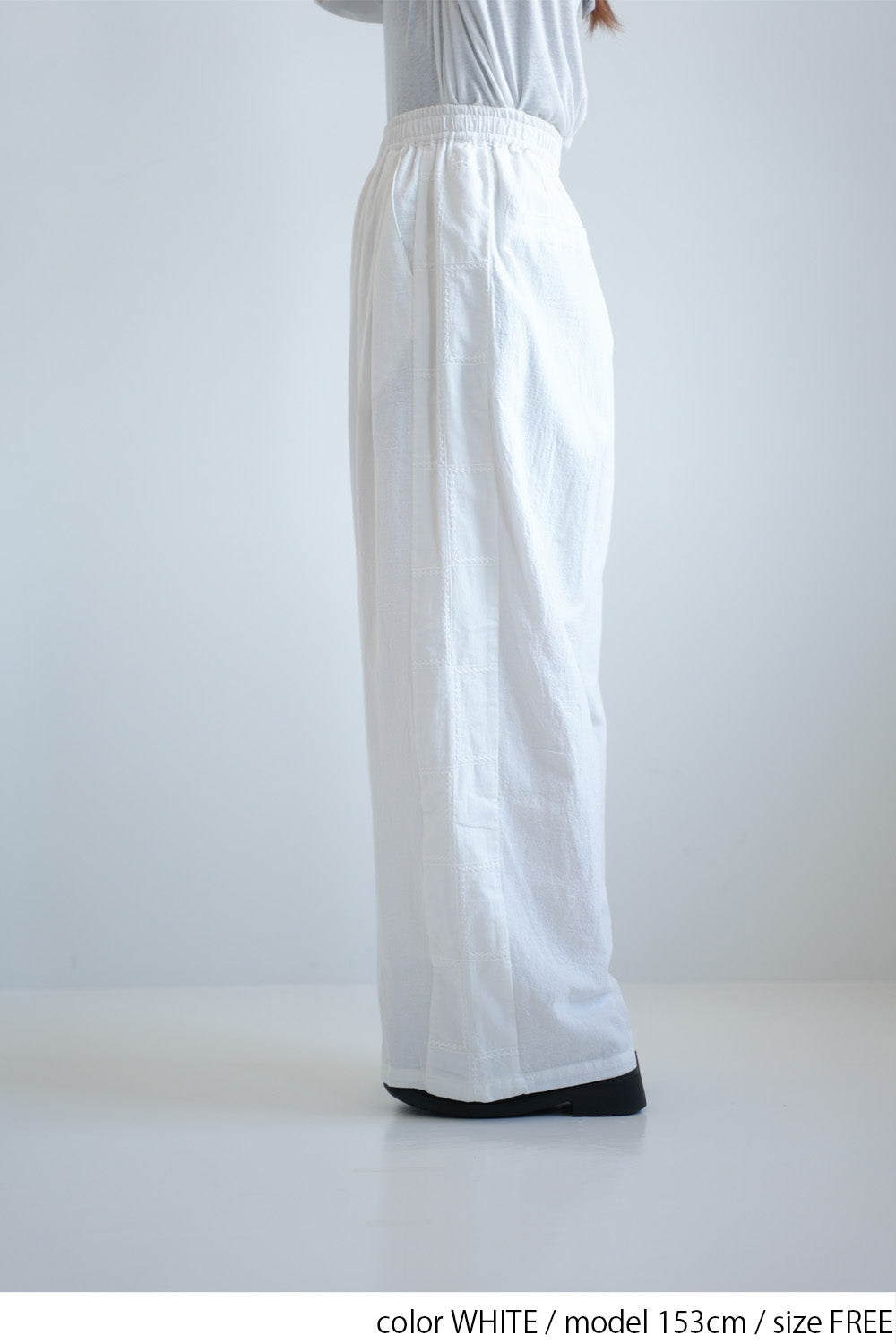 脇にあしらったレース刺繍が、さりげないポイントのワイドパンツ。