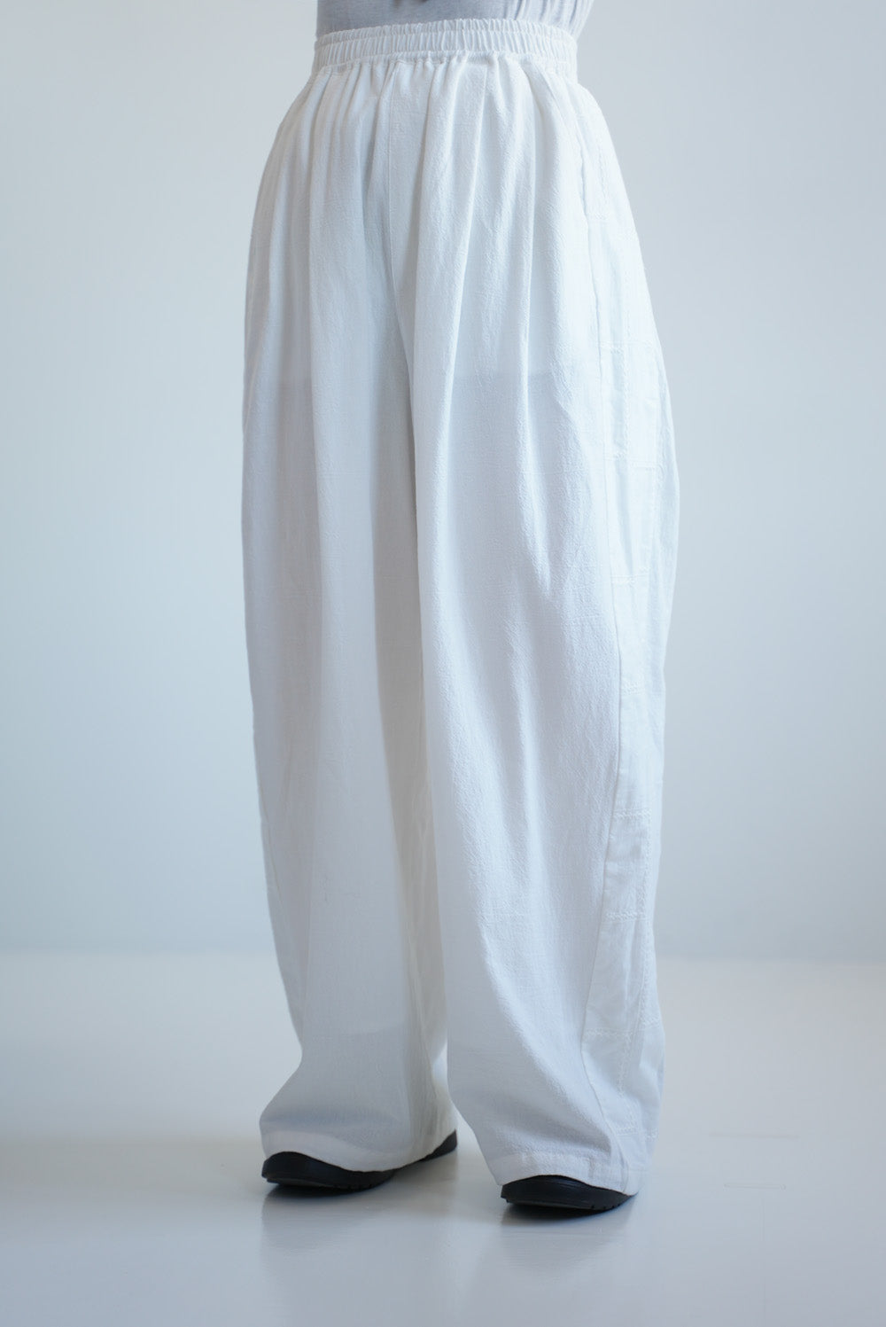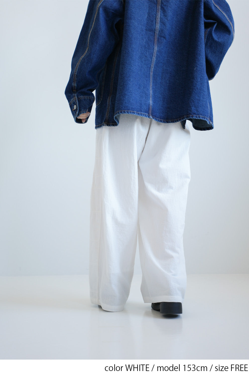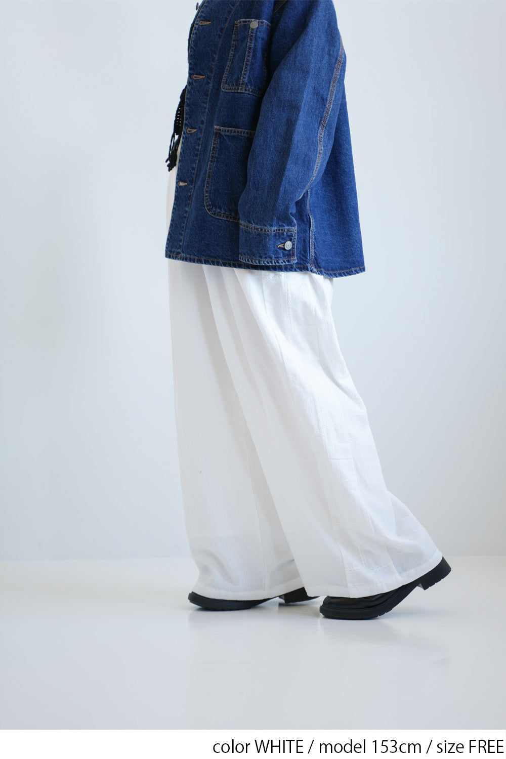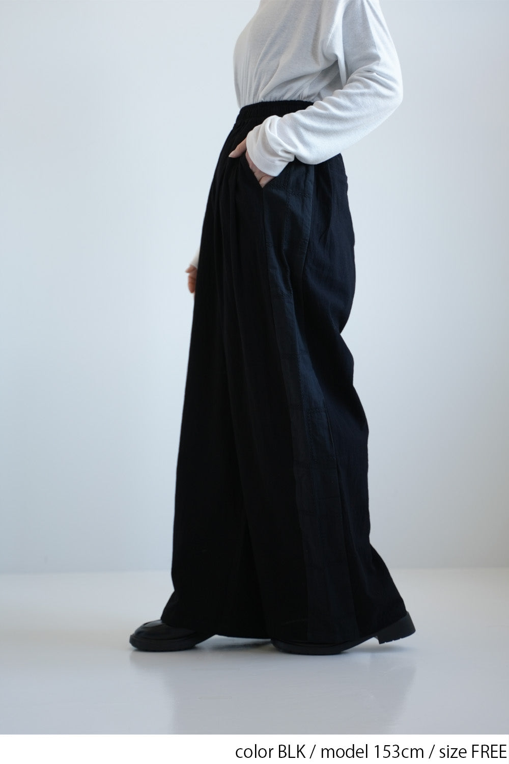 脇にあしらったレース刺繍が、さりげないポイントのワイドパンツ。