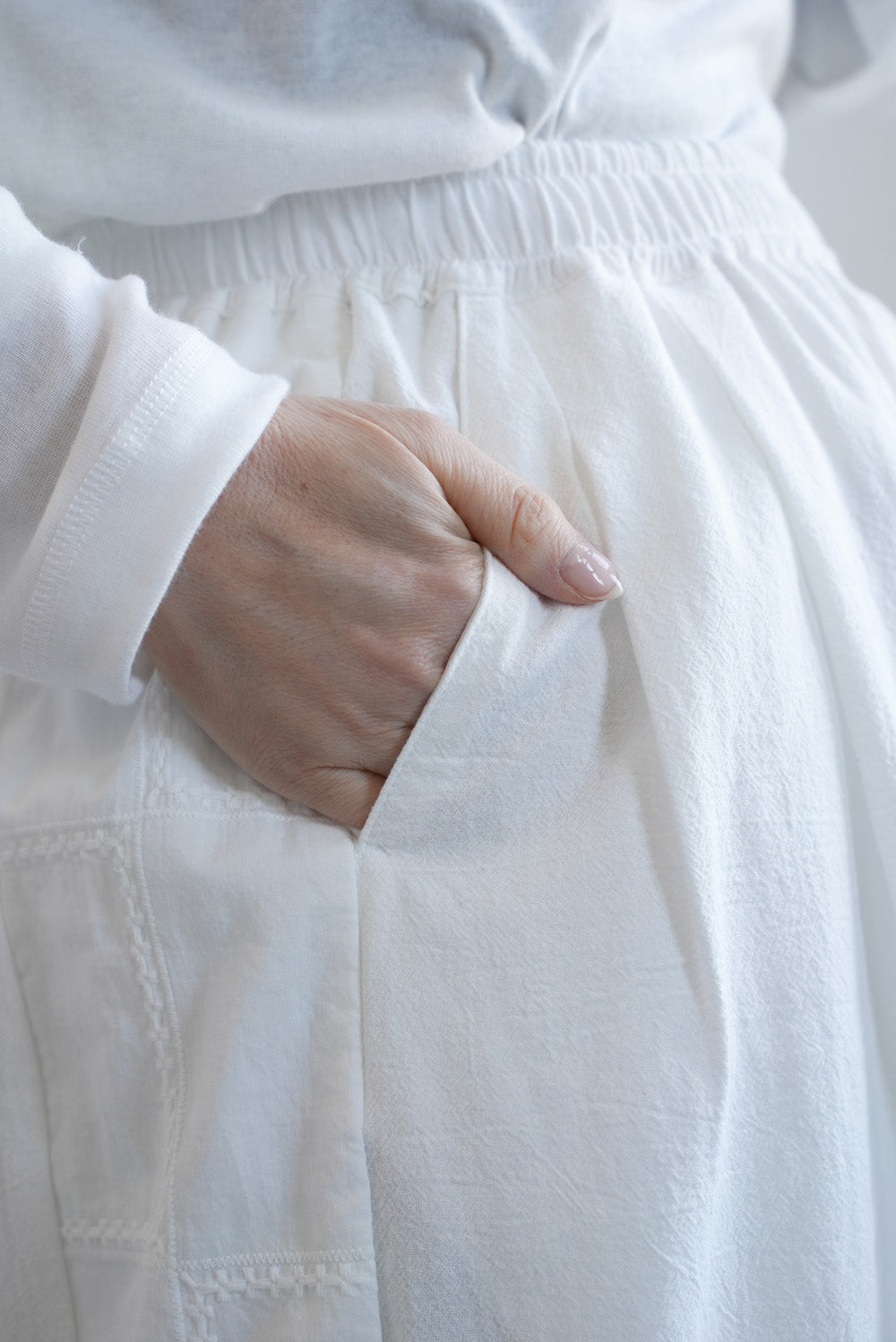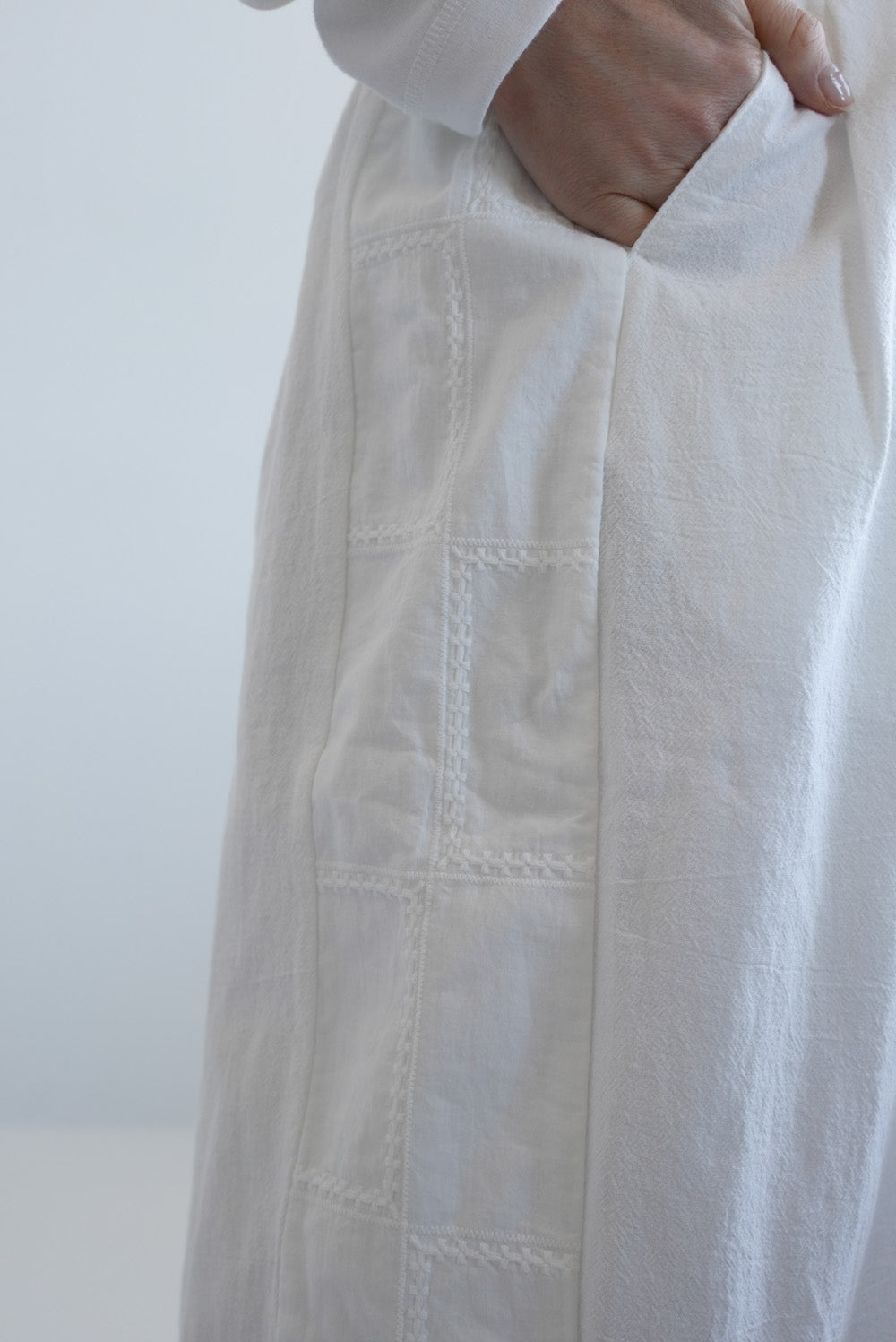 シンプルなトップスと合わせるだけで、脇のレース刺繍がさりげないアクセントに。