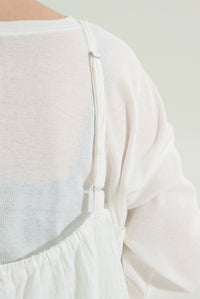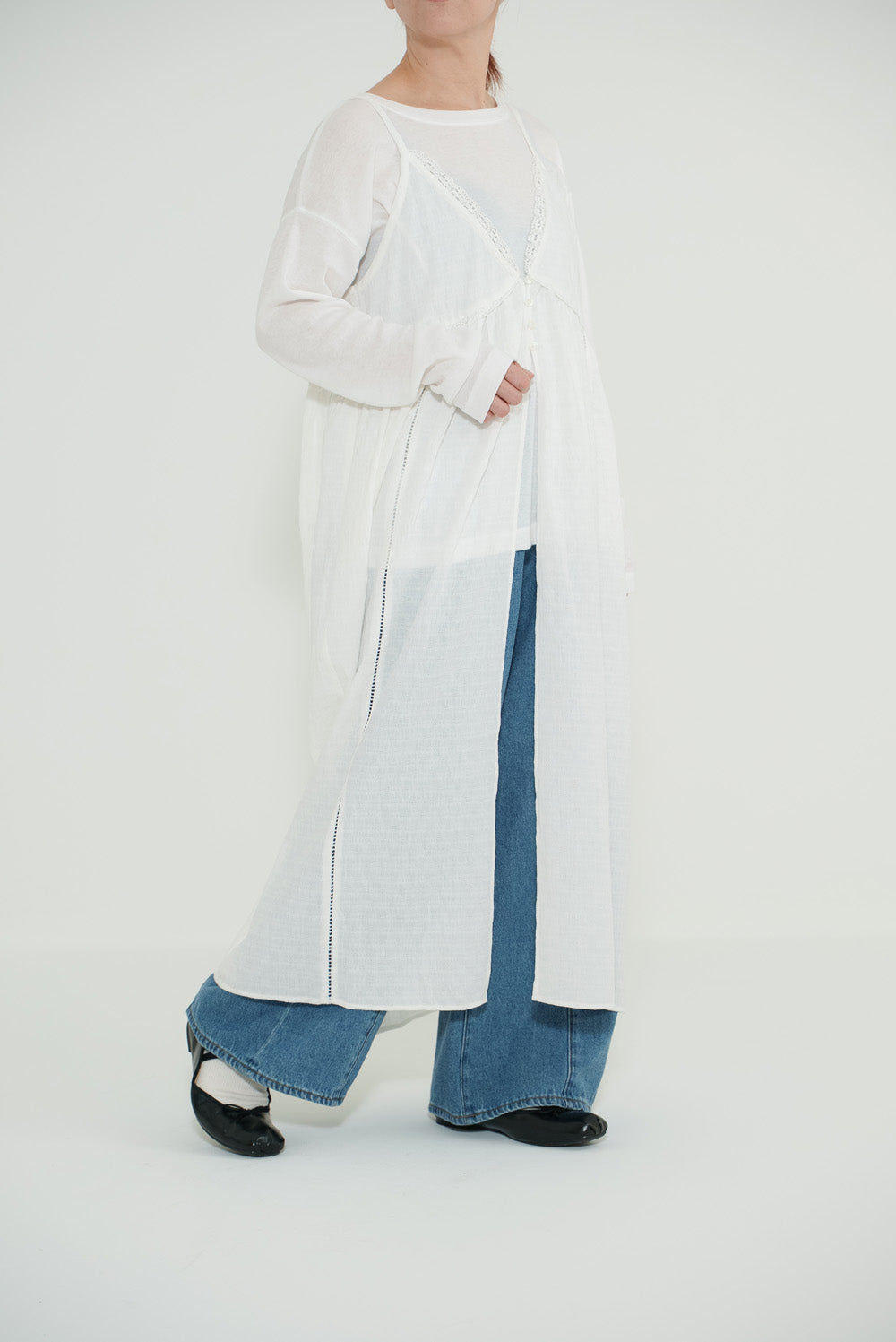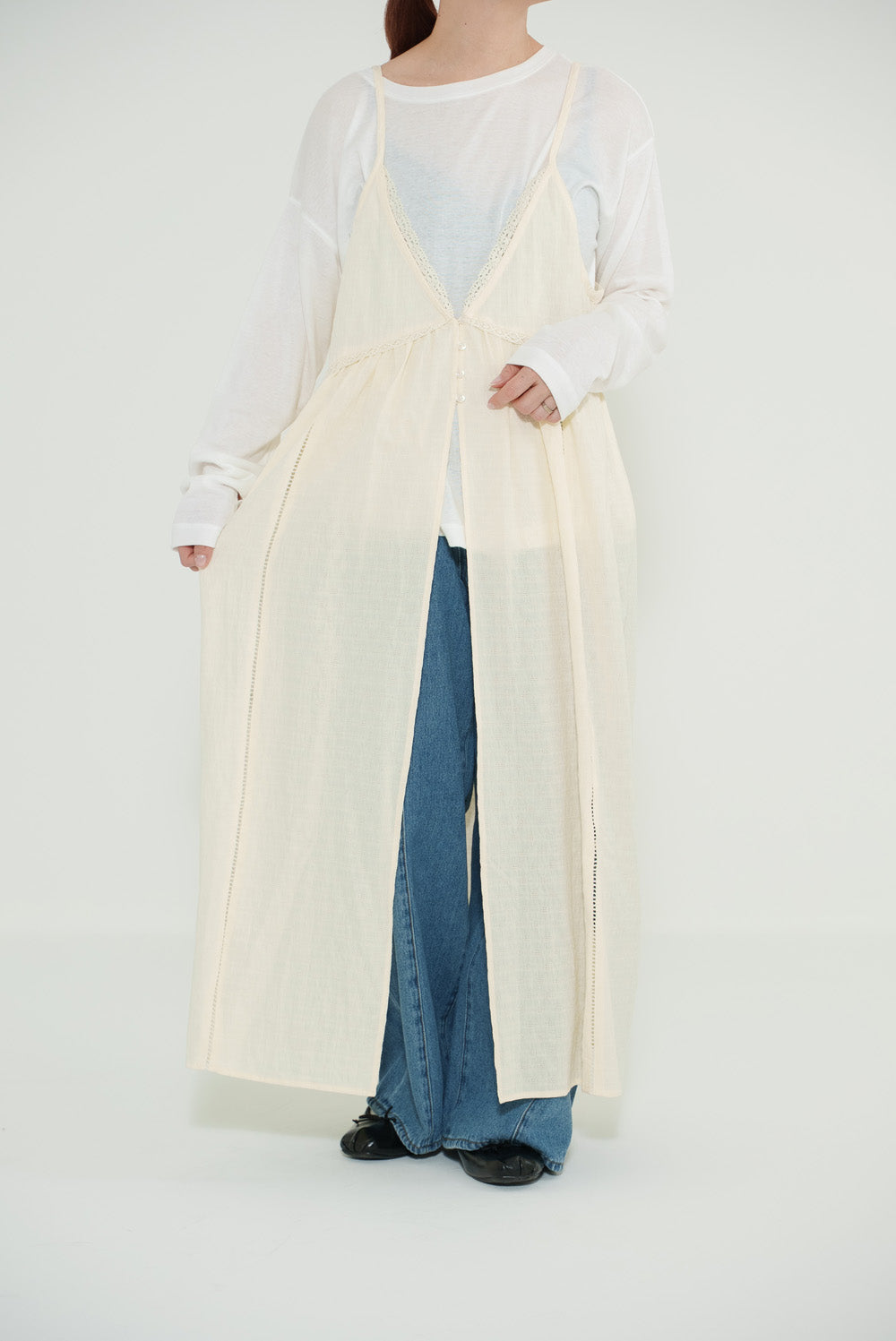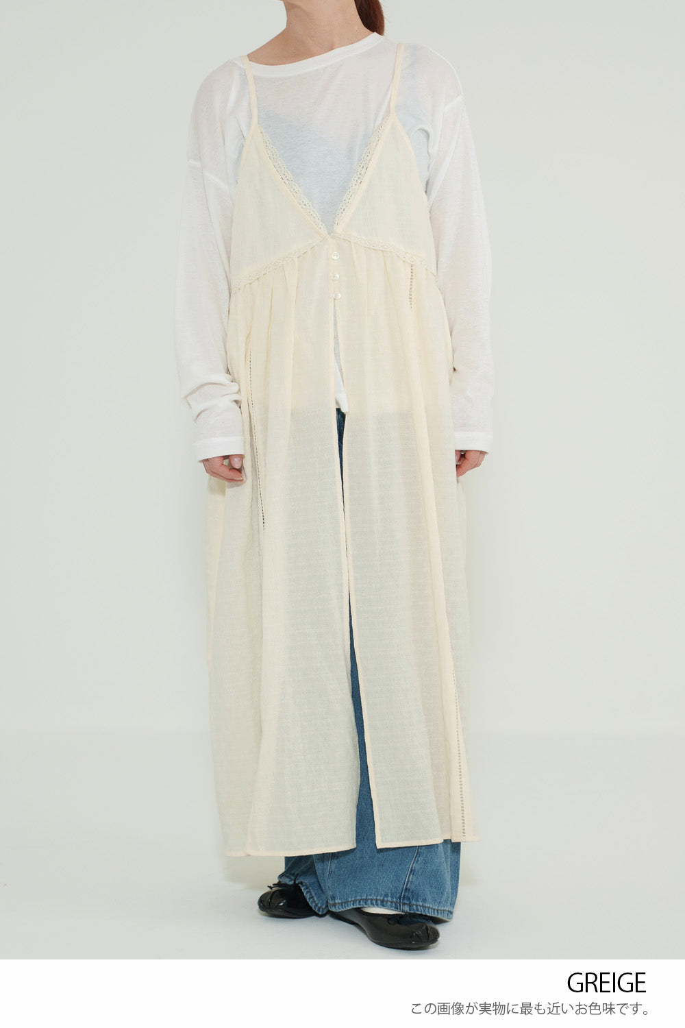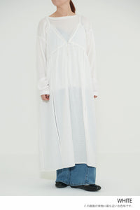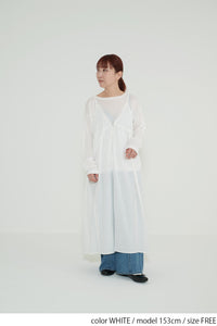 前開きデザインでロンTやブラウスとのレイヤードが楽しめる仕様に。