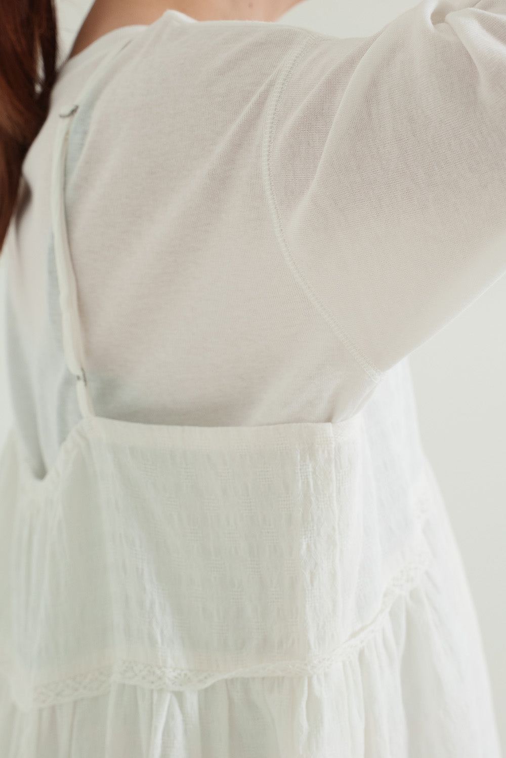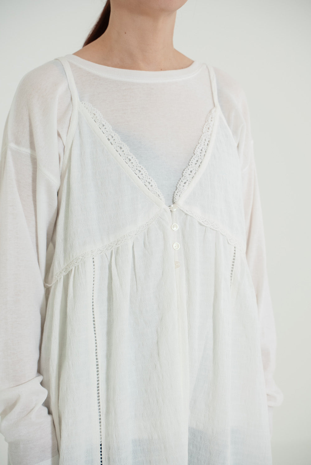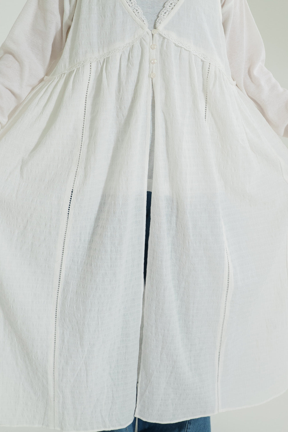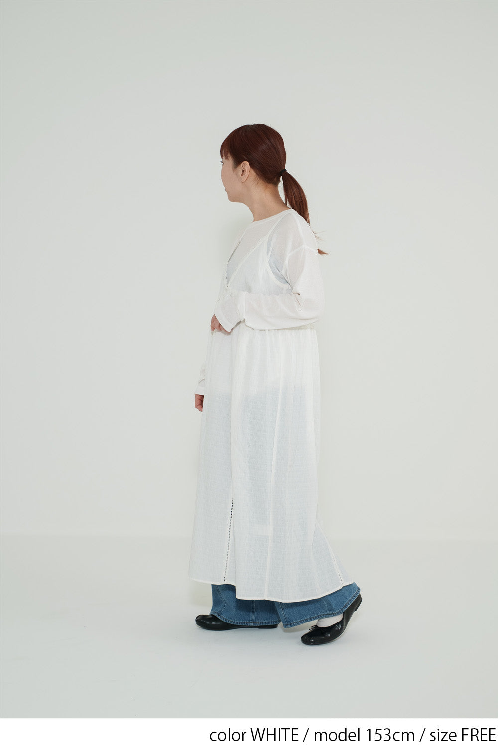 前開きデザインでロンTやブラウスとのレイヤードが楽しめる仕様に。