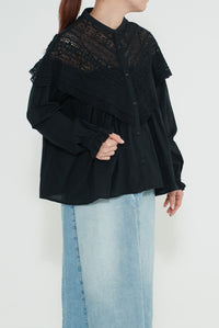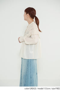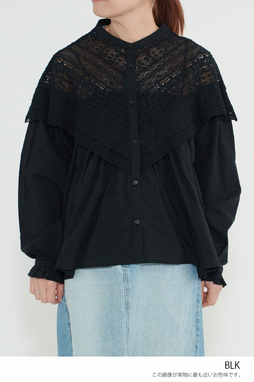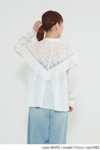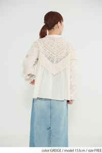 肩から胸元にかけて大胆にあしらわれた透け感のあるレースが、顔まわりをぱっと華やかに見せてくれる一枚。