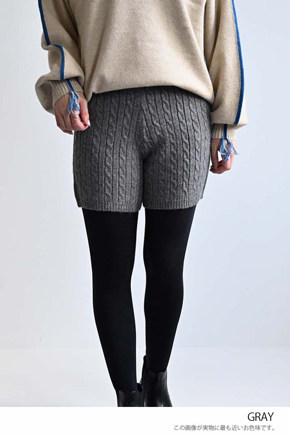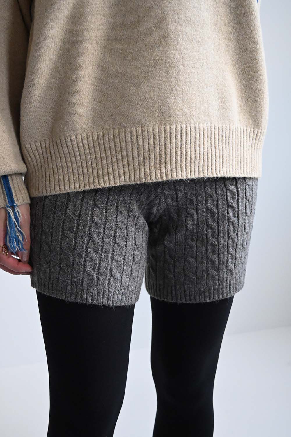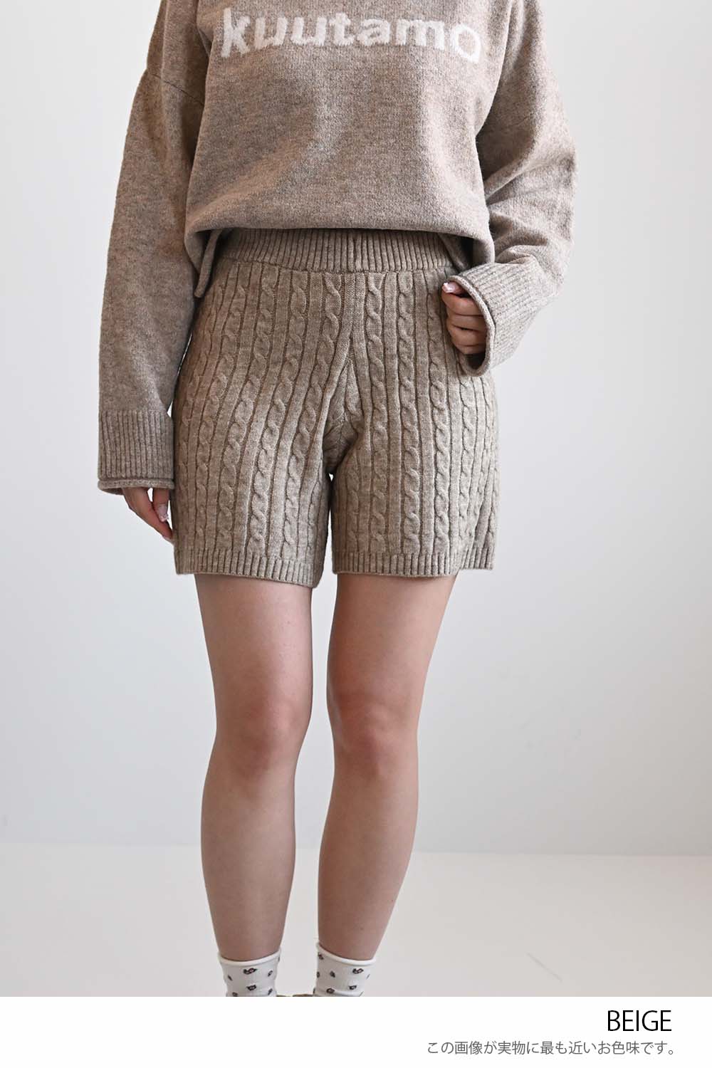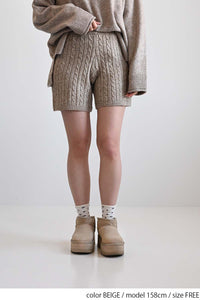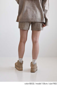 ふんわりとした表情がかわいい、ケーブル編みのニットショートパンツ。