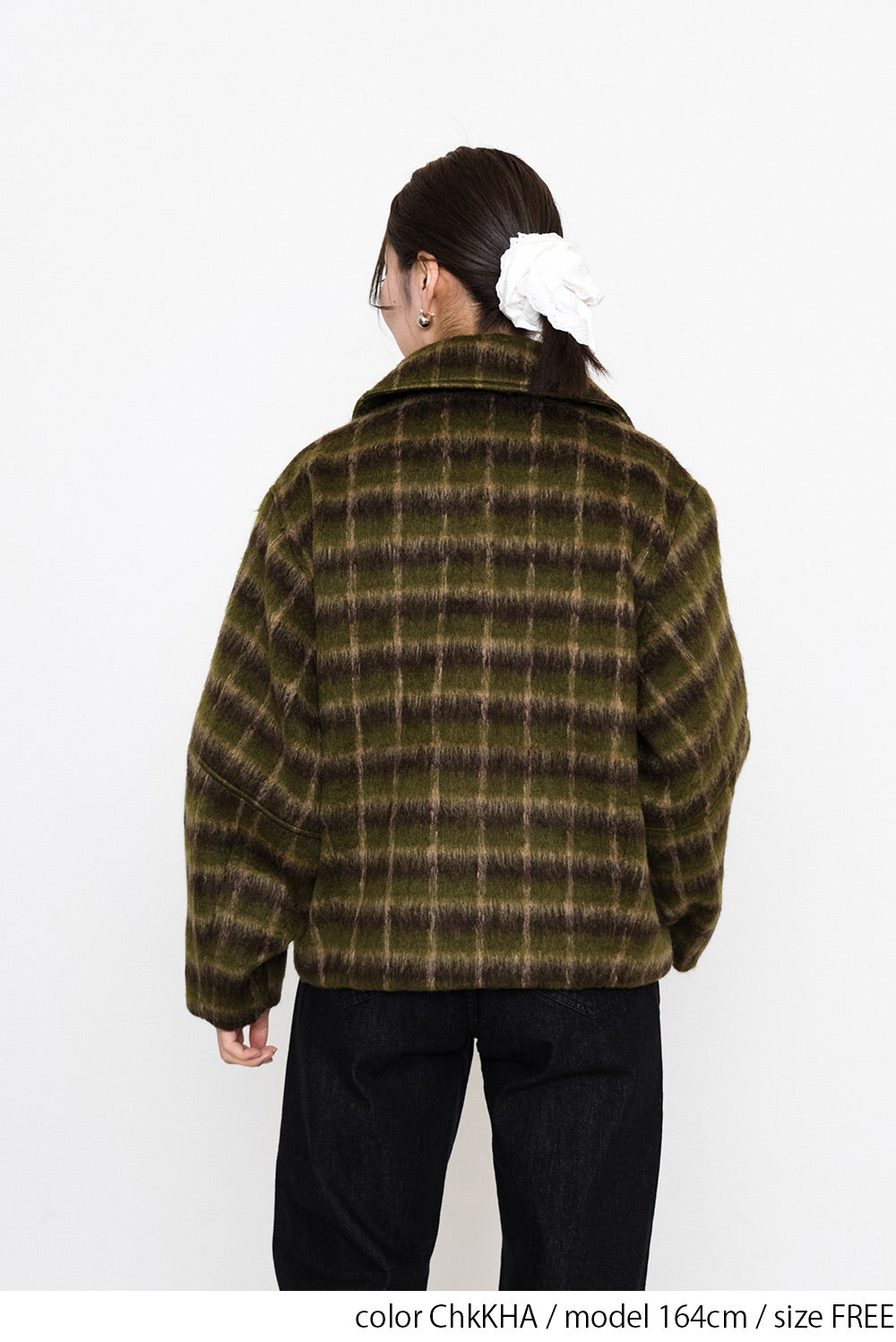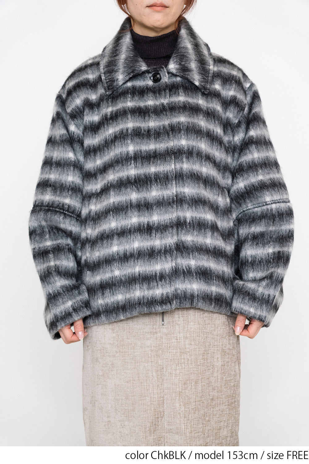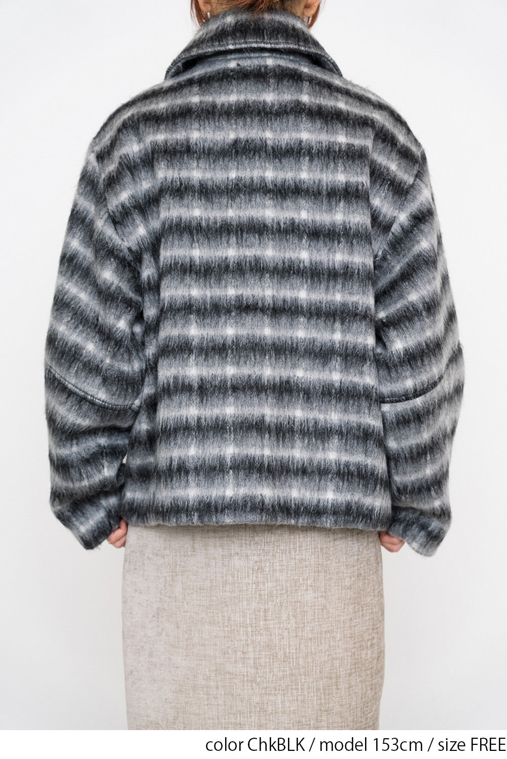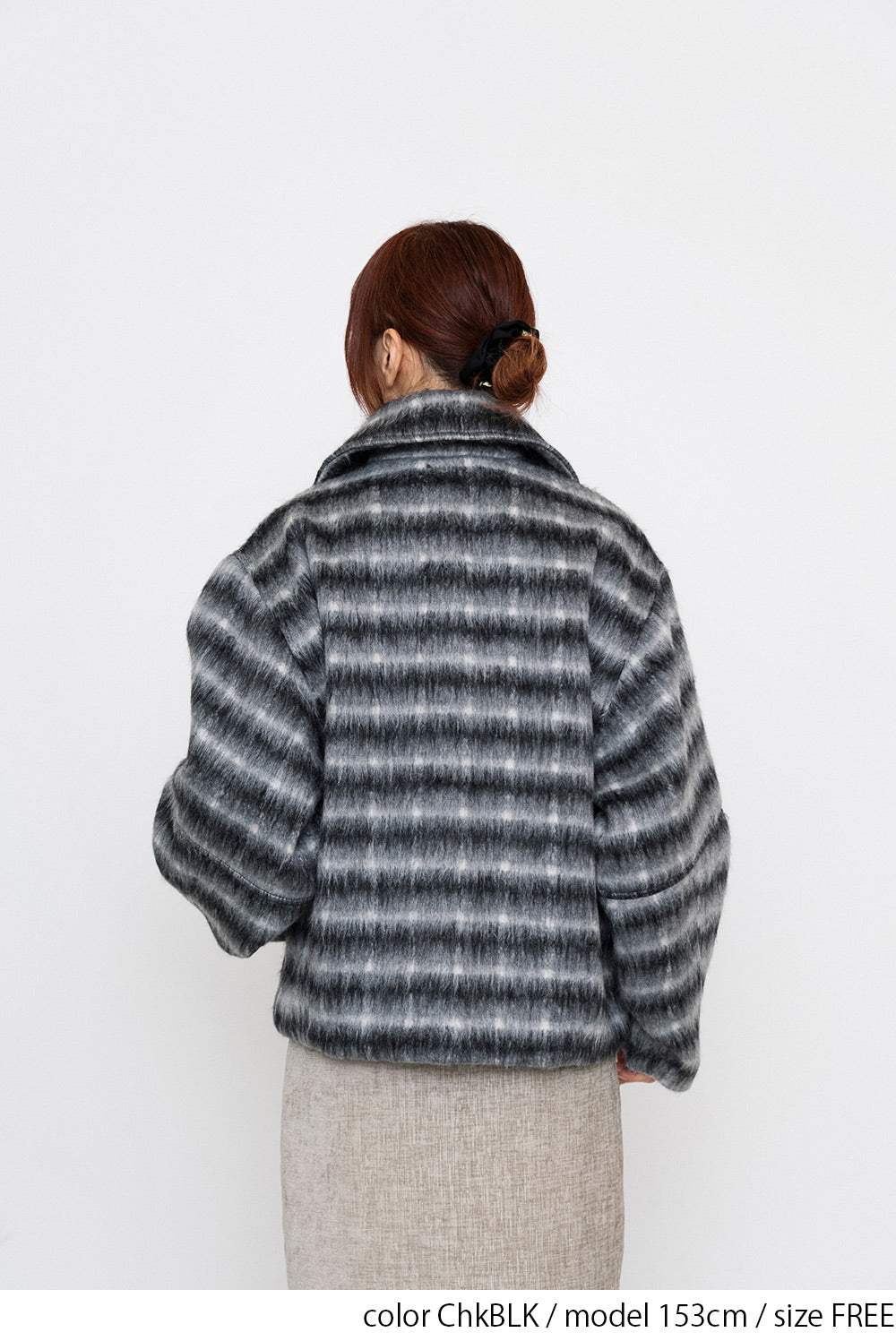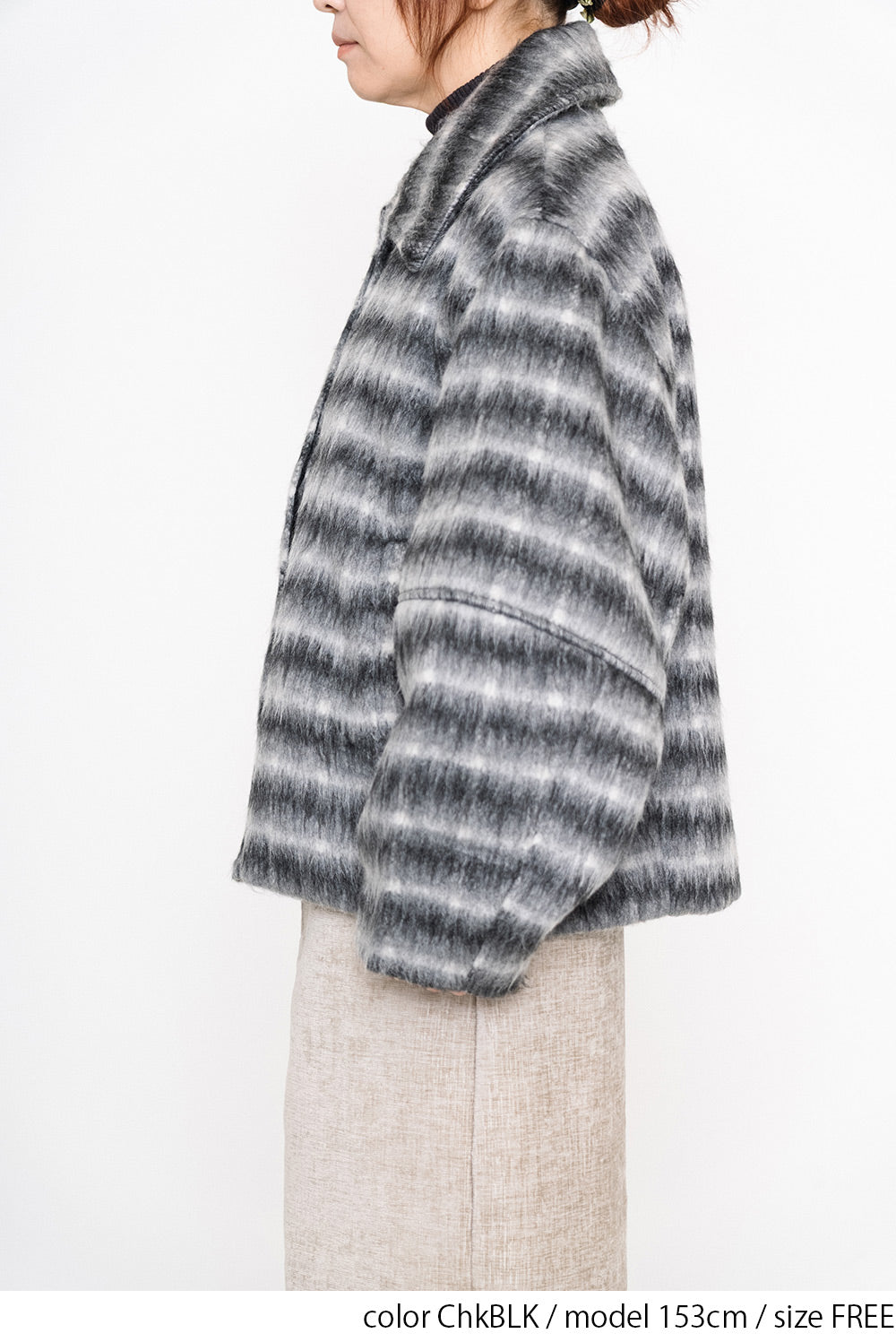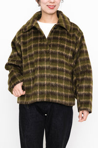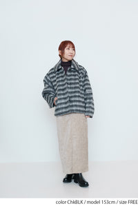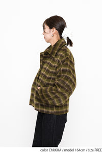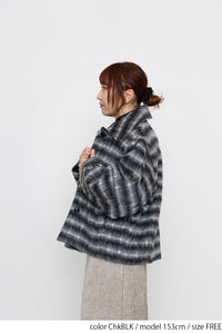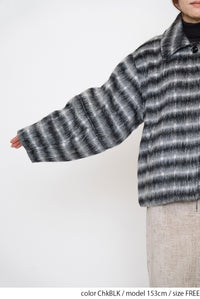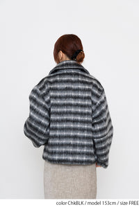 ふんわりとしたチェックシャギー素材が目を惹く、コクーンスリーブジャケット。