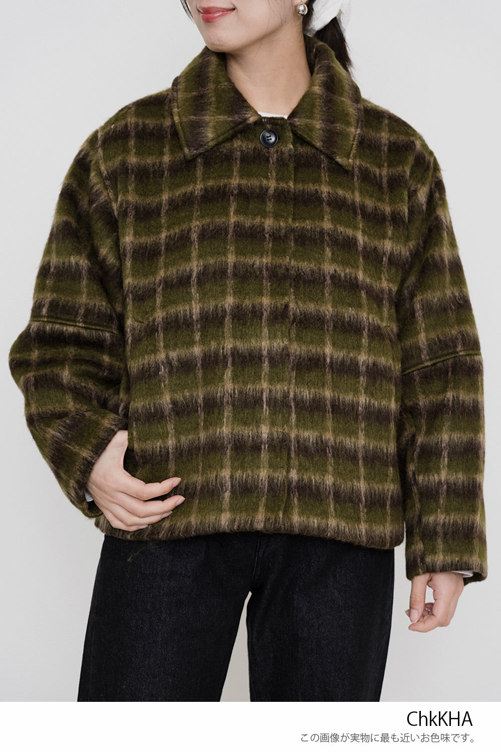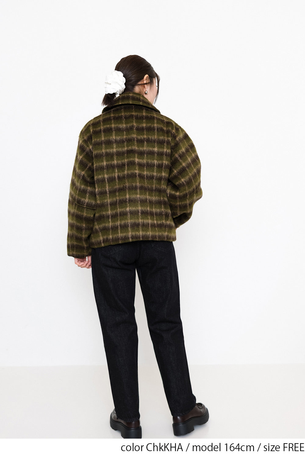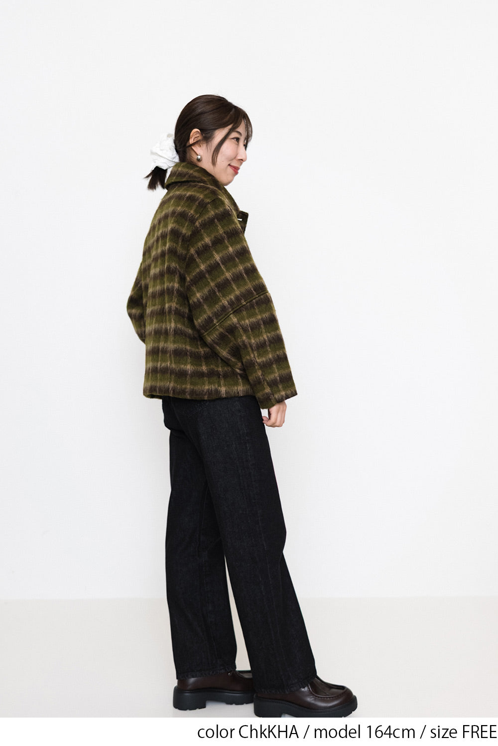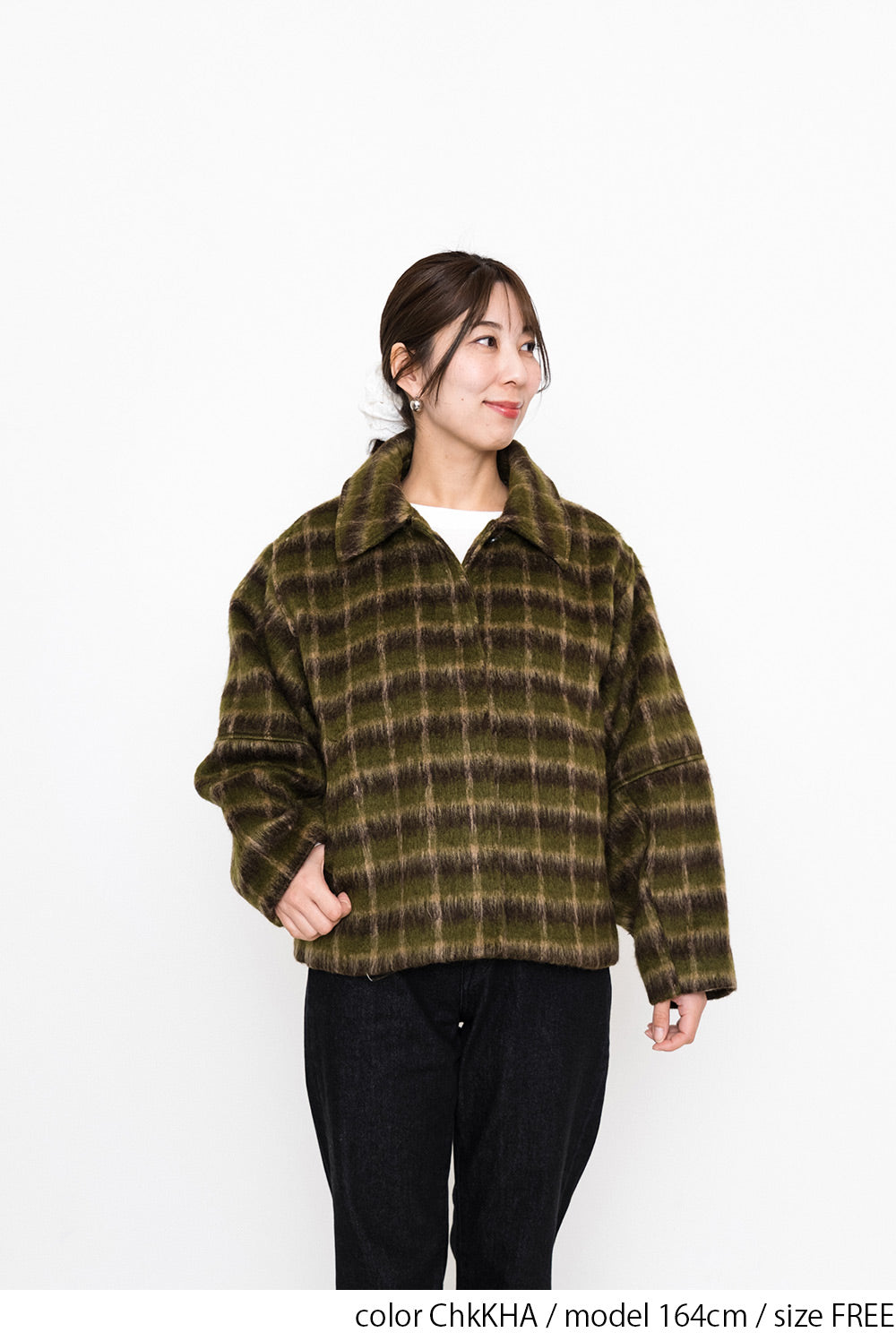 ふんわりとしたチェックシャギー素材が目を惹く、コクーンスリーブジャケット。