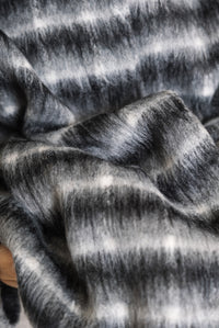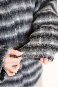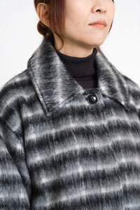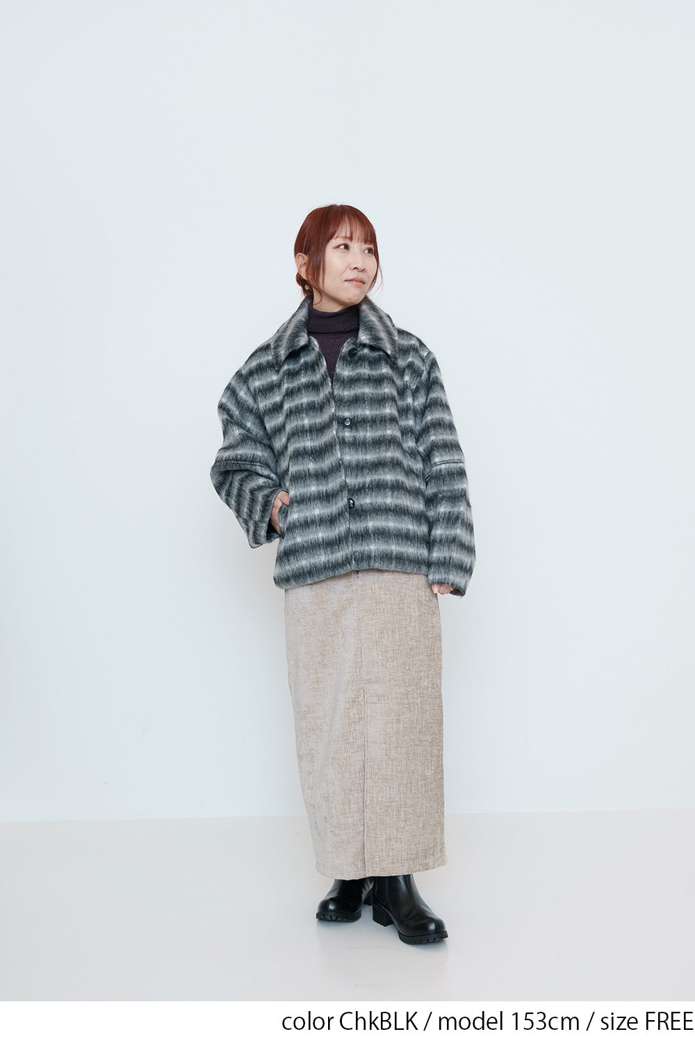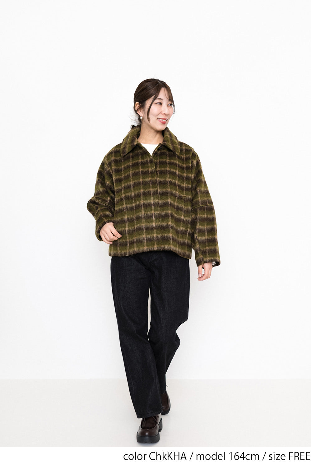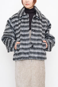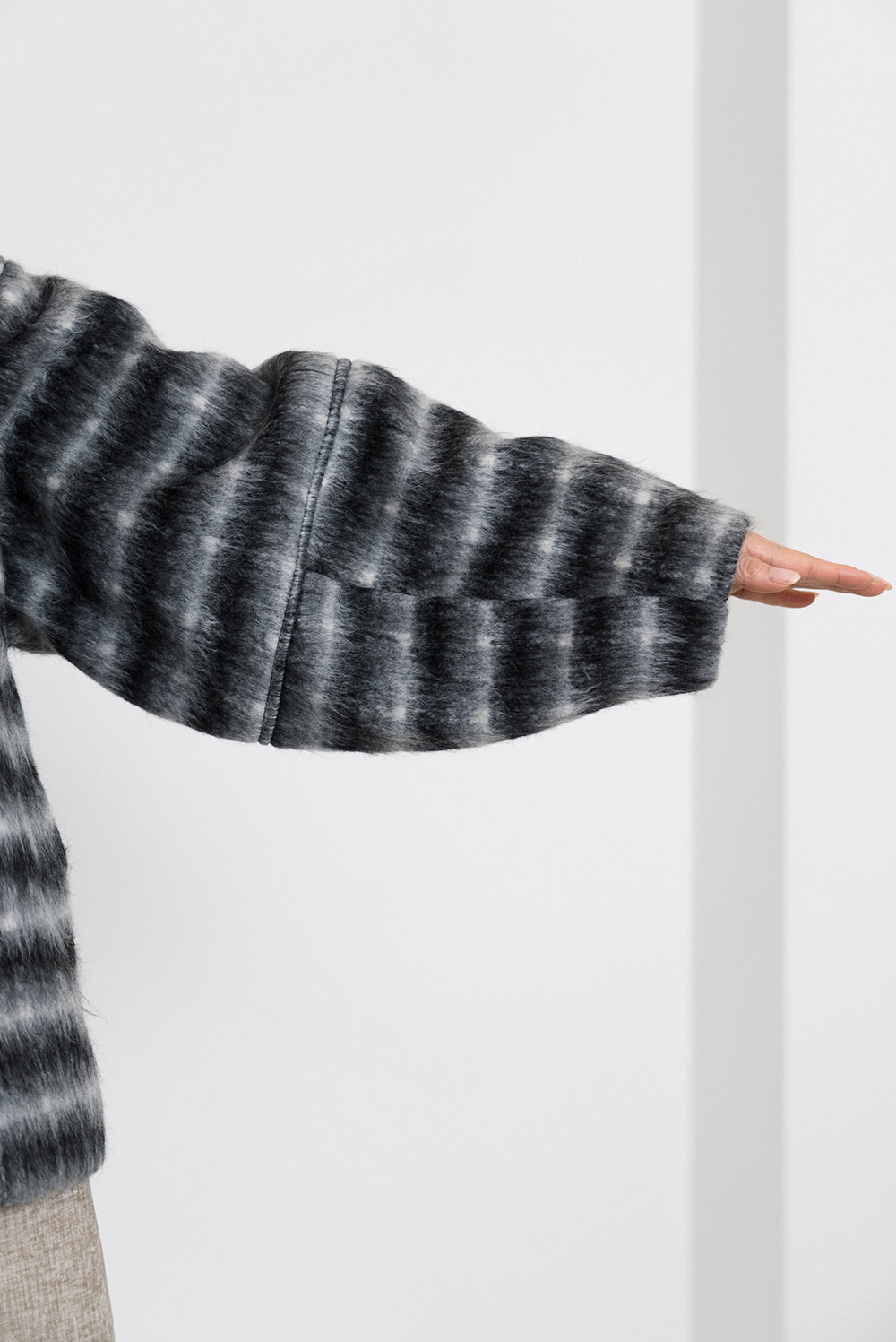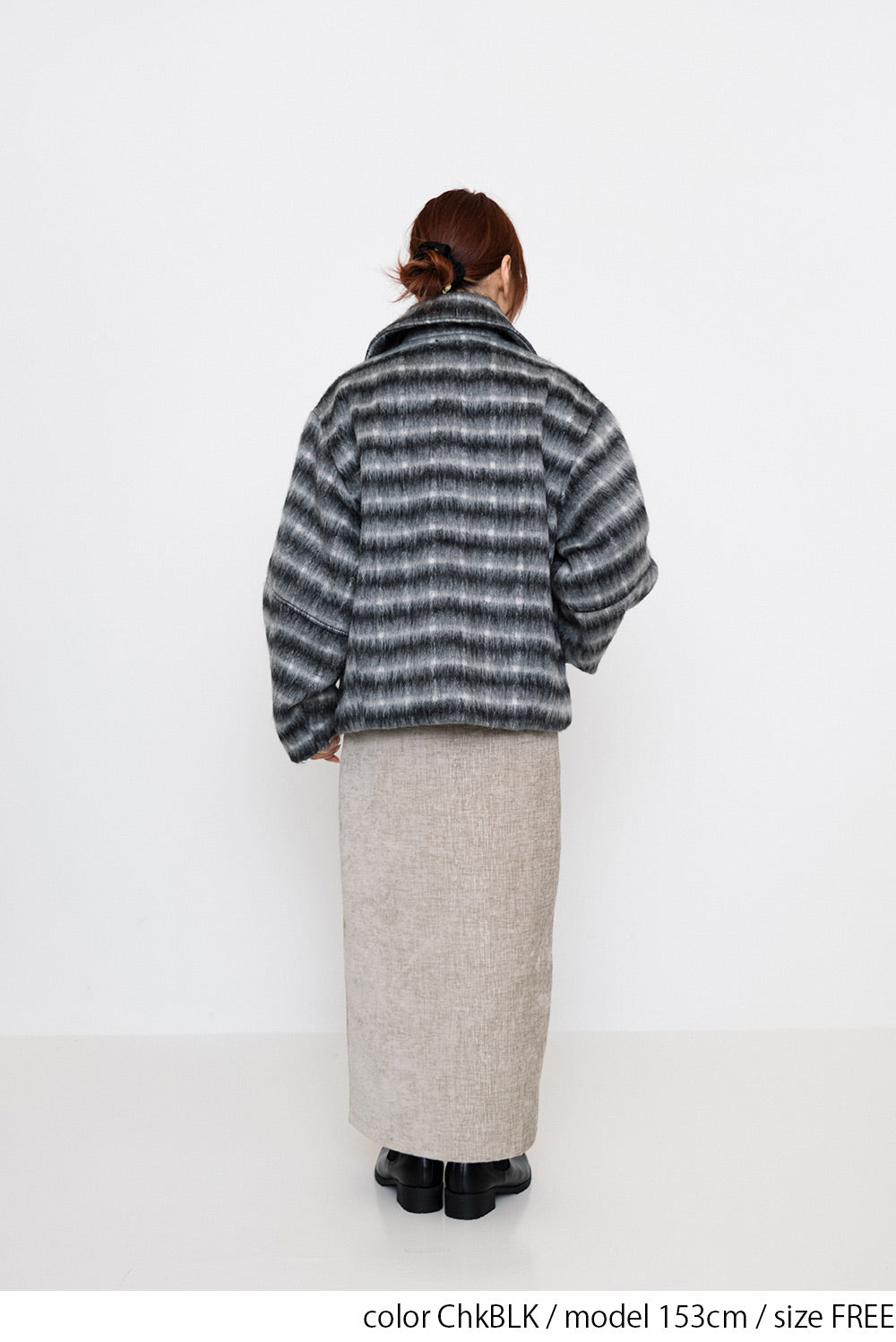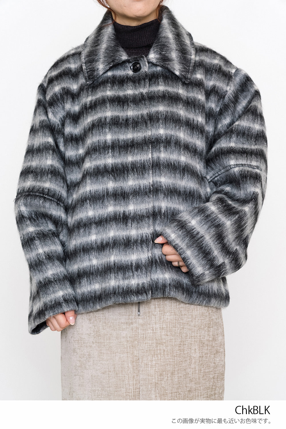 ふんわりとしたチェックシャギー素材が目を惹く、コクーンスリーブジャケット。