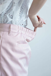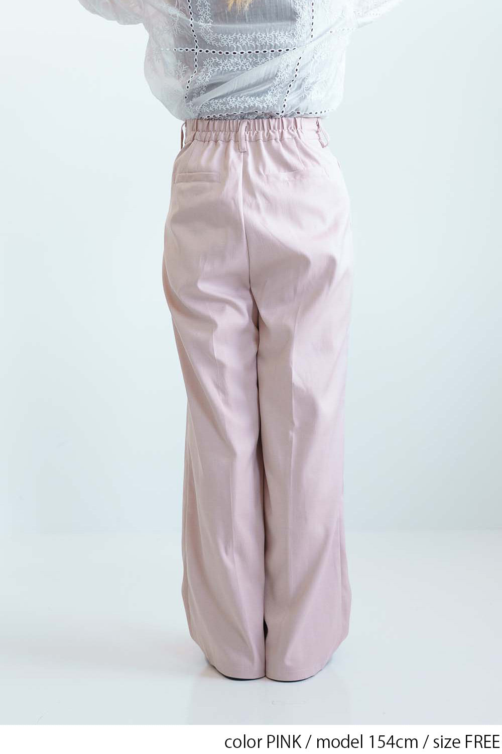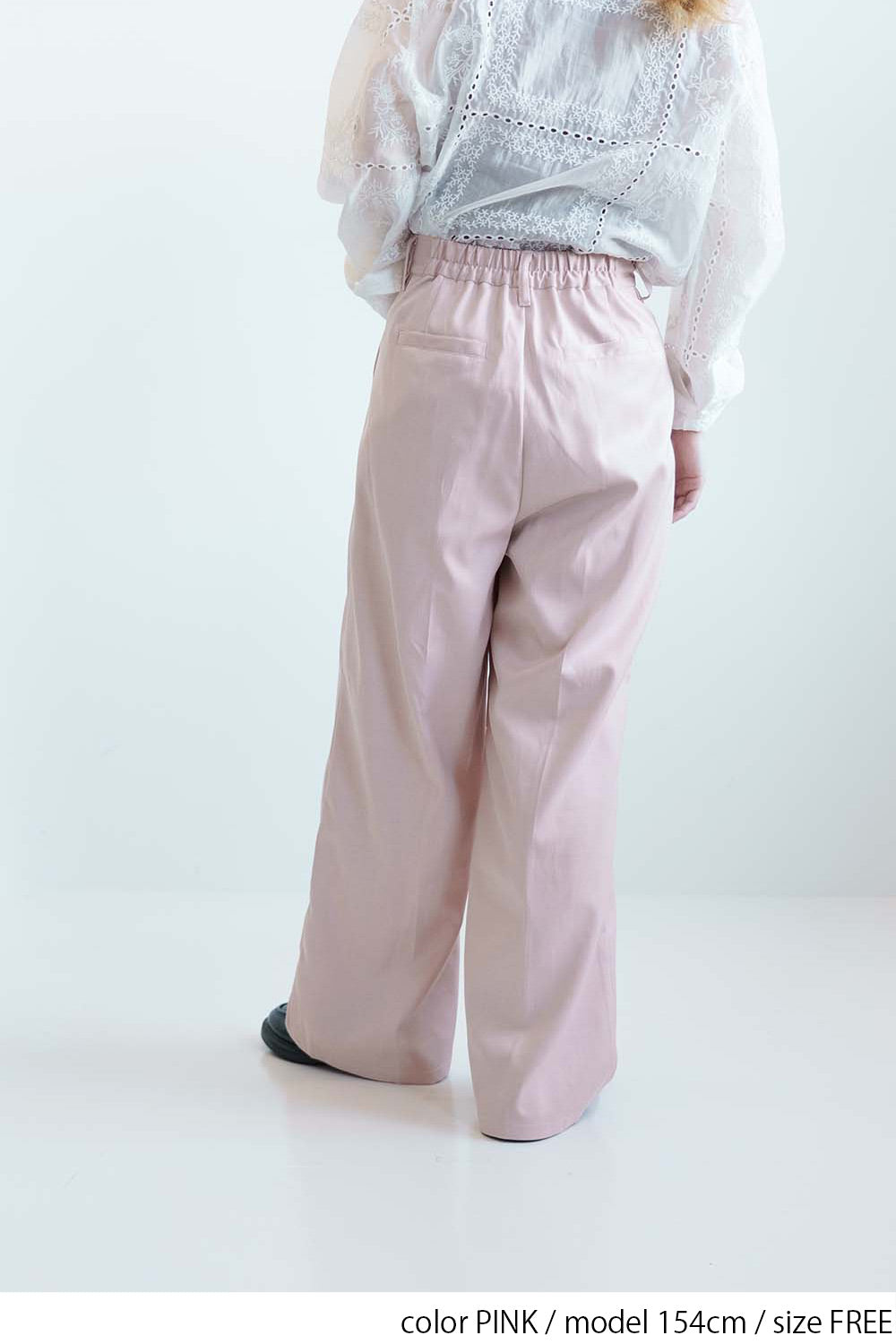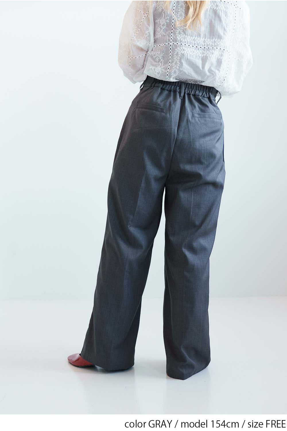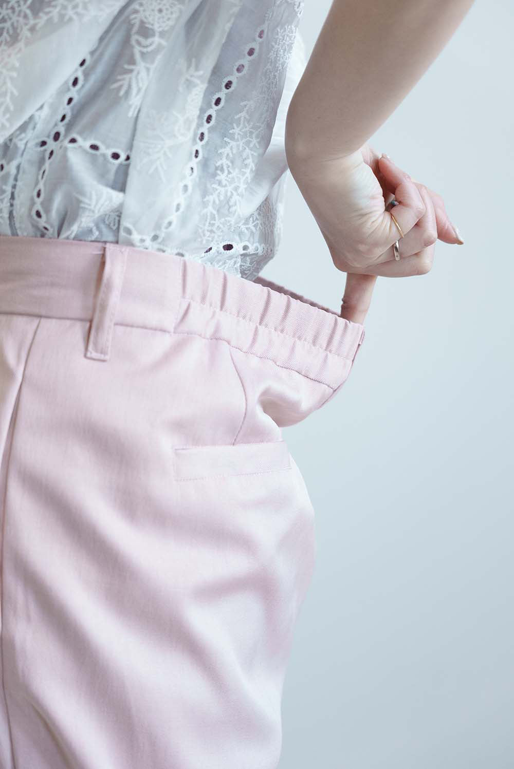 ウエストはフロントをすっきり見せつつ、後ろゴム仕様で快適さも◎。
