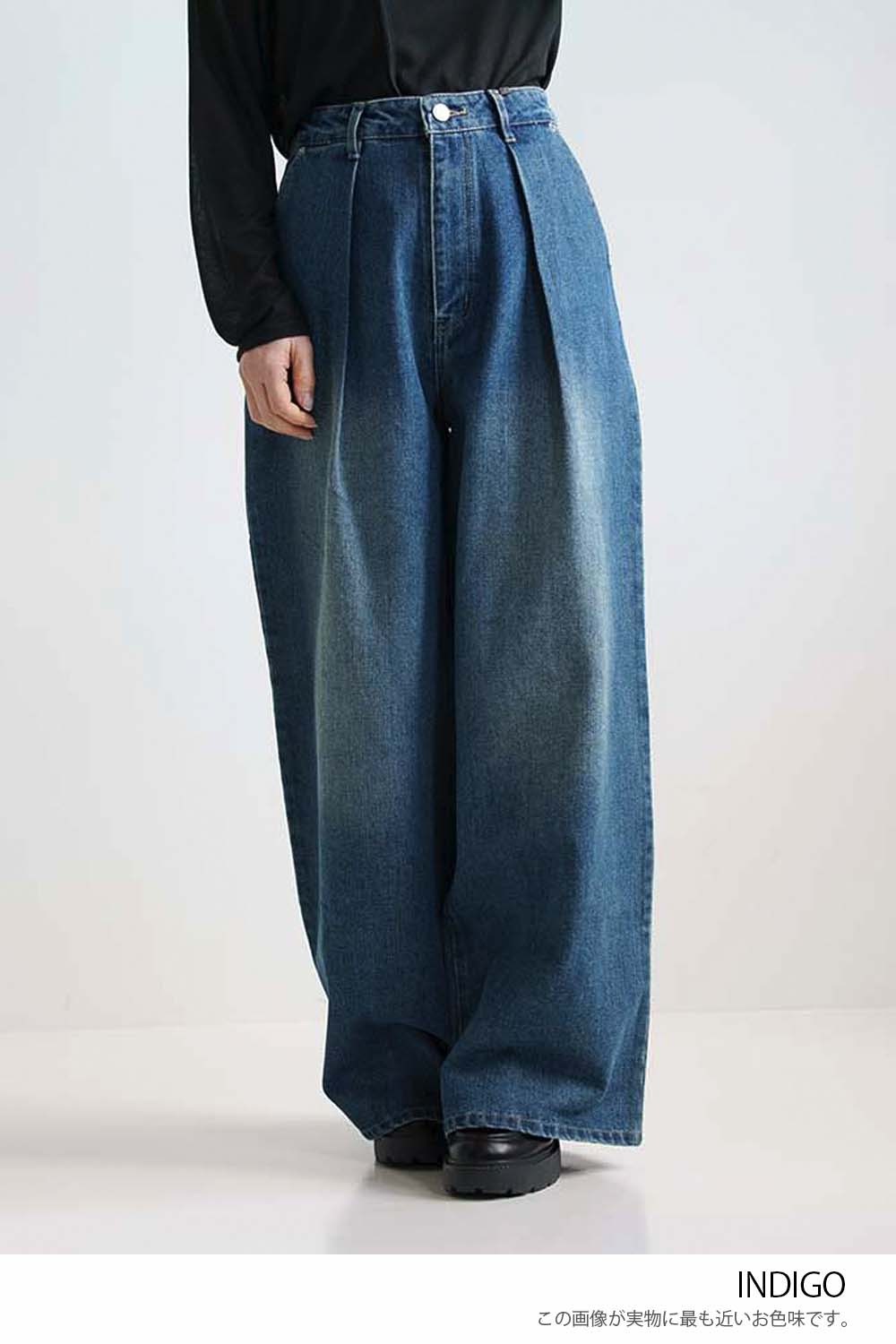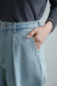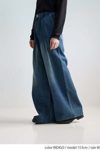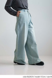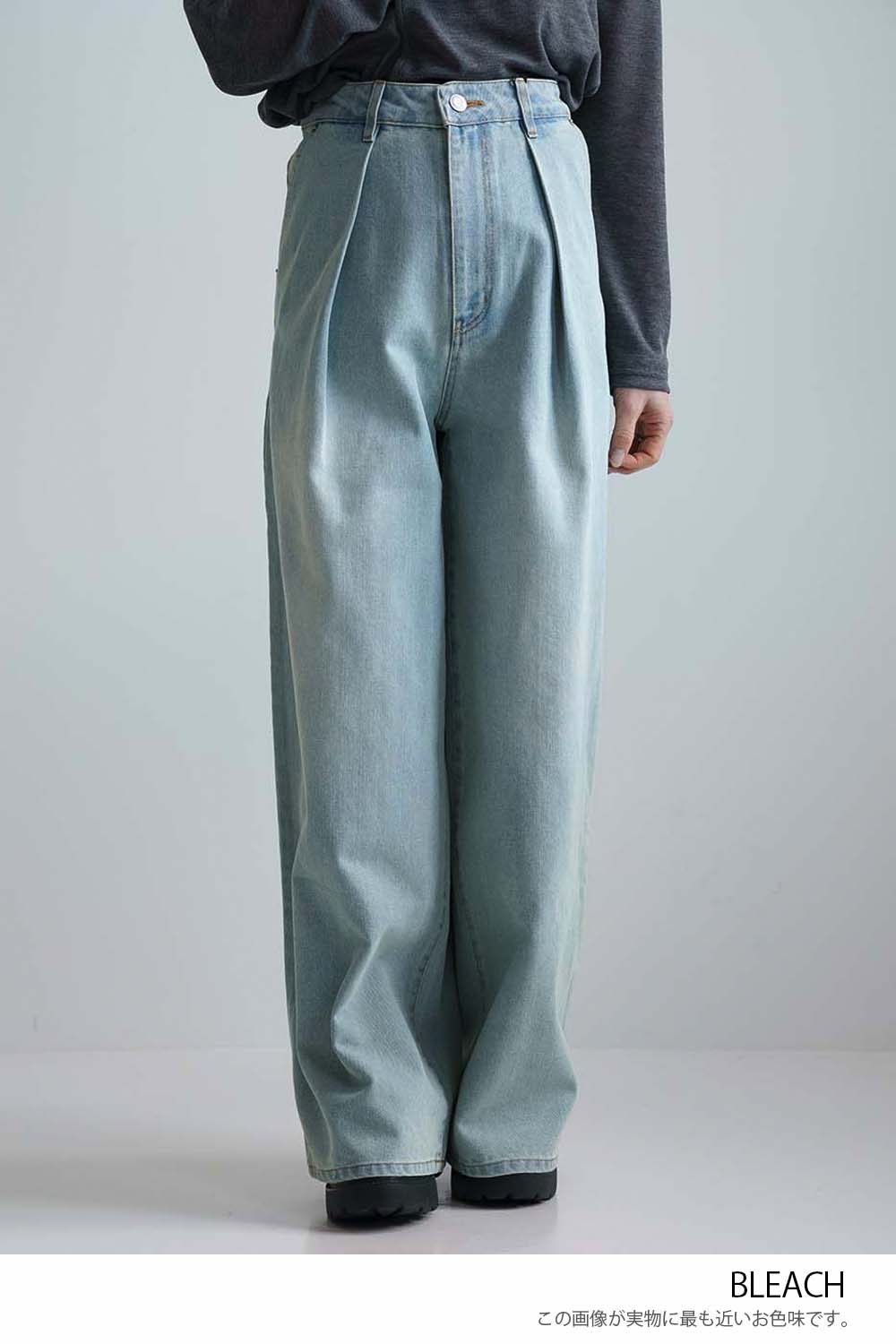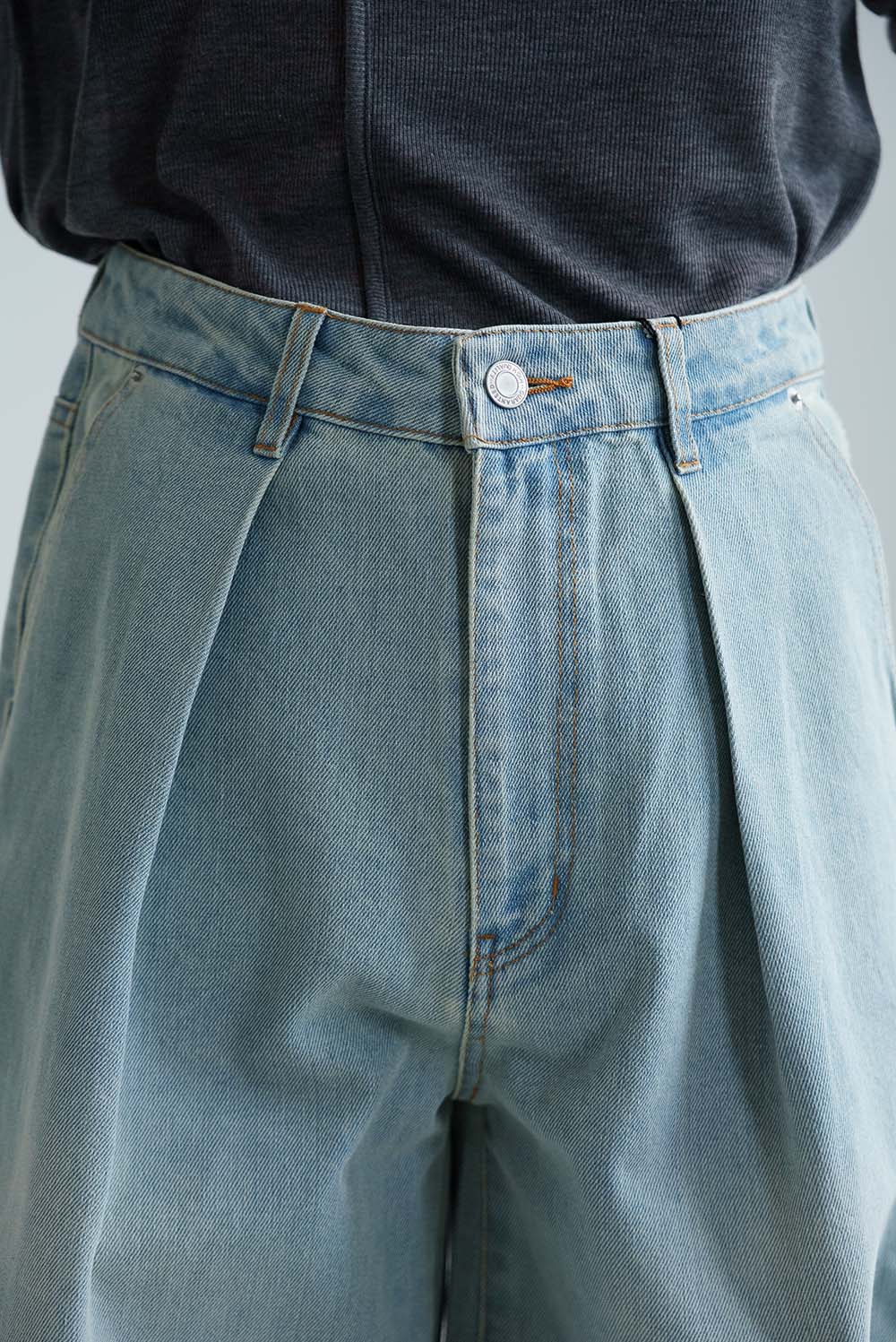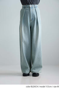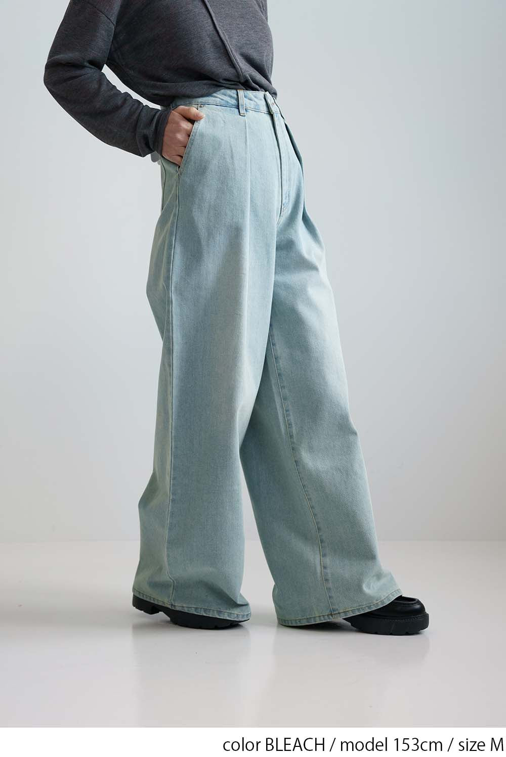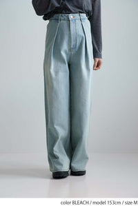 程よい色落ち加工がこなれた印象を演出するデニムタックワイドパンツ。