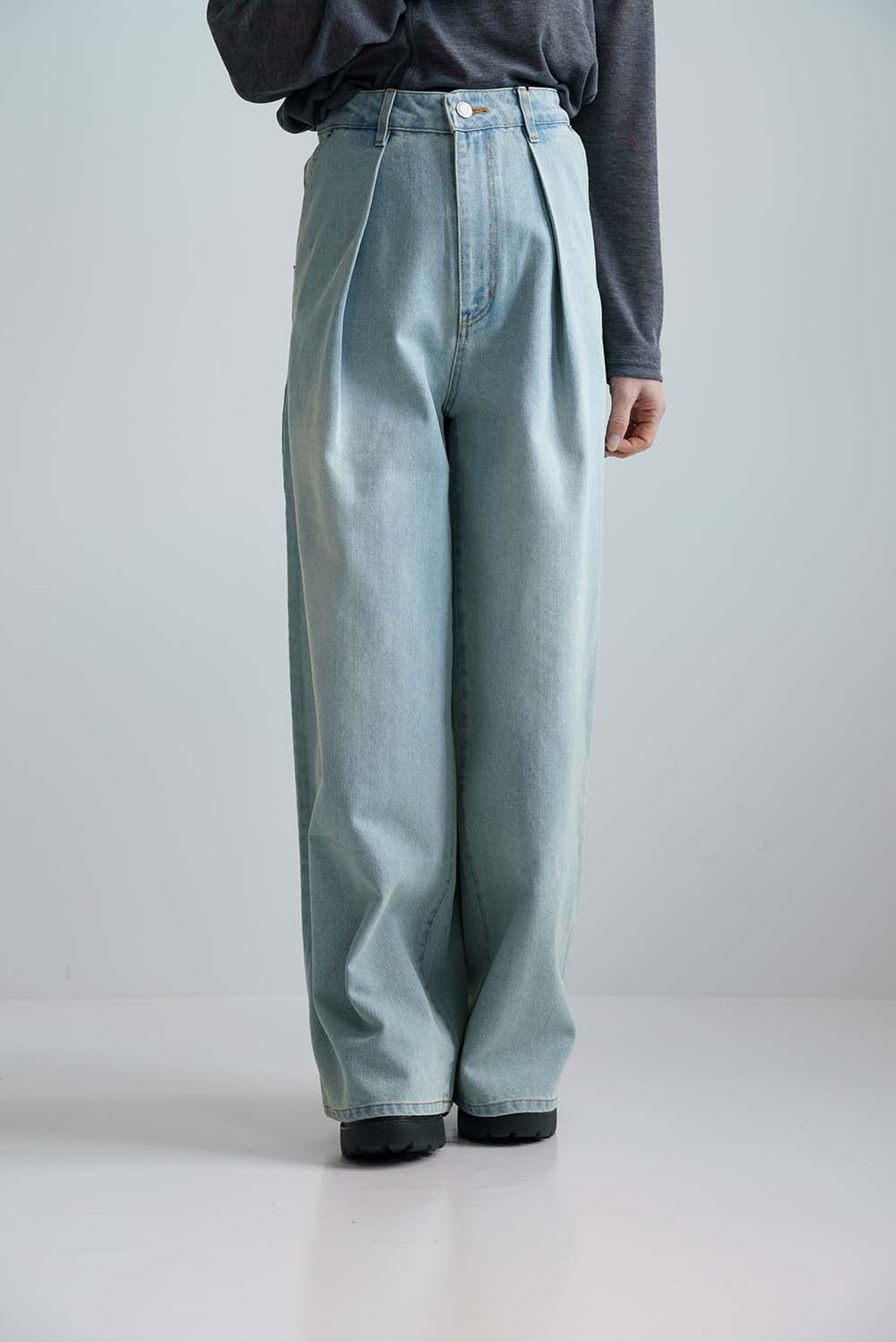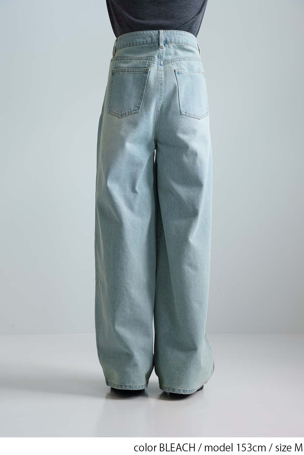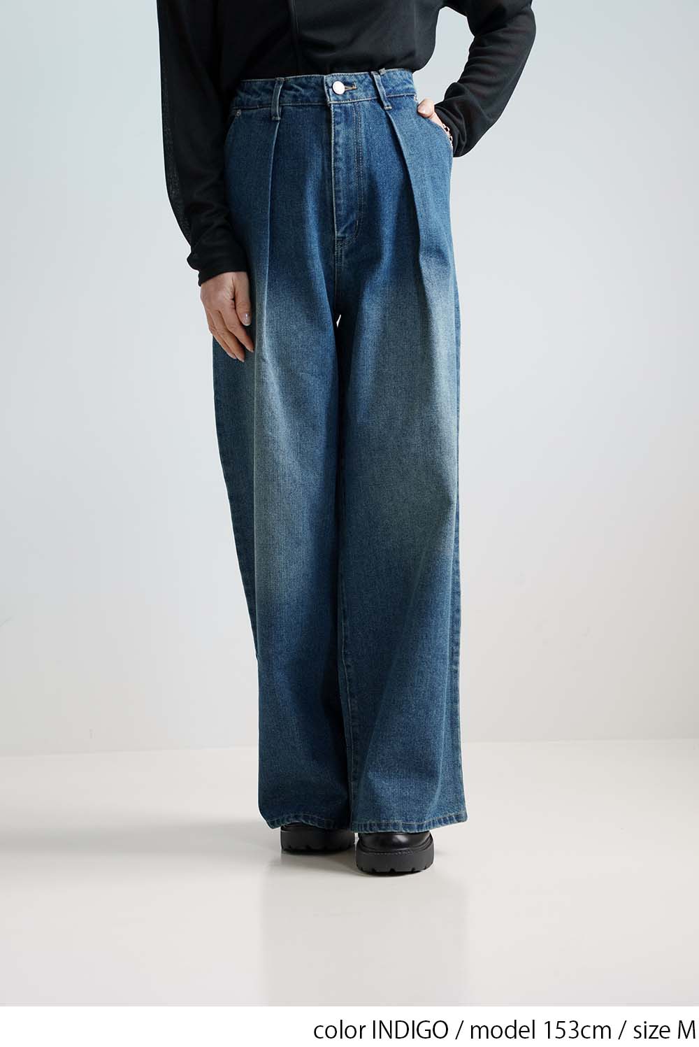 程よい色落ち加工がこなれた印象を演出するデニムタックワイドパンツ。
