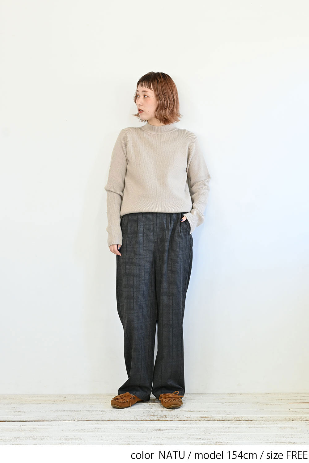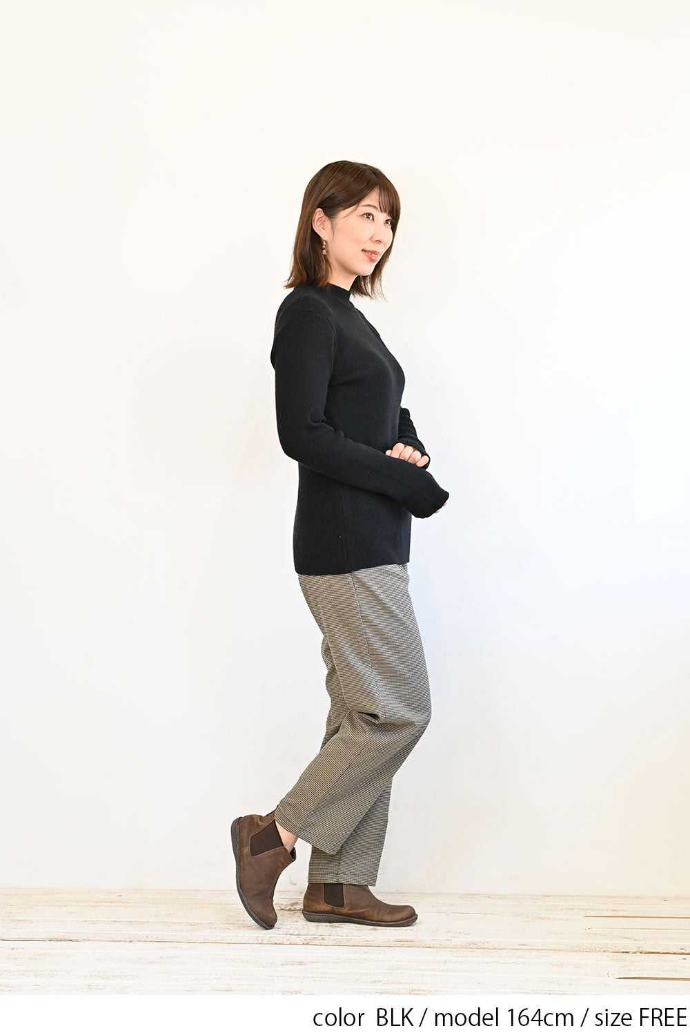 首元は暖かさと上品さを兼ね備えたプチハイネックでスッキリと、